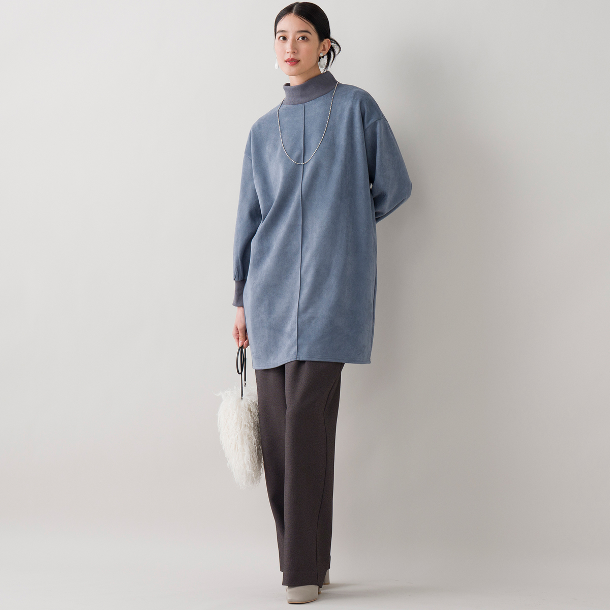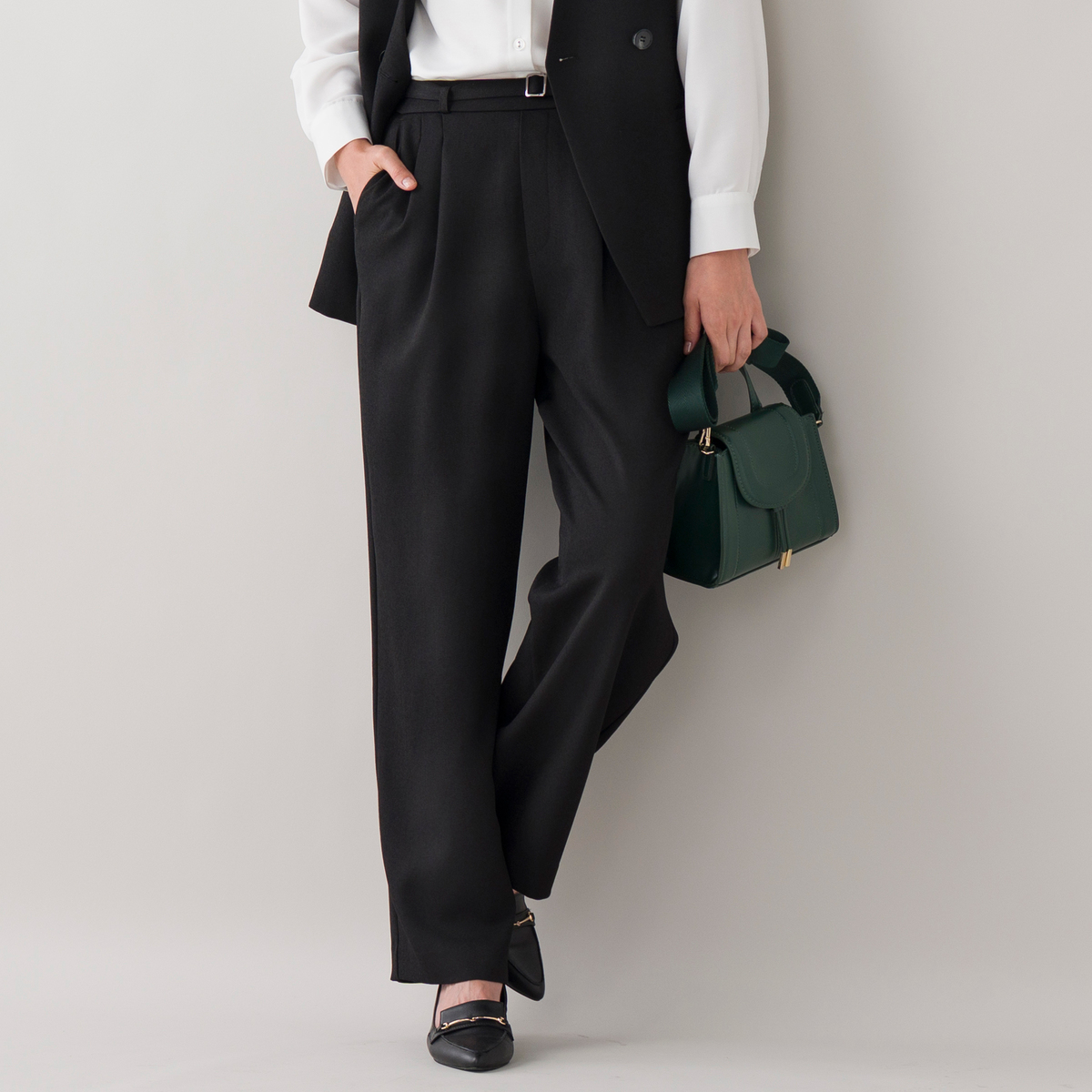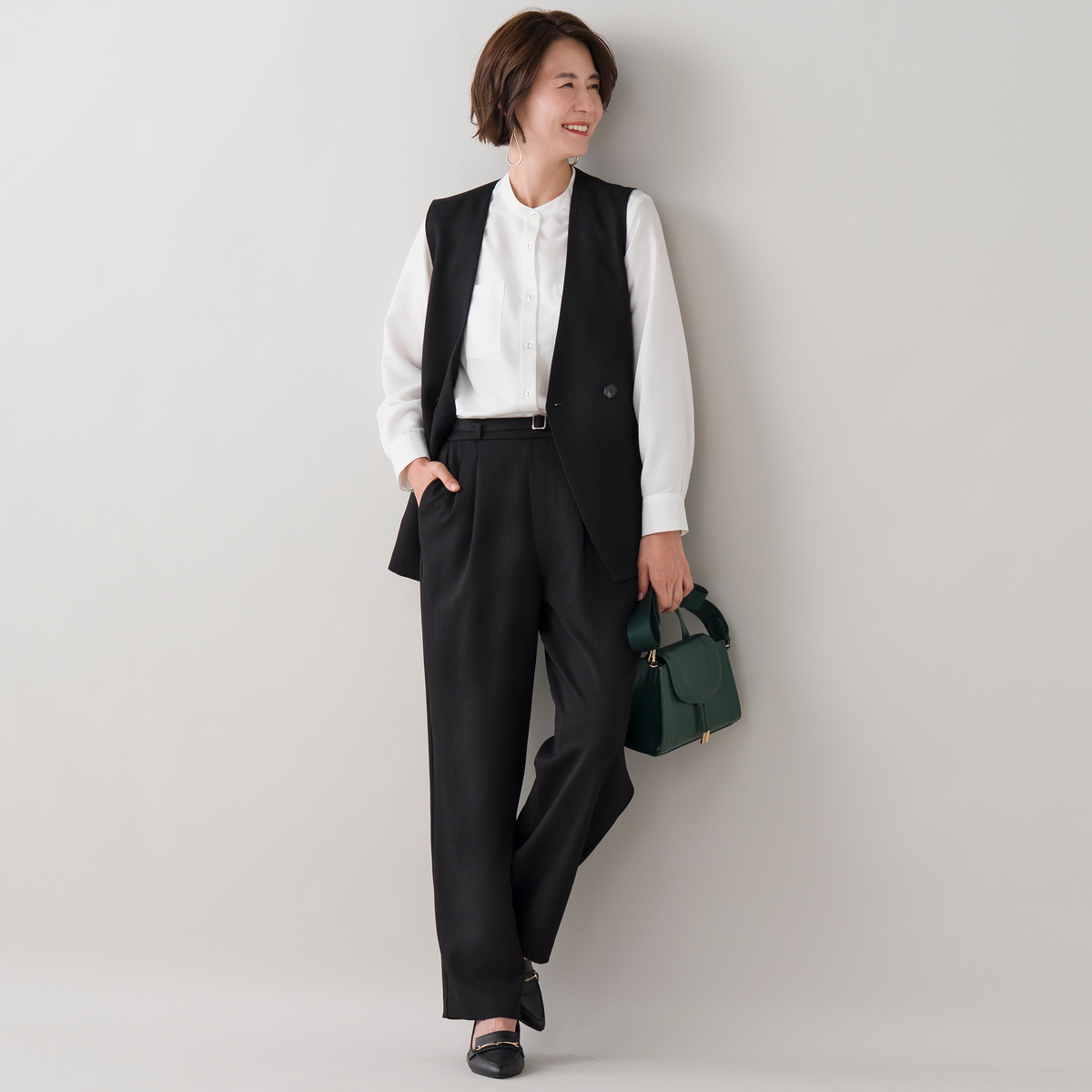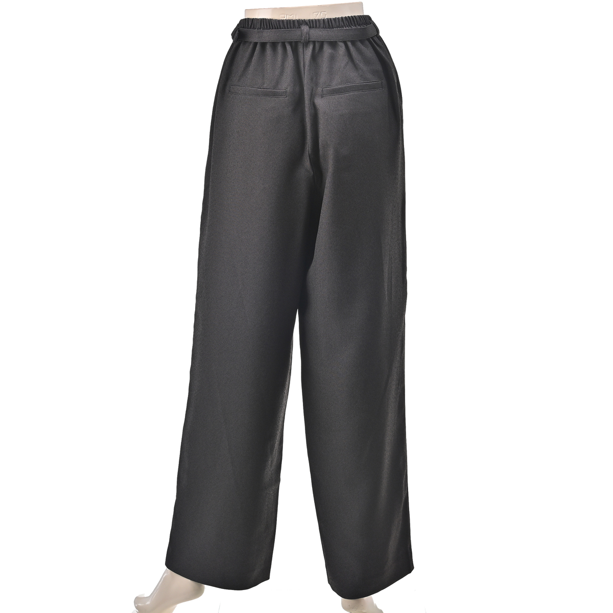 ポリエステル素材に梳毛調のシャークスキン織りを施し杢調に見える(*1)ワイドパンツ。ウエストの後ろ全体にはゴムギャザーを配し、引っ張って穿けるプルオン仕様。前中心はダミー開きのファスナーがないフラットな仕上がりで、すっきり見えに。さらにフロントの2タックが体型カバーを叶えます