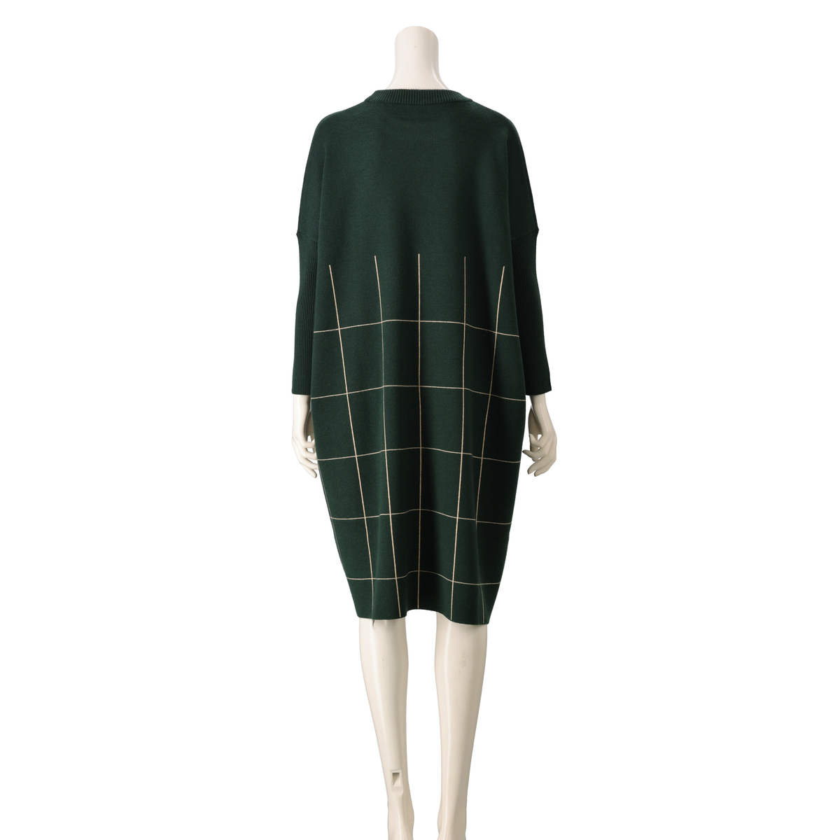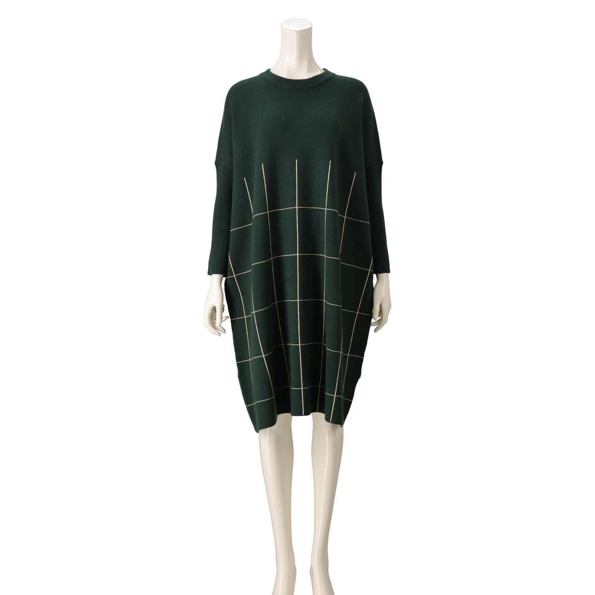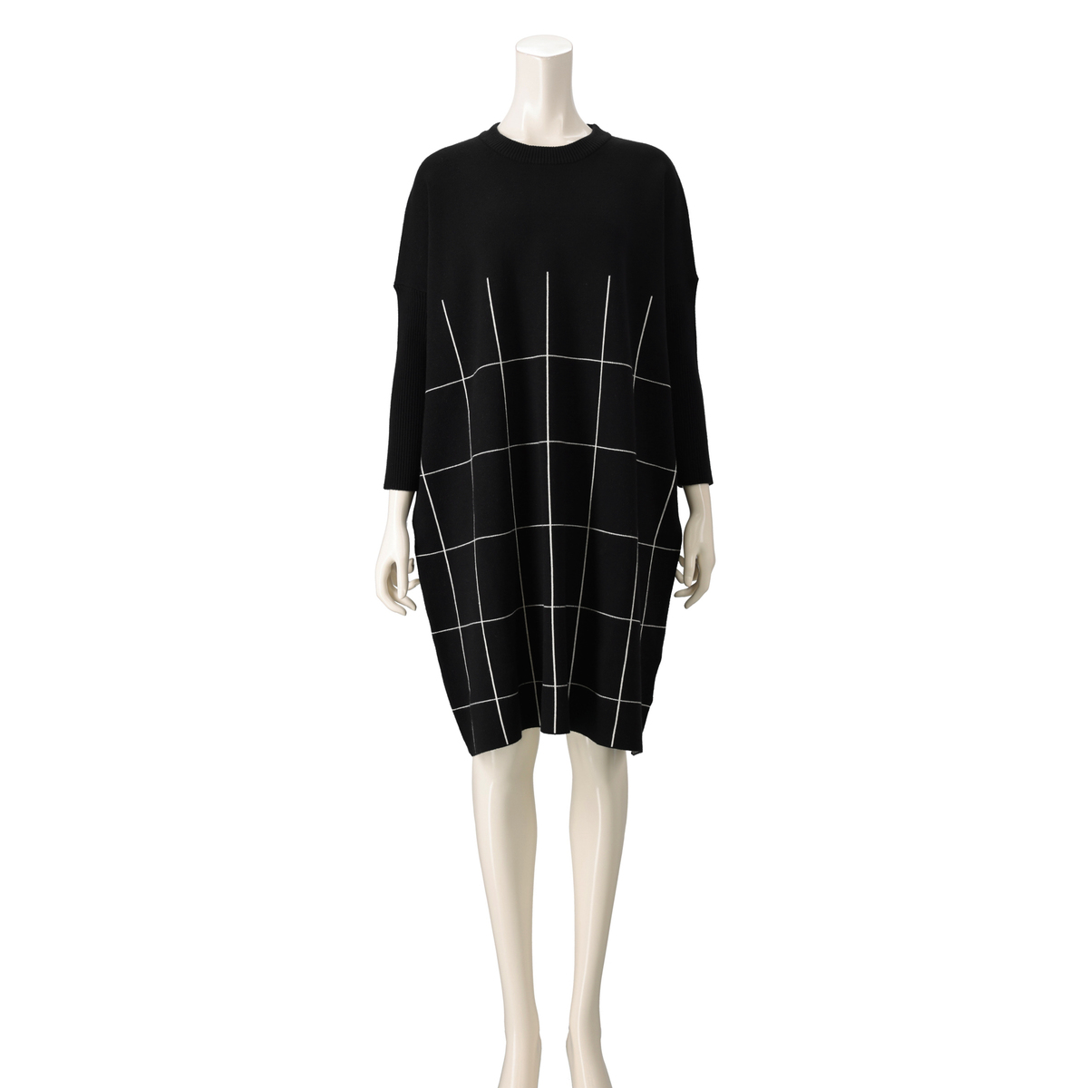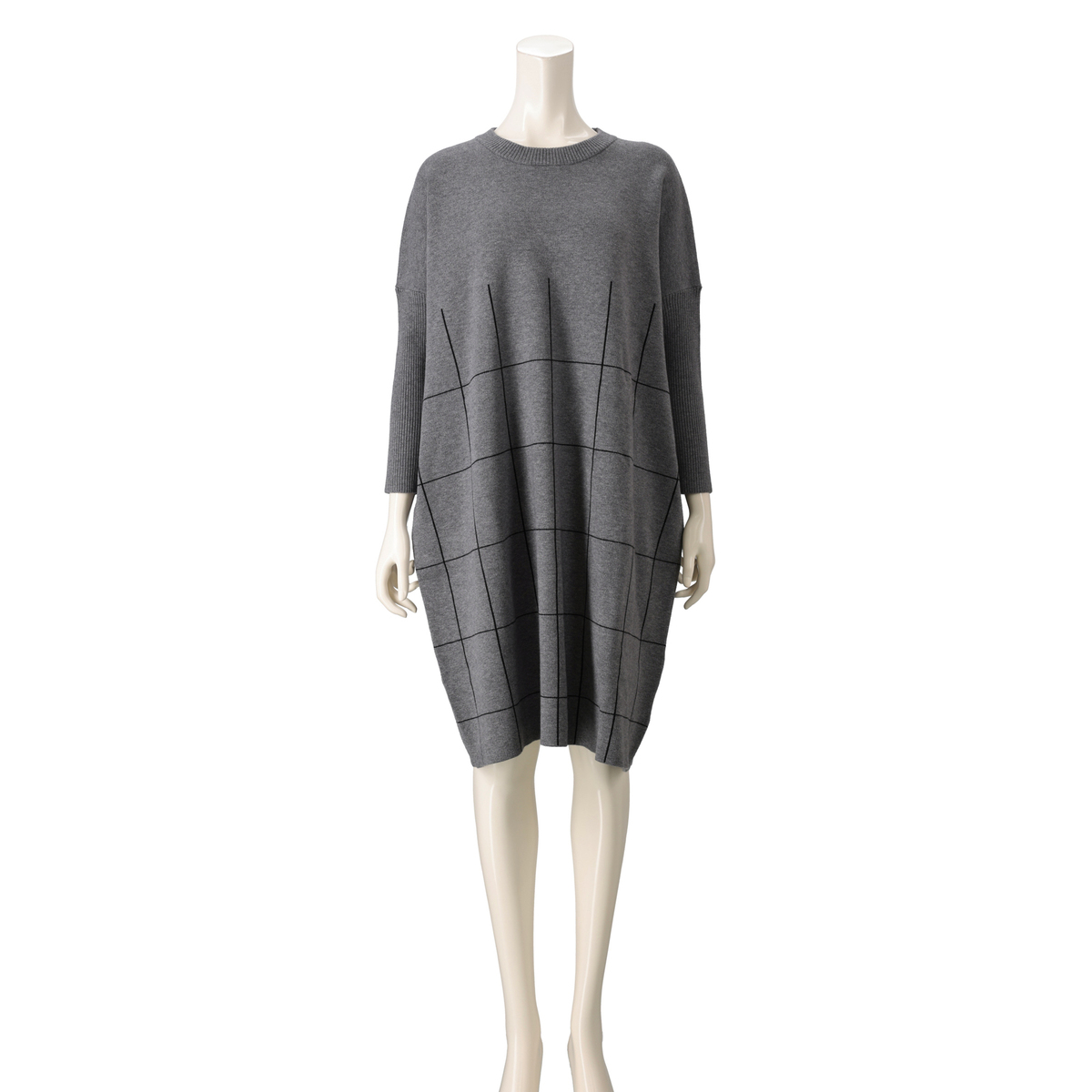 上品なウィンドウペン柄のニットワンピース。しっかりとしたダブルジャガードの編地で高級感のあるアイテムです