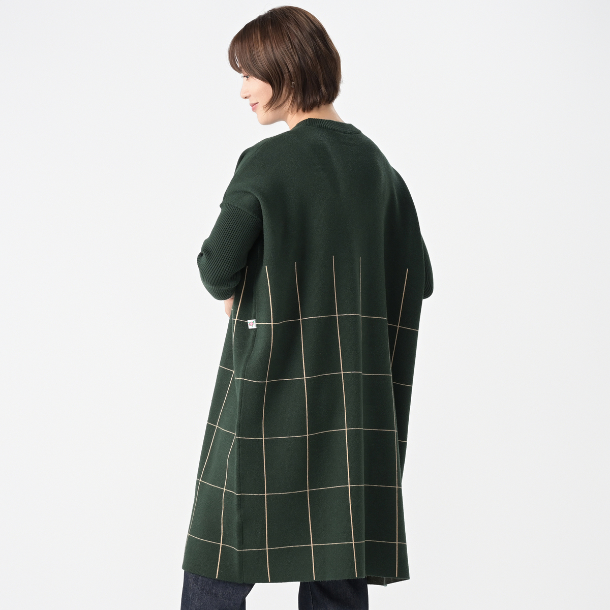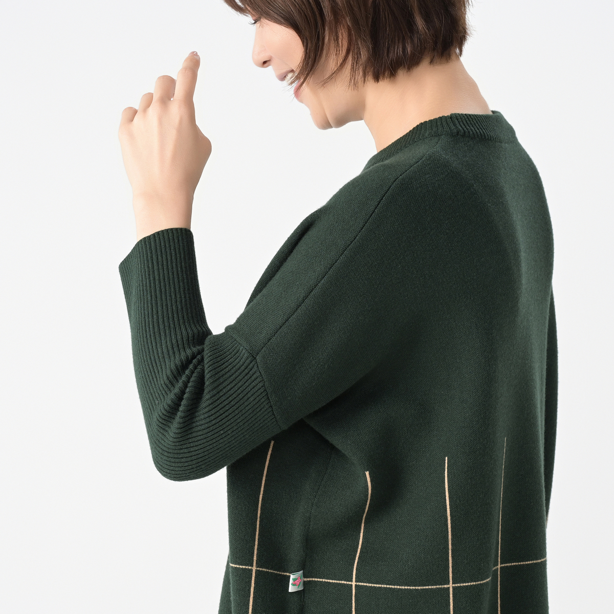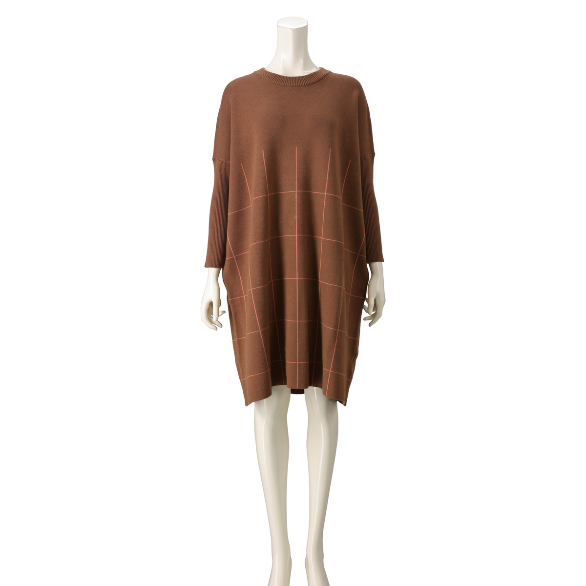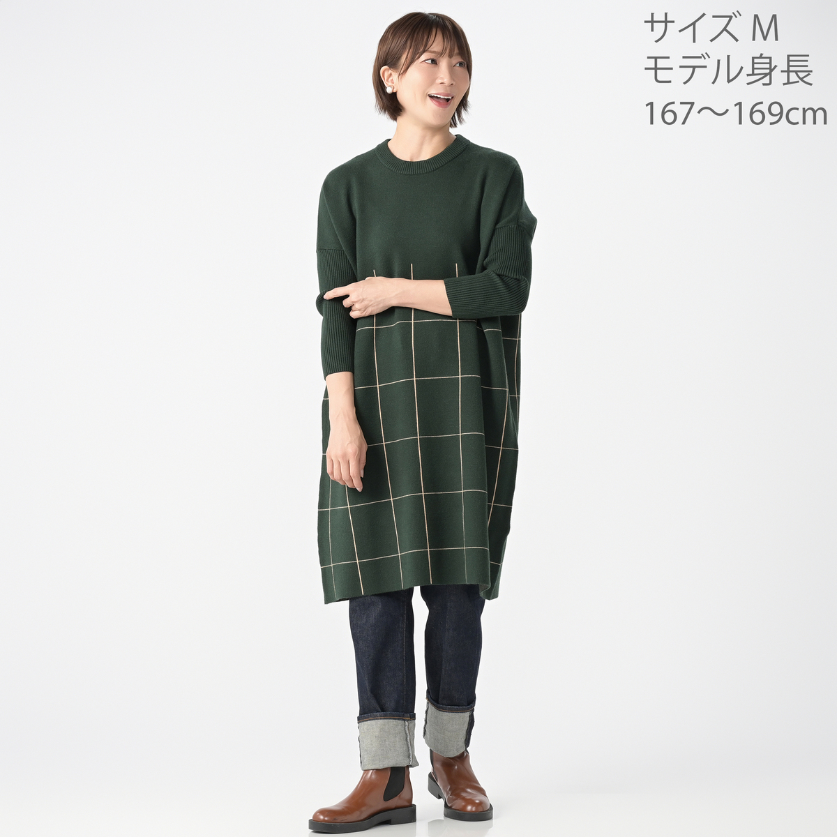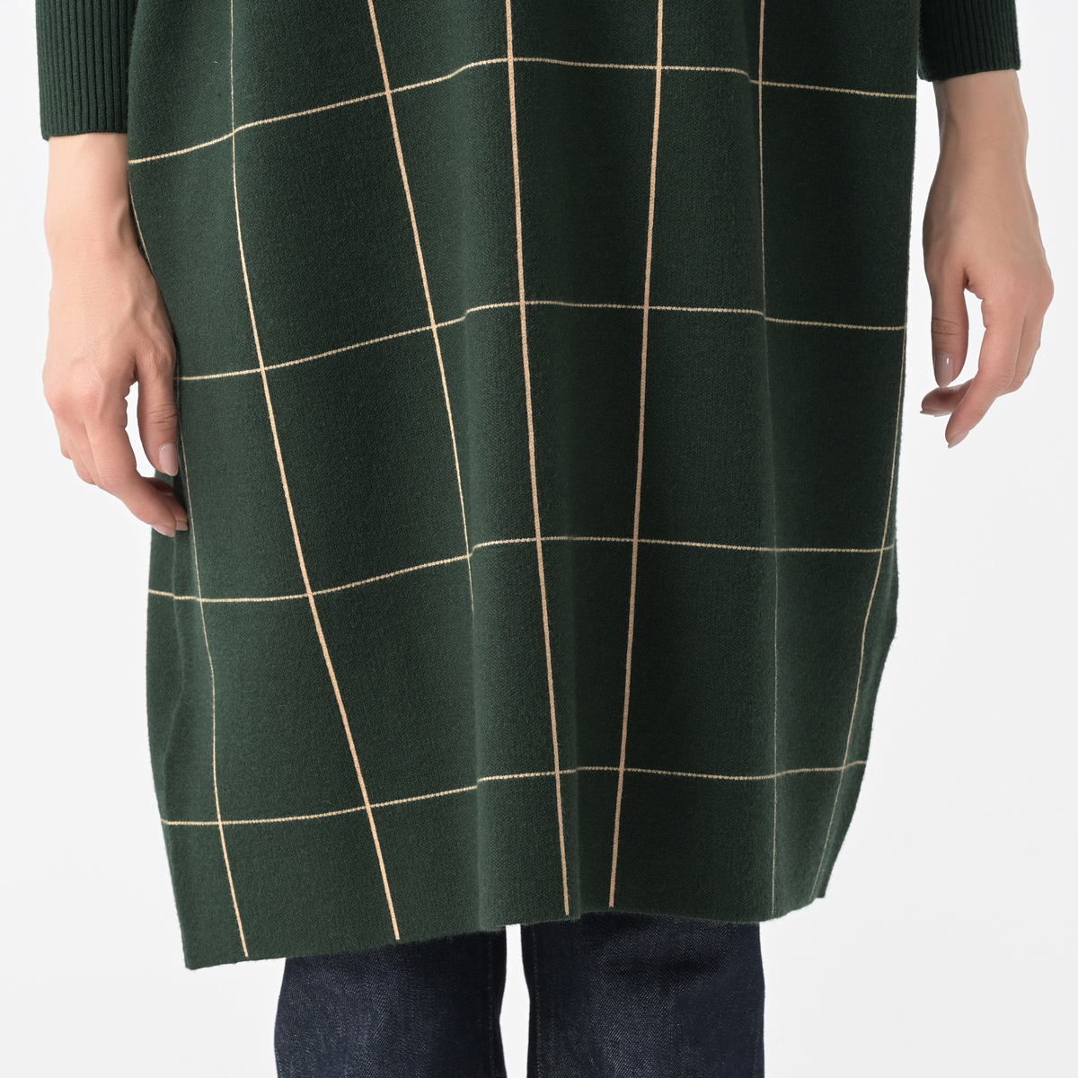 上品なウィンドウペン柄のニットワンピース。しっかりとしたダブルジャガードの編地で高級感のあるアイテムです