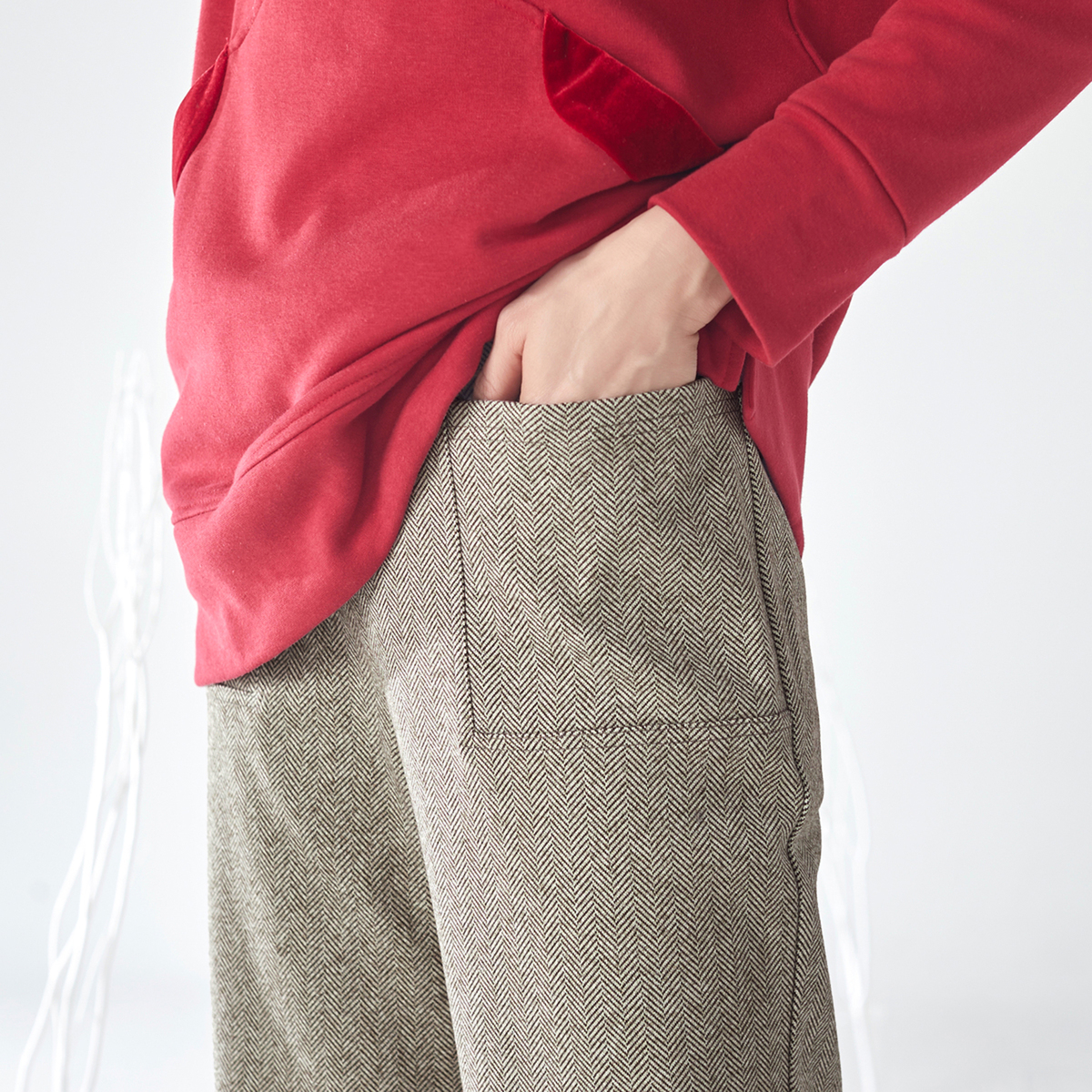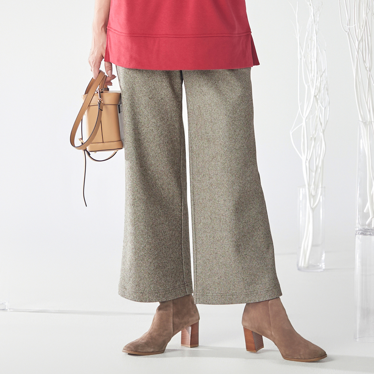 ヘリンボーン柄の素材に高級感が漂うセミワイドパンツ。さまざまなトップスと合わせやすく、日常のコーディネートに取り入れやすい一着です