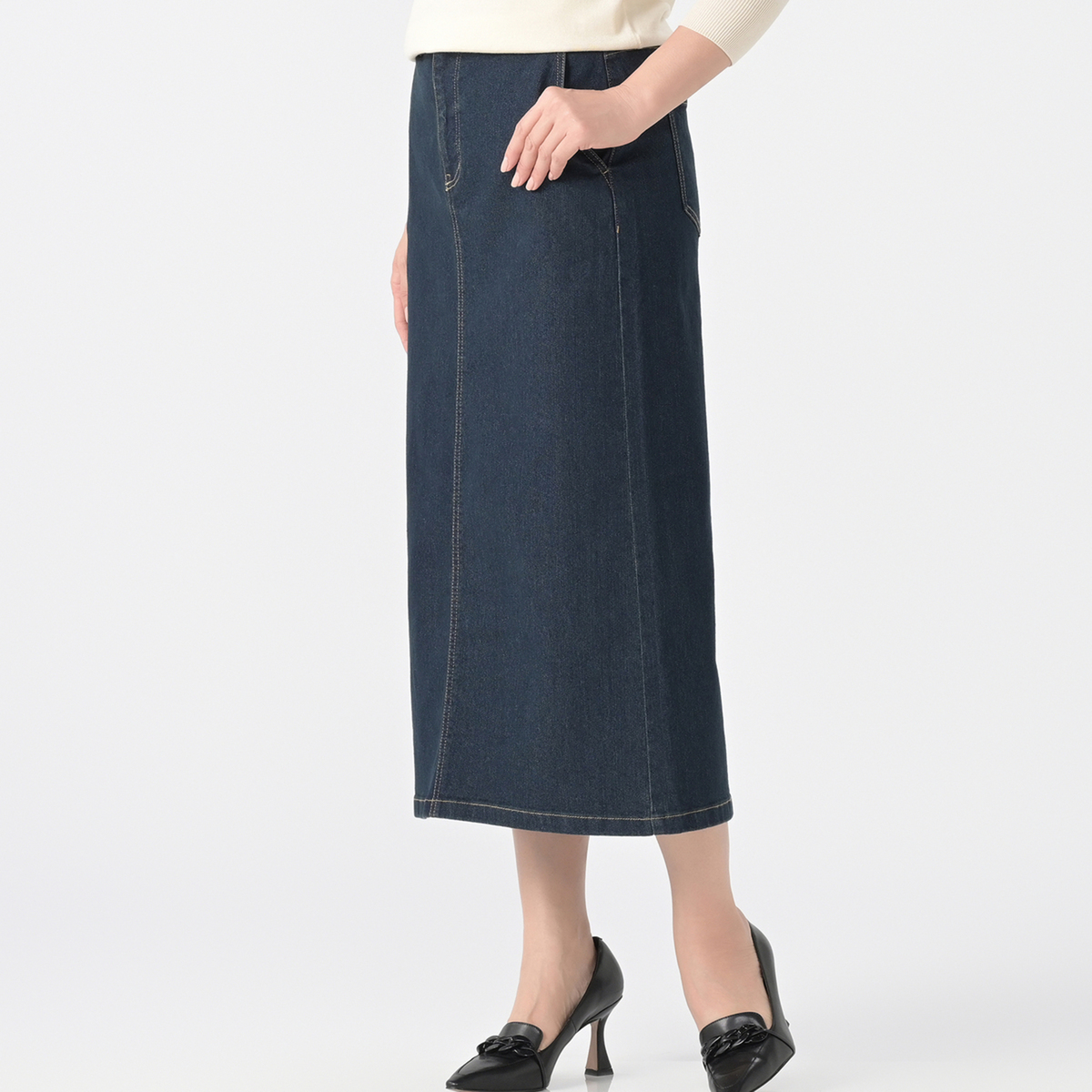 ヨコストレッチの効いたスラブ入りデニム素材を使用したスカート。体の動きに合わせてしなやかに伸びる楽々素材を使用しています