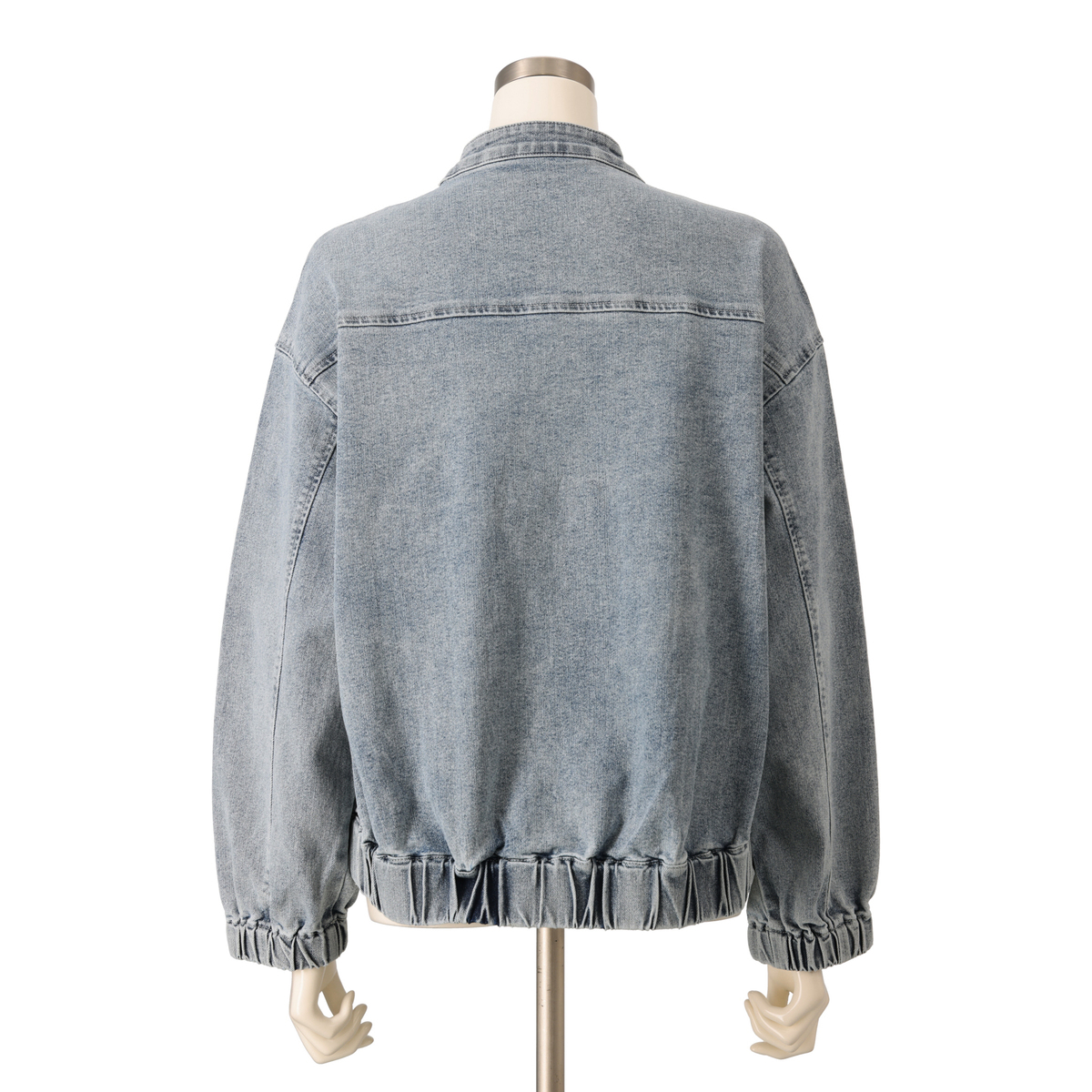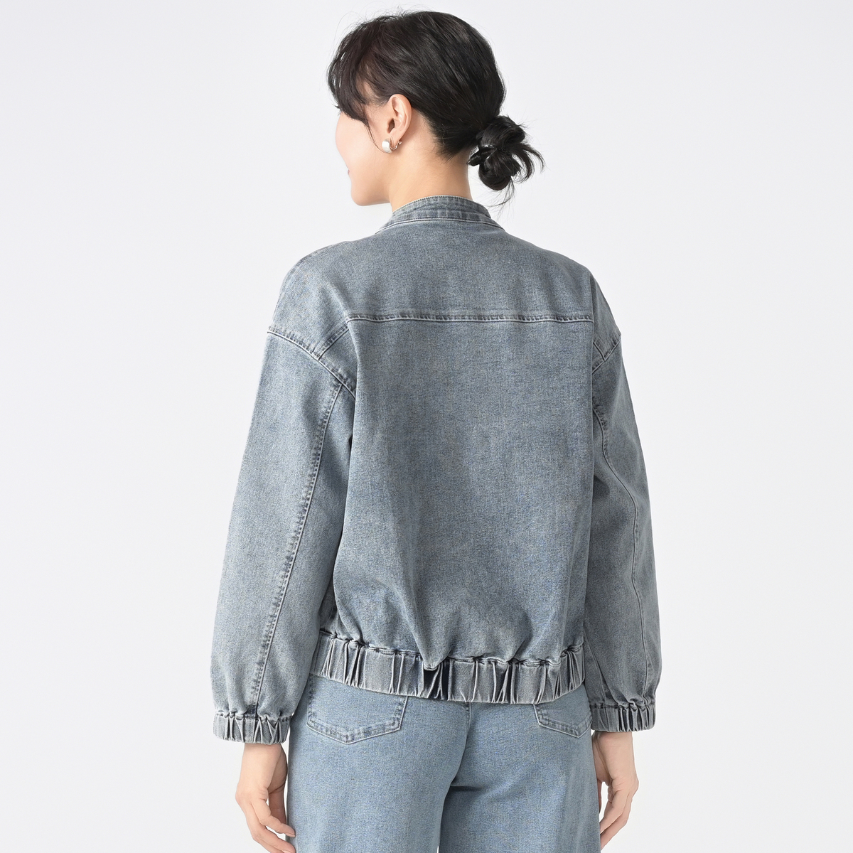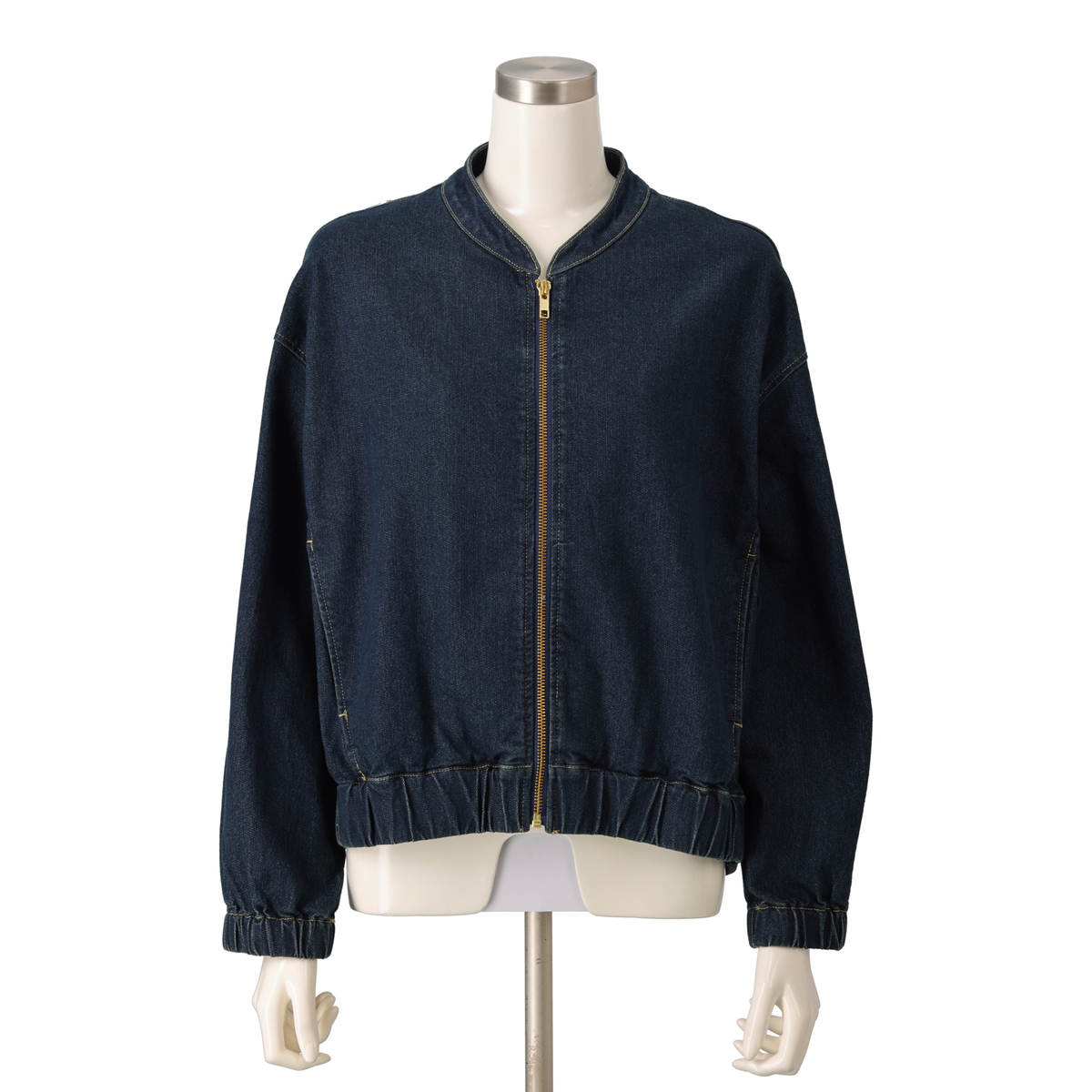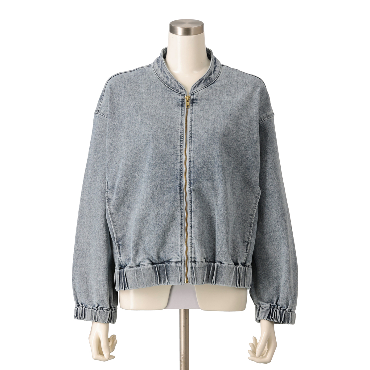 ゆったりとしたシルエットのジップアップデニムジャケット。袖口と裾にゴムギャザーを入れ、丸みのあるデザインに仕上げました。前身頃の切替部分には便利なポケット付きです