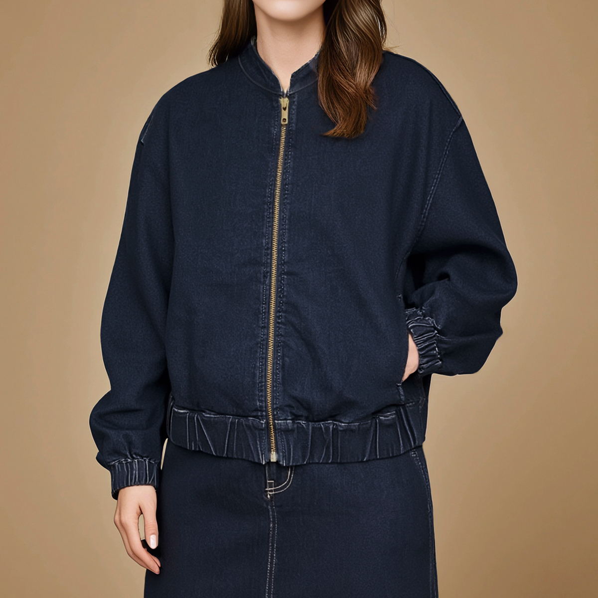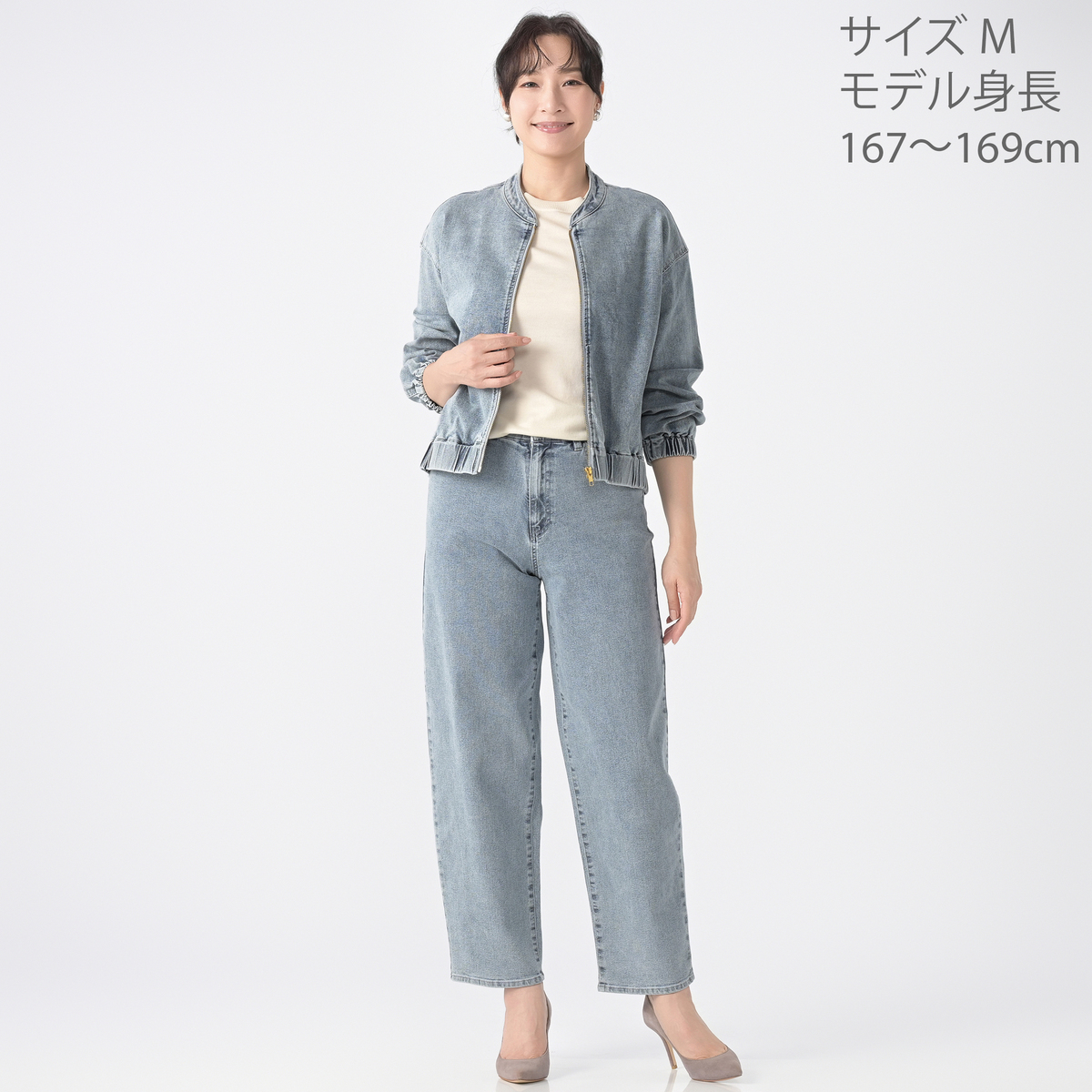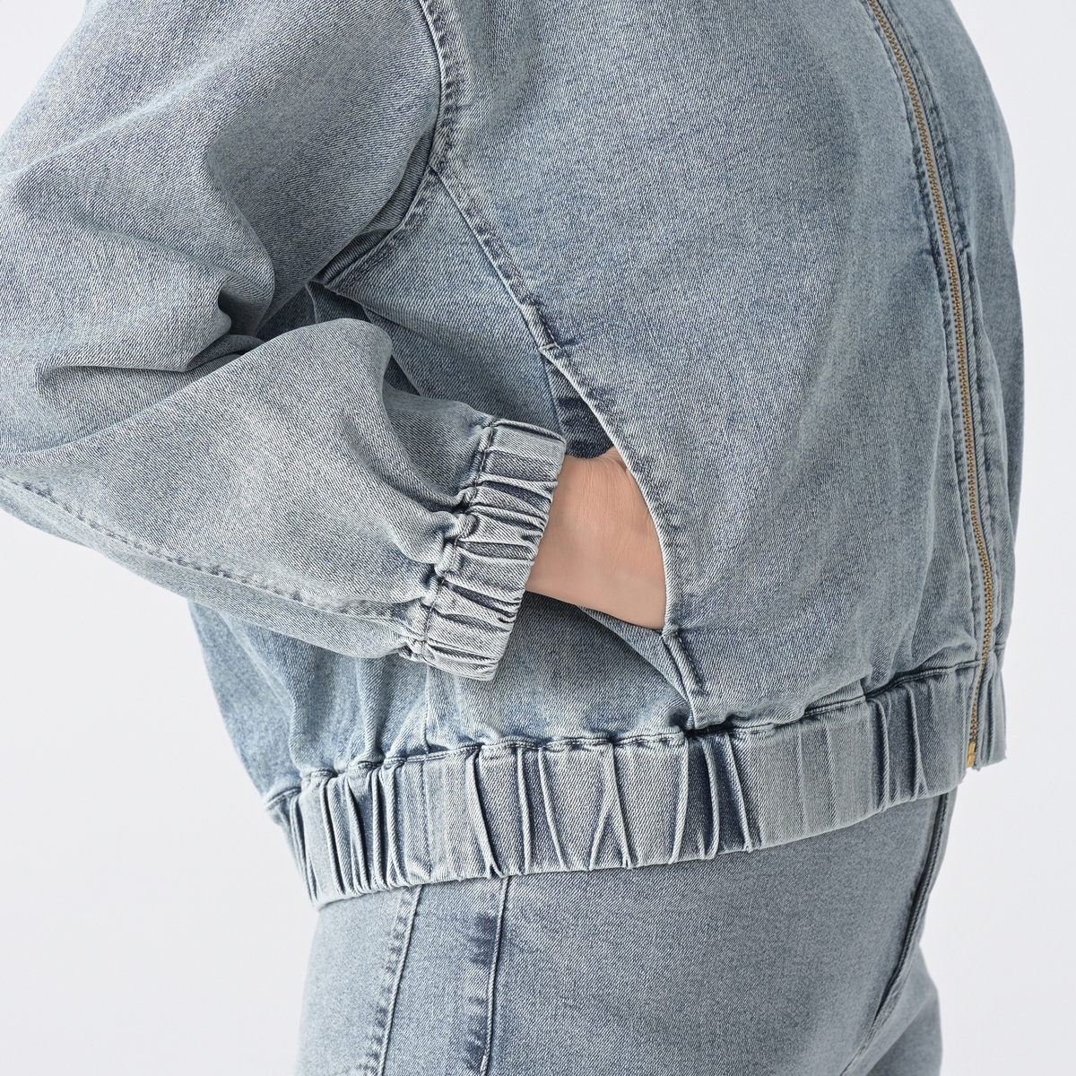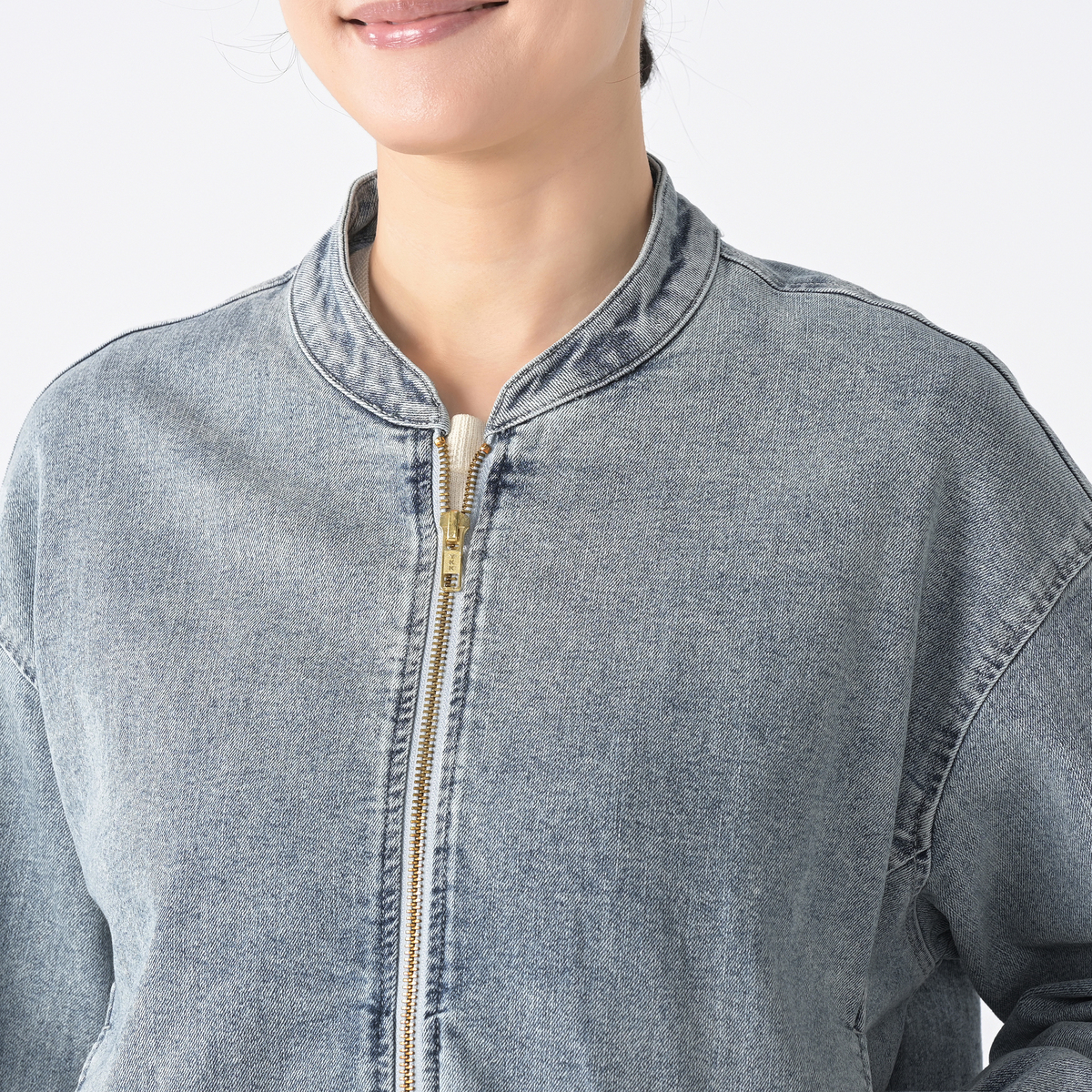 ゆったりとしたシルエットのジップアップデニムジャケット。袖口と裾にゴムギャザーを入れ、丸みのあるデザインに仕上げました。前身頃の切替部分には便利なポケット付きです