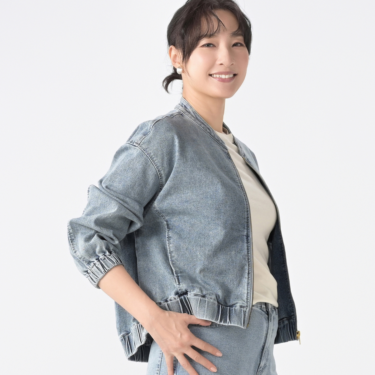 ゆったりとしたシルエットのジップアップデニムジャケット。袖口と裾にゴムギャザーを入れ、丸みのあるデザインに仕上げました。前身頃の切替部分には便利なポケット付きです
