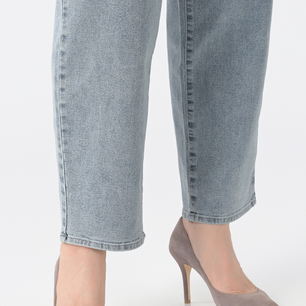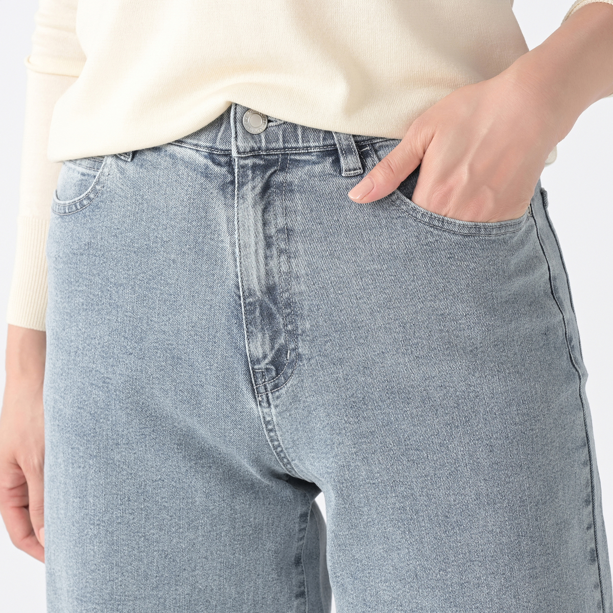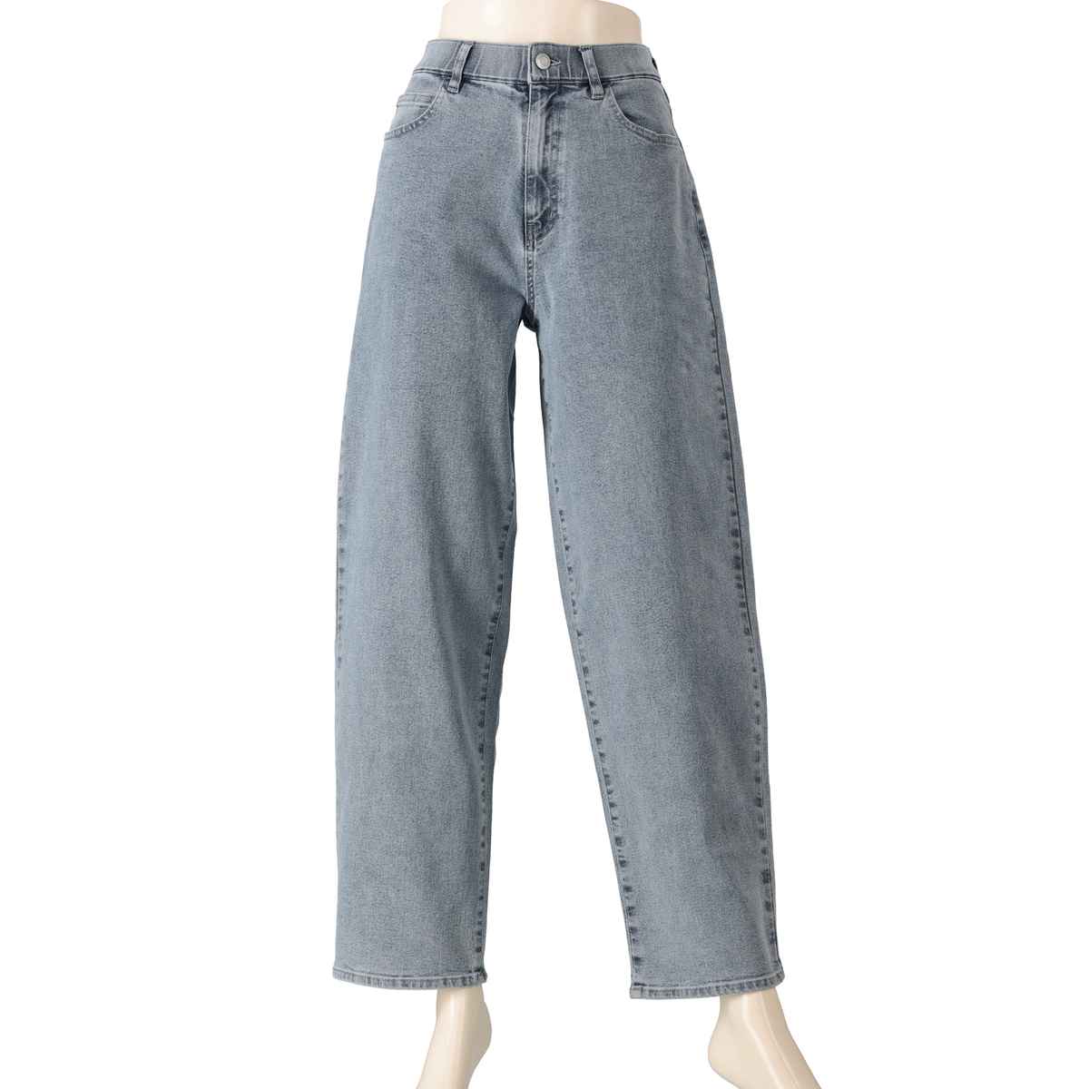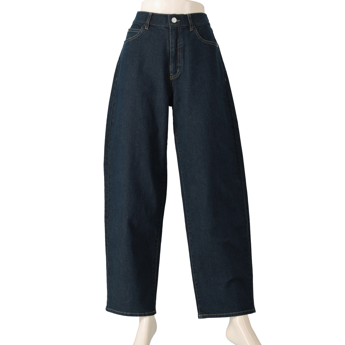 腰からゆるく広がり、裾に向かって少しすぼまったカーブワイドシルエット。前ファスナー開きの本格デニム仕様です。ウエストベルトは総ゴムのラクな穿き心地。脚のラインを拾いにくい、トレンド感のあるデザインです