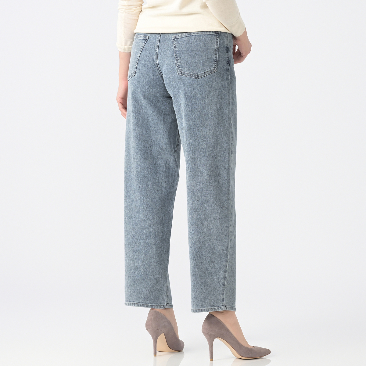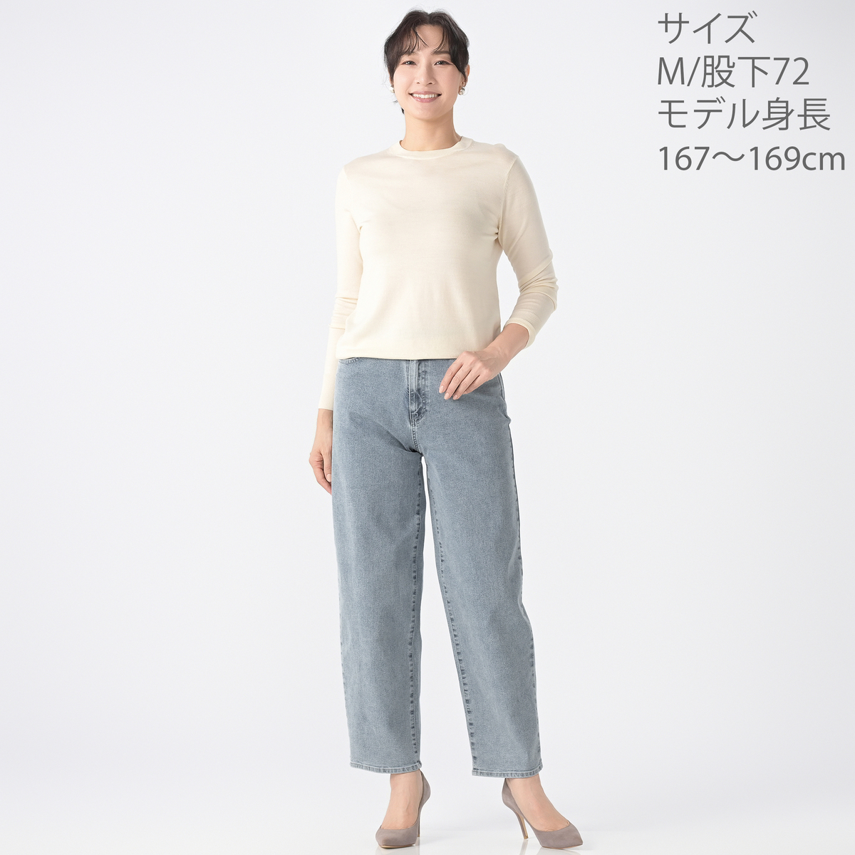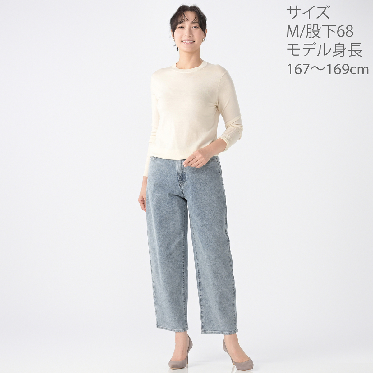 よく伸びるヨコストレッチのスラブ入りデニム。生地の伸びに合わせた伸縮性で、すっきりしたウエストに。股下は2つの長さから選べます。洗うことによりデニムならではの色落ち感が楽しめます