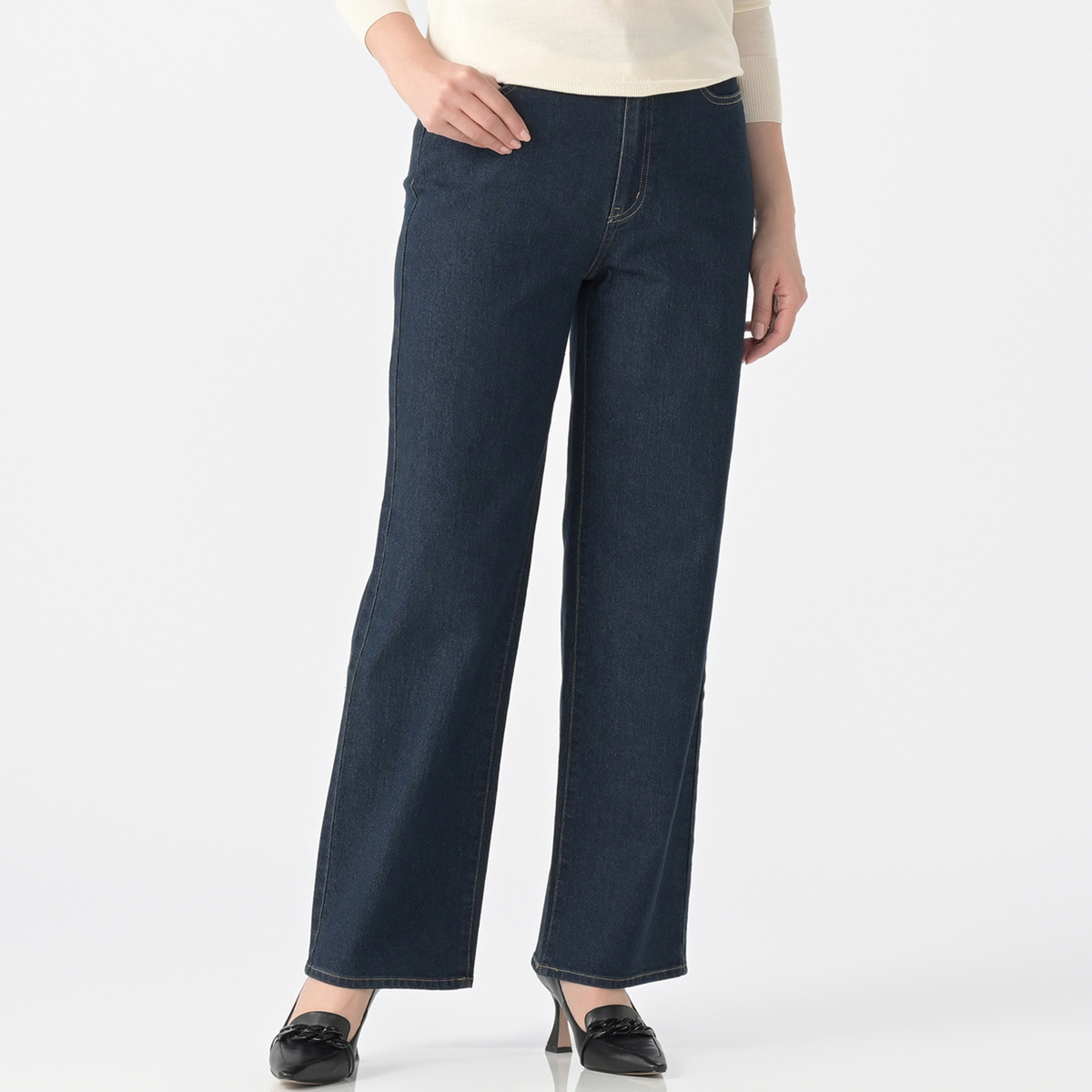 ややゆとりある、ゆるめのストレートシルエット。前ファスナー開きの本格デニム仕様です。ウエストベルトは総ゴムのラクな穿き心地。よく伸びるヨコストレッチのスラブ入りデニムです