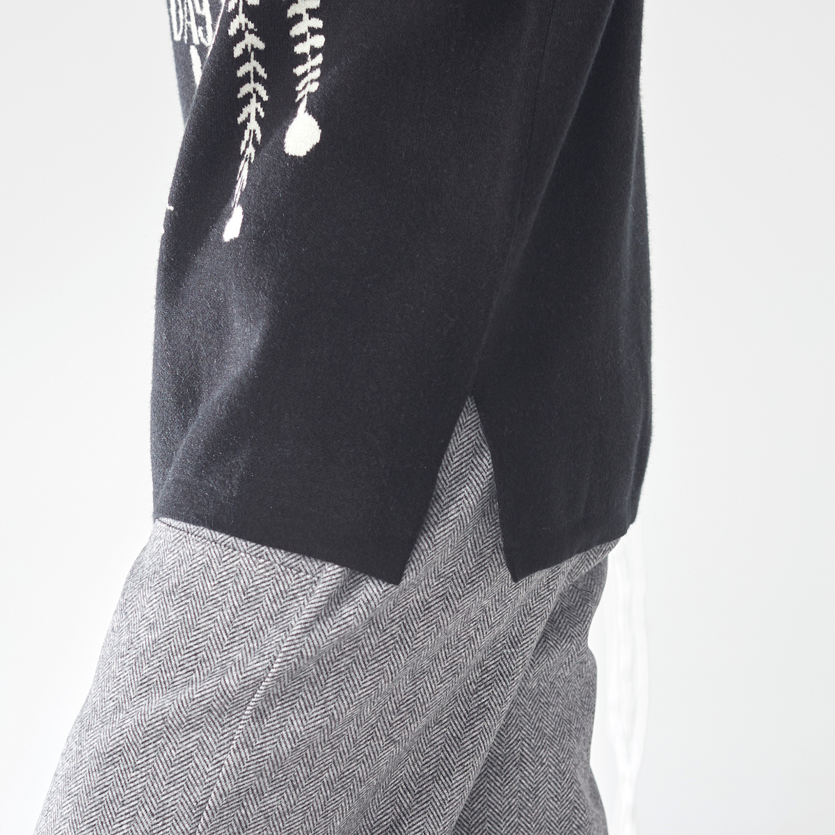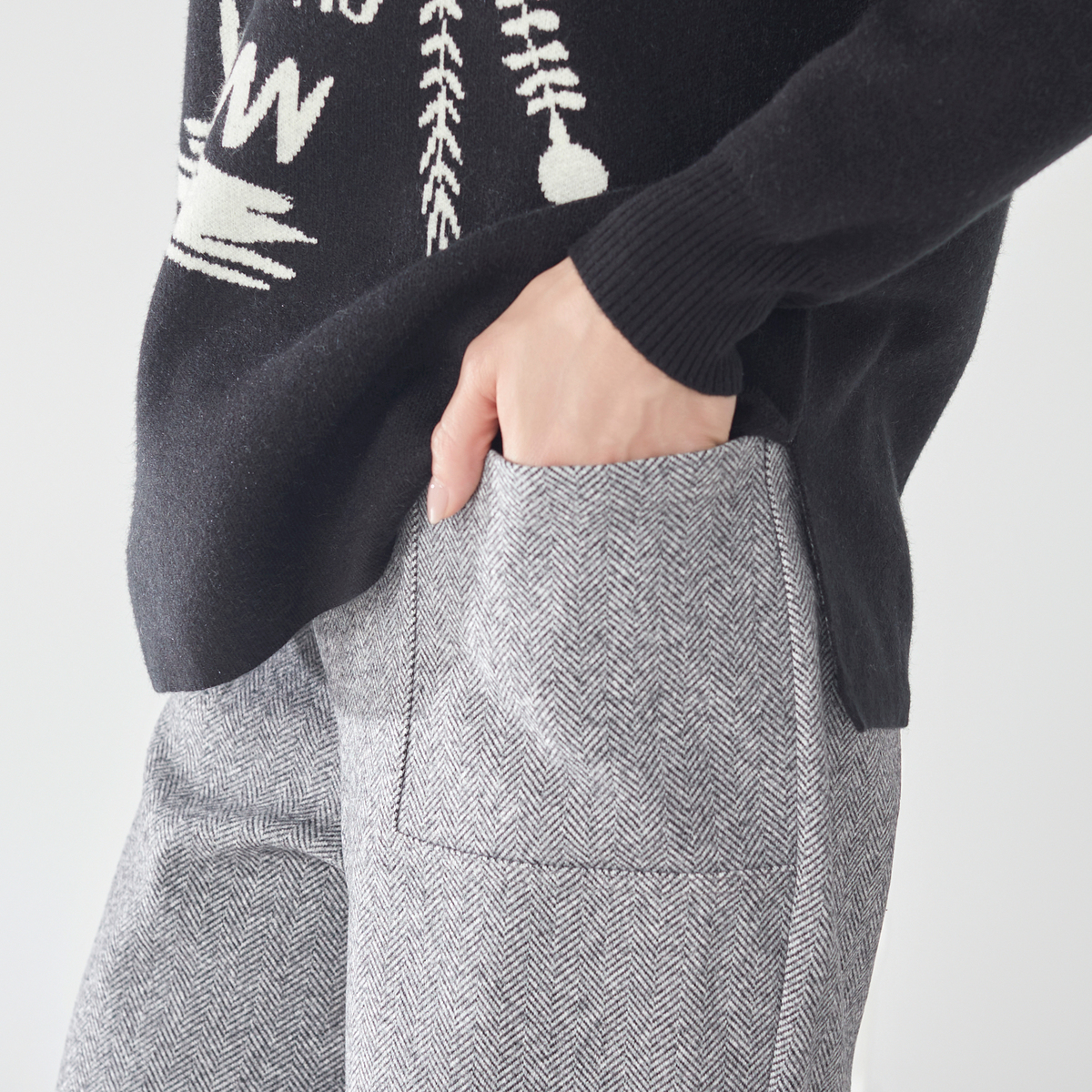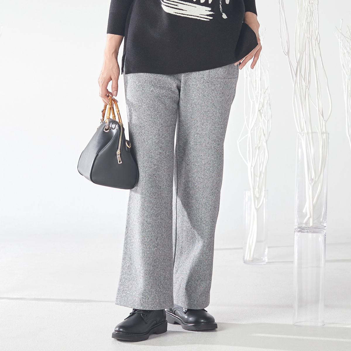 ヘリンボーン柄の素材に高級感が漂うセミワイドパンツ。さまざまなトップスと合わせやすく、日常のコーディネートに取り入れやすい一着です