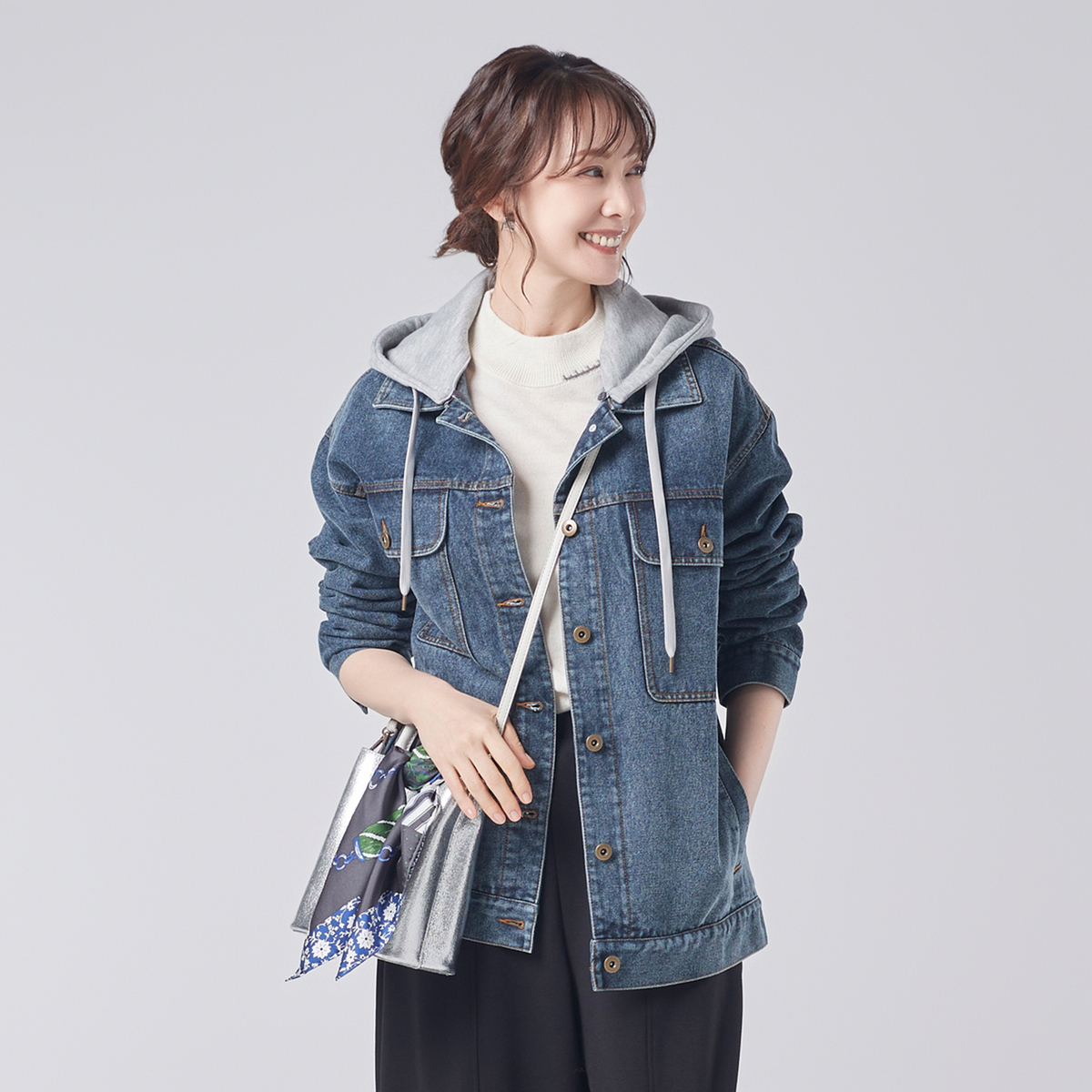 取り外し可能なフード付きのデニムジャケット。本格的なGジャン仕様で仕上げ、フードは二重の六枚接ぎという手の込んだ作りです。ゆったりとしたオーバーサイズで袖丈も長めに設定し、コーディネートや気分に合わせて多彩な着こなしを楽しめます
