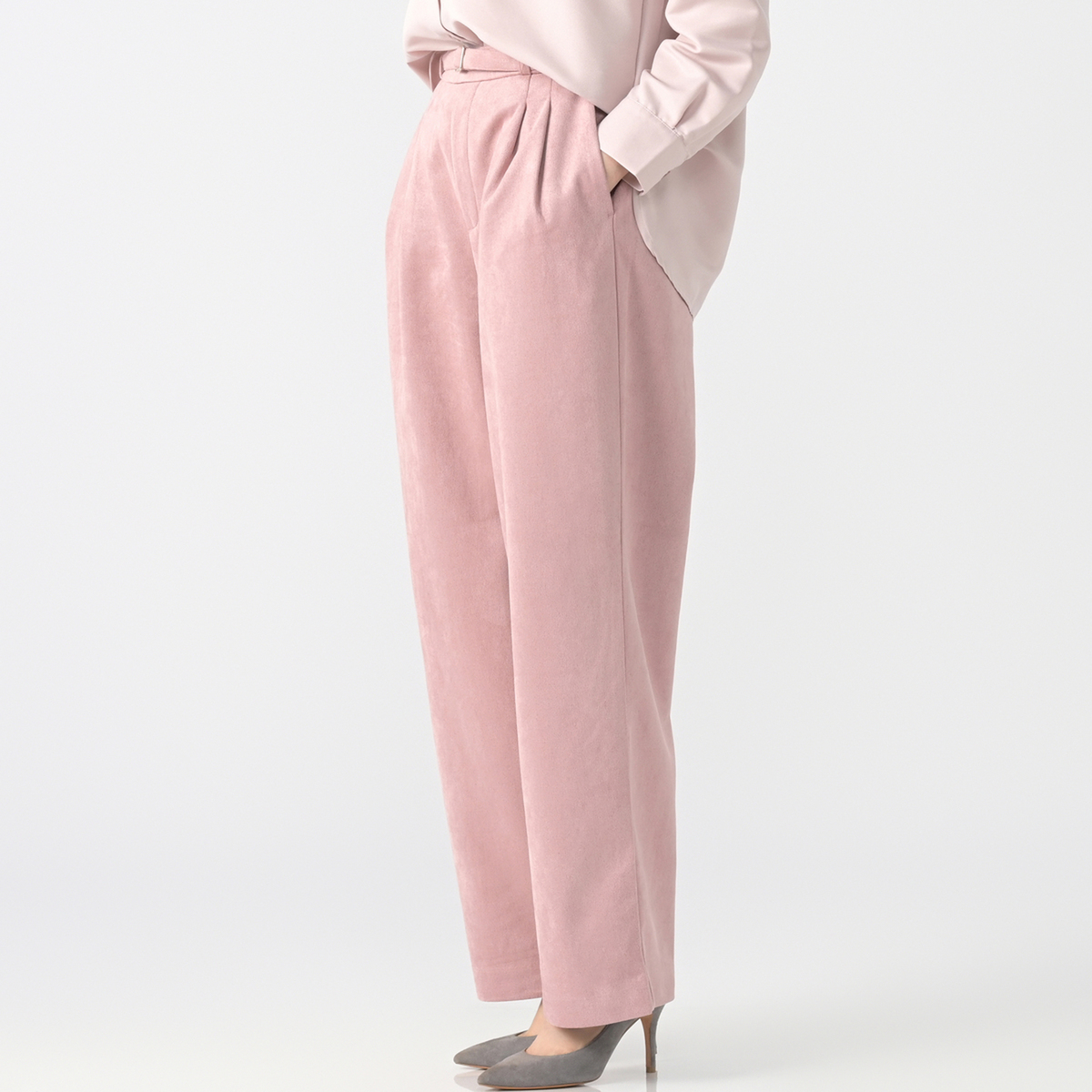 ストレッチ性のあるハイテンションのスエード調素材を使用したワイドパンツ。ウエストの後ろ全体にはゴムギャザーを配し、引っ張って穿けるプルオン仕様。前中心はダミー開きのファスナーがないフラットな仕上がりで、すっきり見えに。さらにフロントの2タックが体型カバーを叶えます