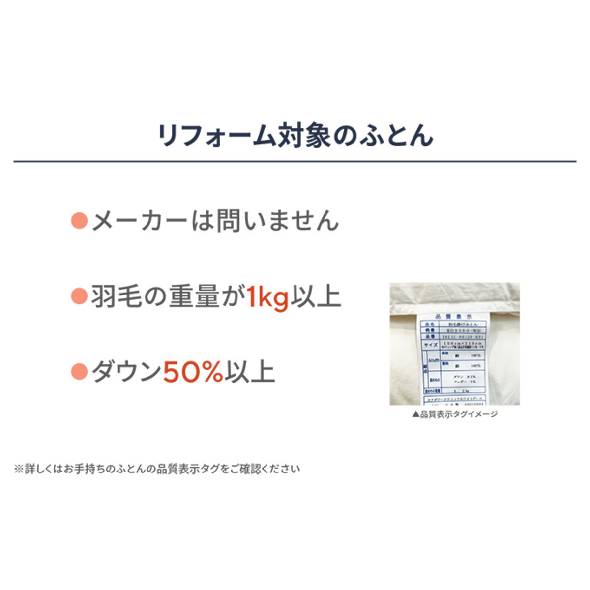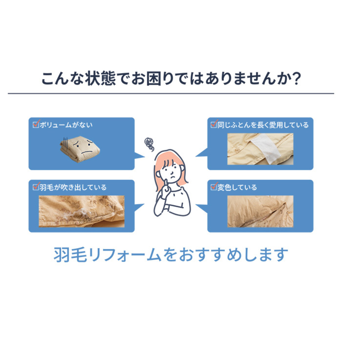 [仕立直し後 サイズ/重量] シングル:150×210cm/約1000g(+洗浄後羽毛) [足し羽毛] 200g [素材] <ふとんがわ> 表地 ポリエステル85%綿15% 裏地 ポリエステル85%綿15% <足し羽毛> ダウン85%フェザー15% [注意事項] ※ご注文をいただいてから「ふとん回収キット」を10日前後でお届けします ※ふとんを運送会社にお引渡しいただいてから加工して、約6週間前後でお届けします ※「ふとん回収キット」はご依頼主様へ発送されます ※リフォーム対象のふとんについて ・今お使いのふとんのメーカーは問いません ・羽毛の重量が1kg以上 ・ダウン50%以上 ※以下のようなおふとんをお送りいただいた場合リフォームすることができません ・詰めものが羽根・綿わた・ウール・ポリエステルなどのふとん ・羽毛肌掛けふとん ・2枚合わせ羽毛ふとん ・詰めものがアイダーダックダウン 【日本製】