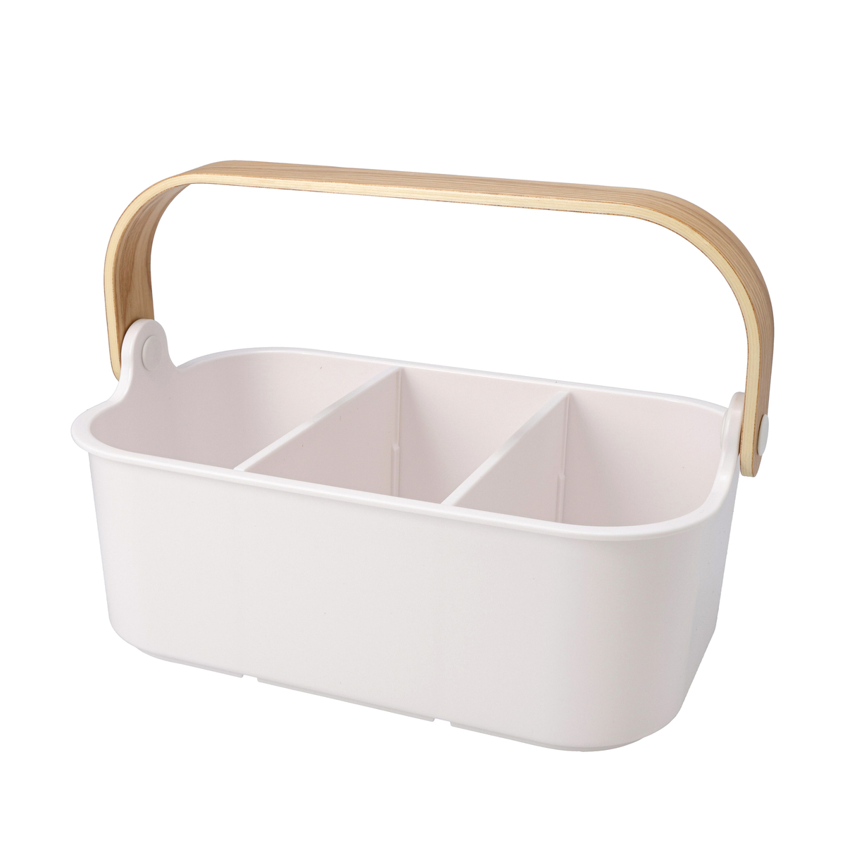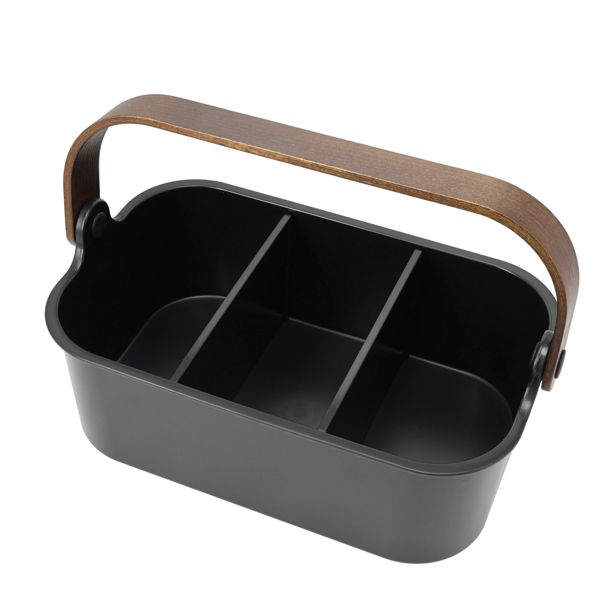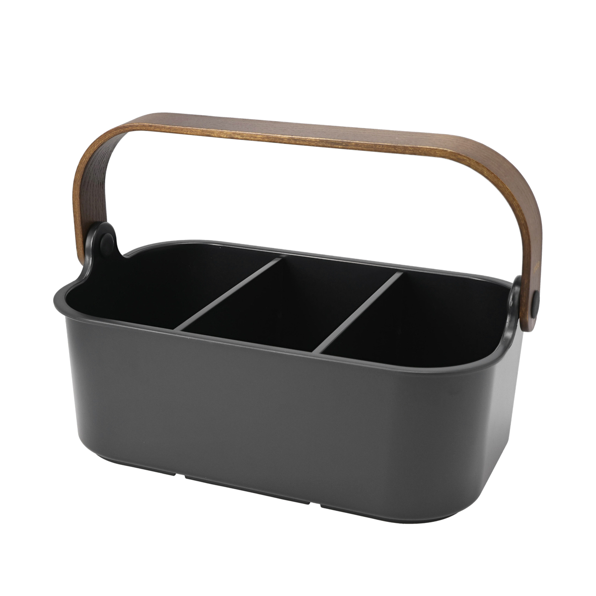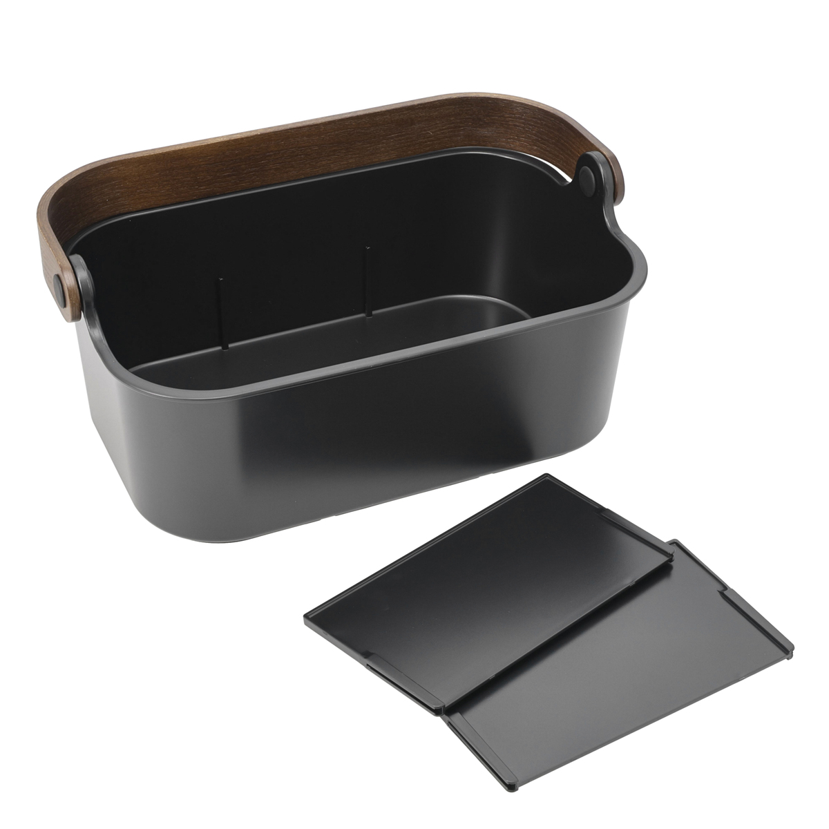 木製ハンドルを付けたスタッカブルビンです。2枚の取り外し可能な仕切りがあり、調味料や化粧品、趣味のガジェットボックスとしても使用可能。持ち運びに便利なハンドルは、収納時に折り畳めばコンパクトになります