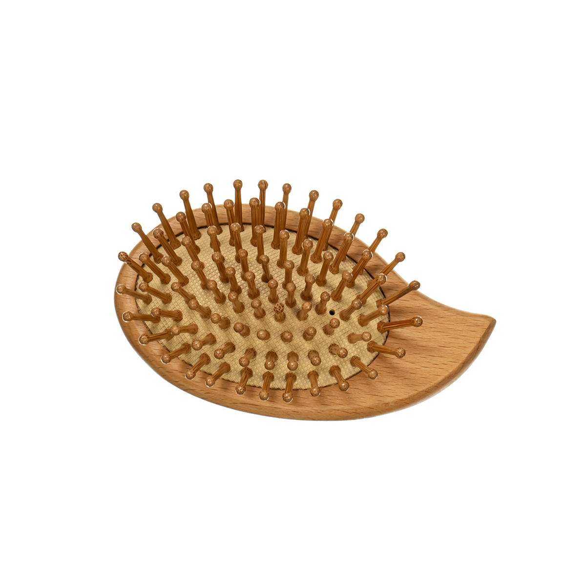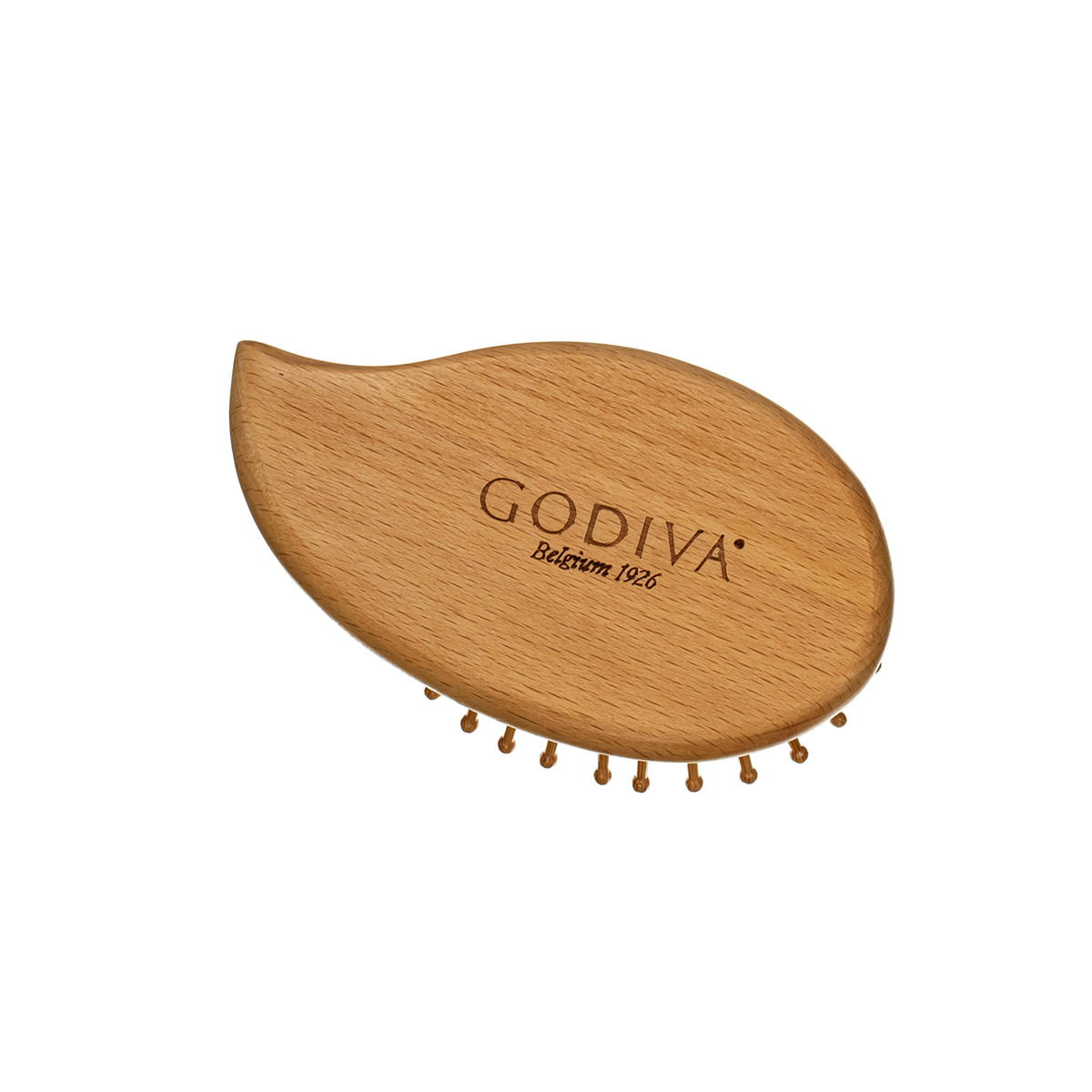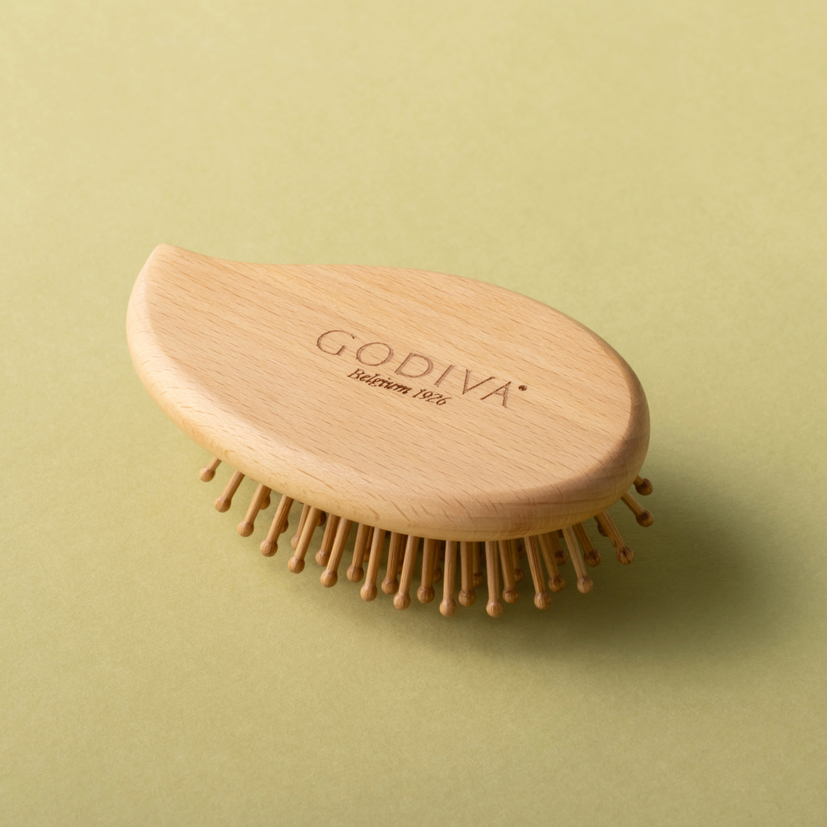 手のひらサイズで持ちやすい木製ヘアブラシ。優しい色合いでゴディバのロゴが入っています。ブラシの先端が丸く肌当たりがなめらかなので、頭皮マッサージにもご利用ください