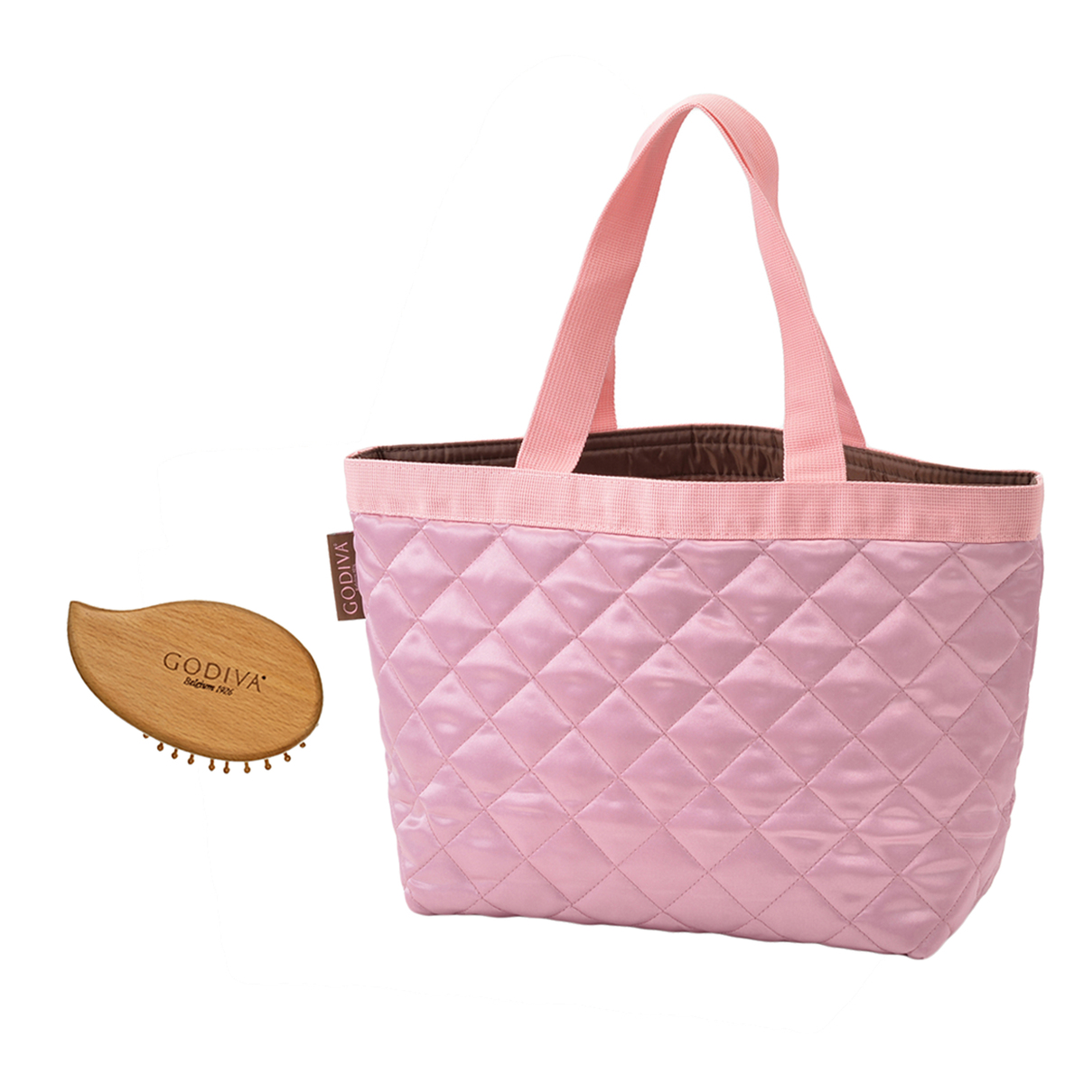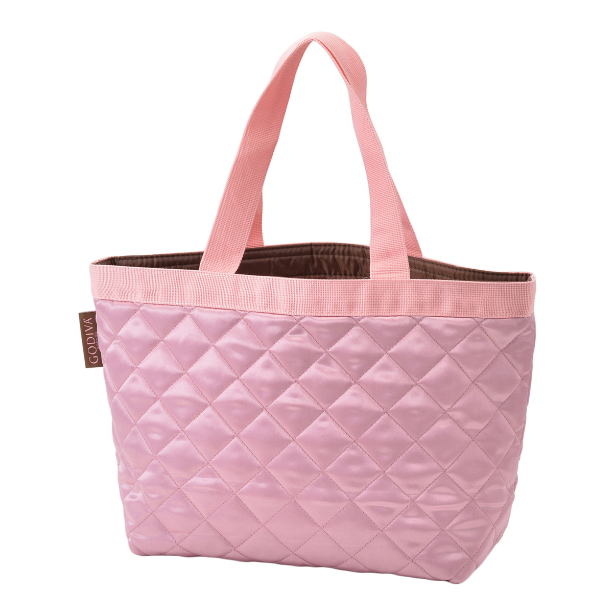 ピンクのサテンが華やかなトートバッグ。キルティング生地を使い、シンプルで高級感溢れるデザイン。A4のノートが収納可能なサイズ感です