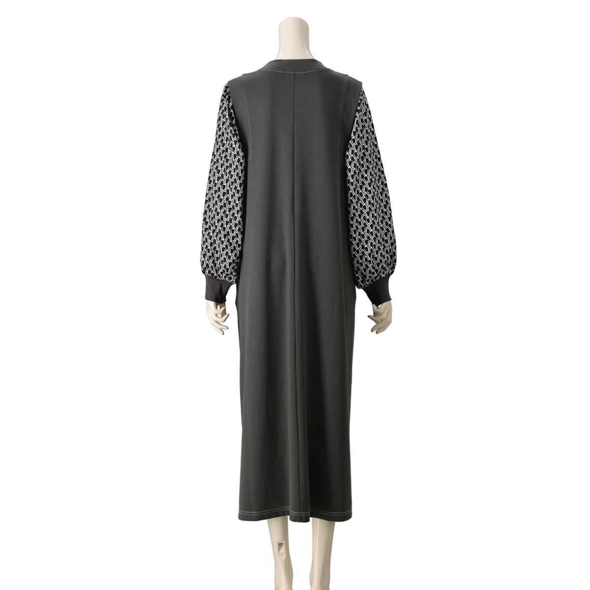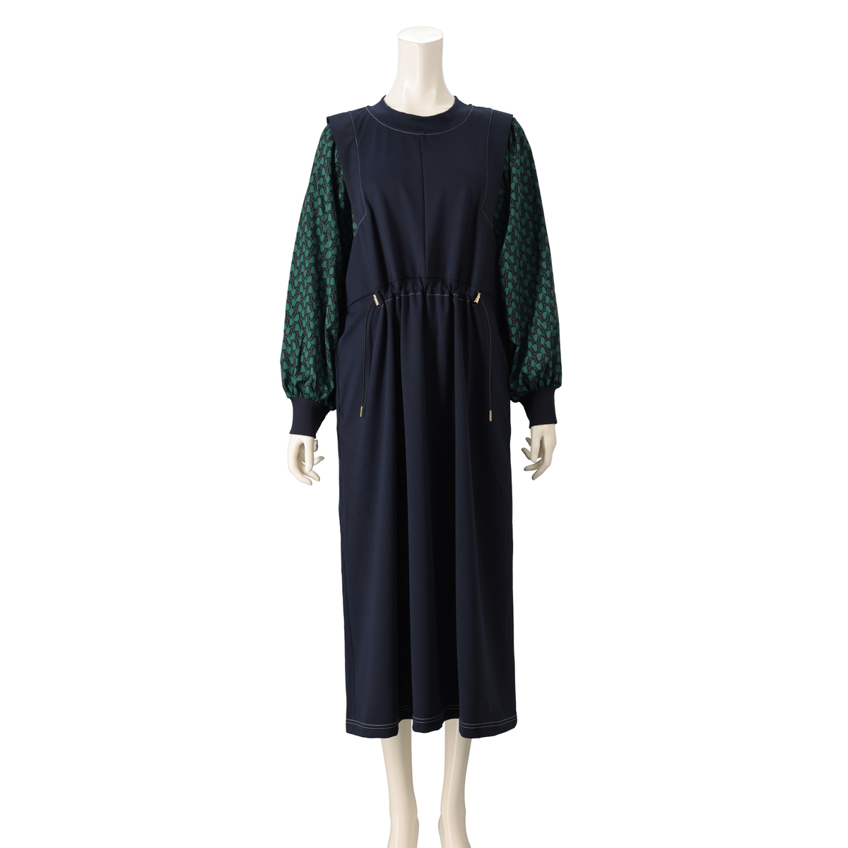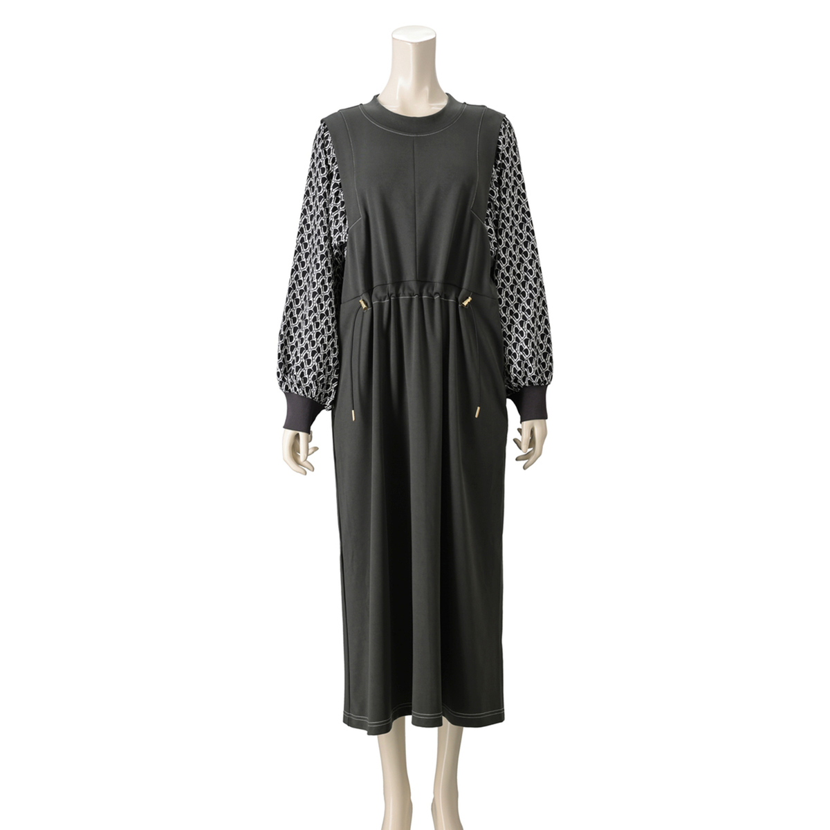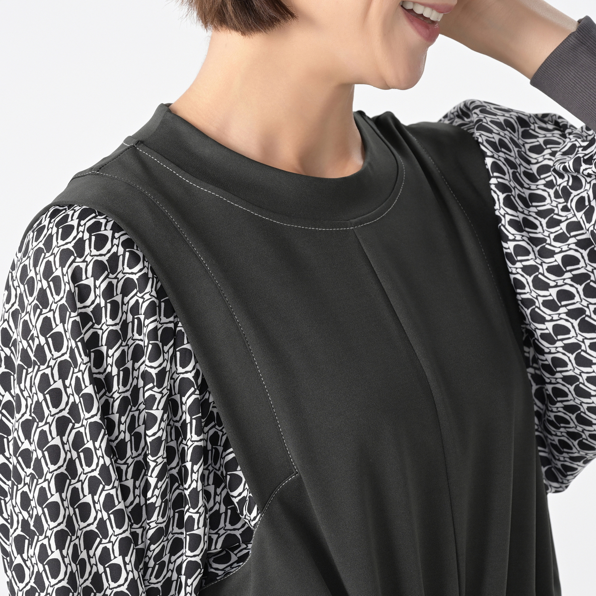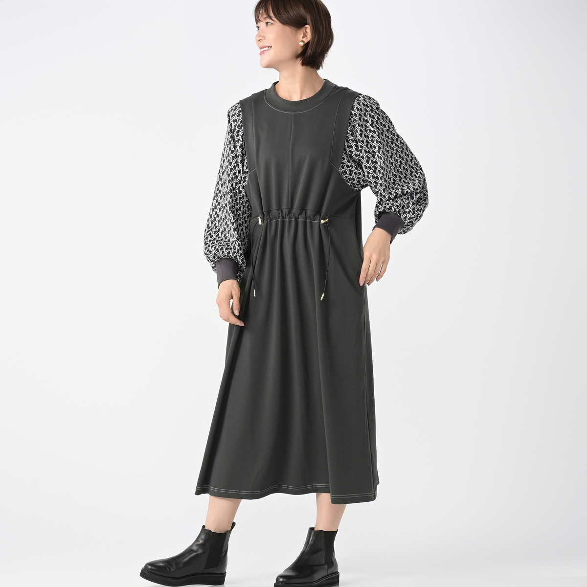 カットソー素材と布帛素材をドッキングさせたワンピース。袖のボリューム感でエレガントな雰囲気に。袖部分に使用している布帛素材はブランドオリジナルの柄です