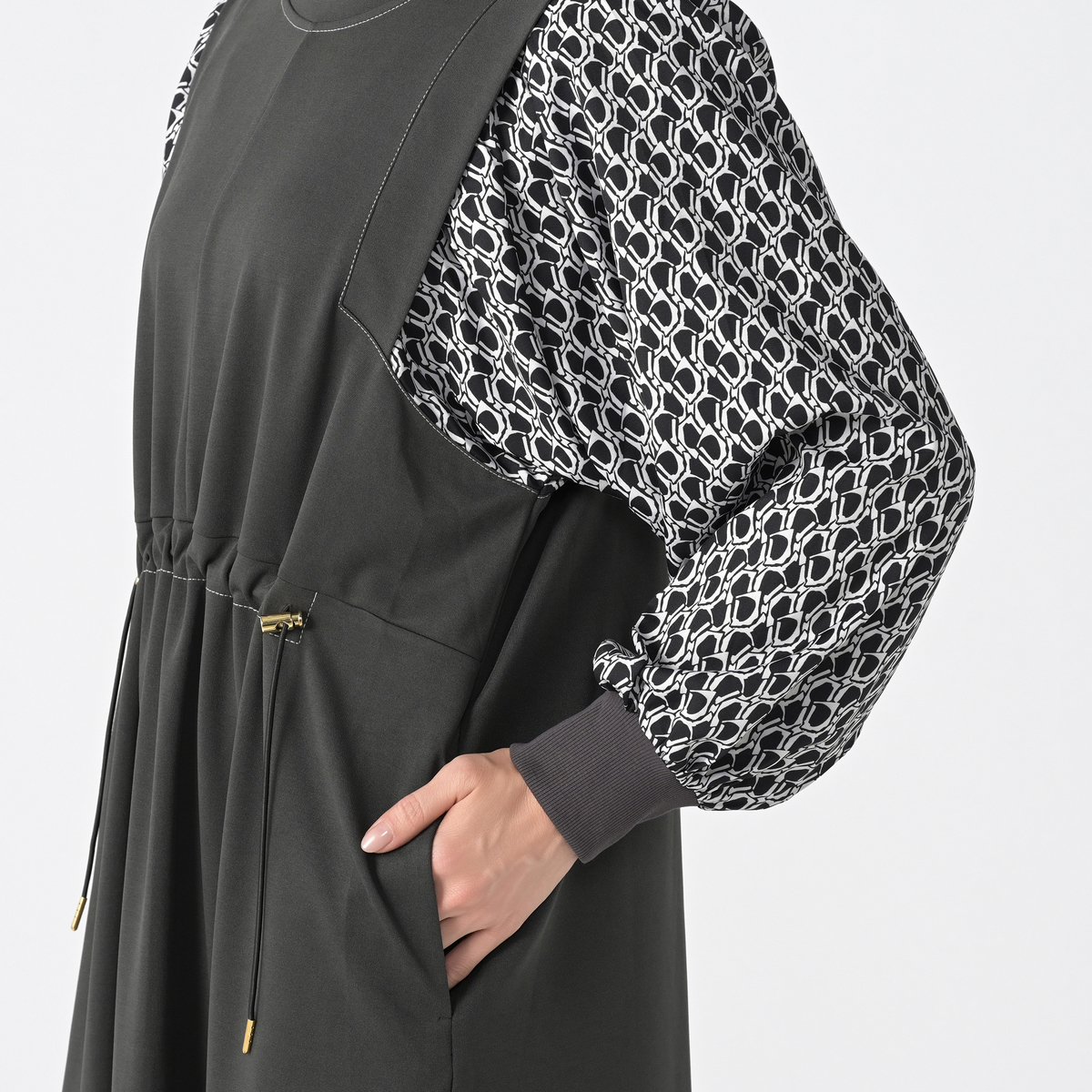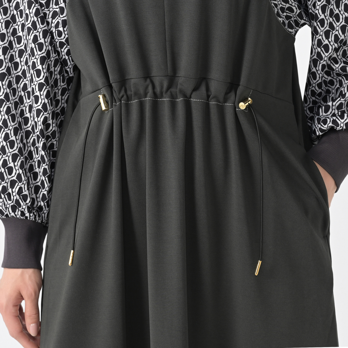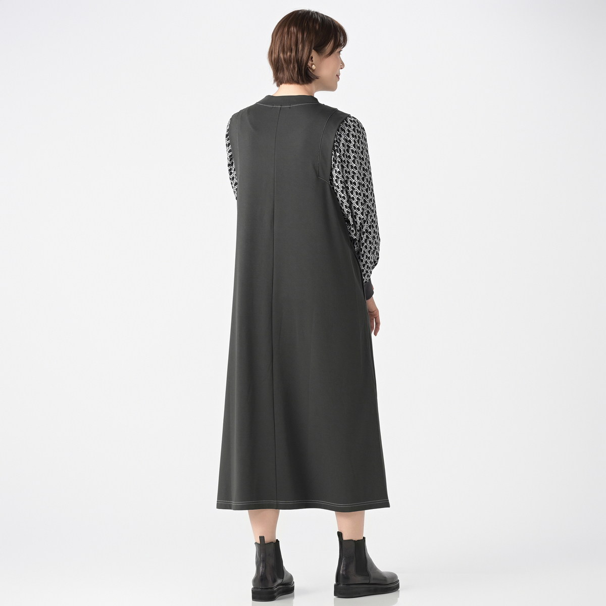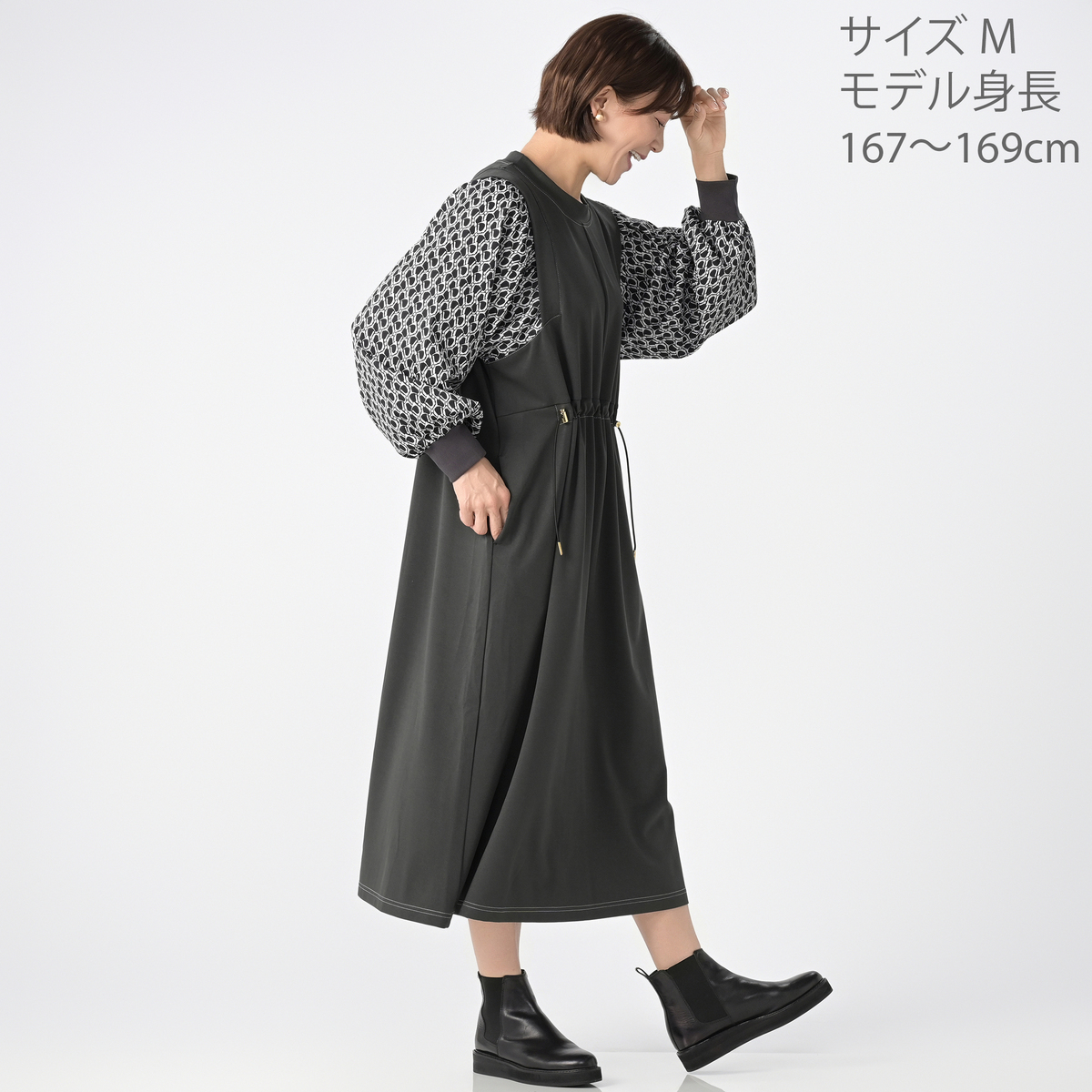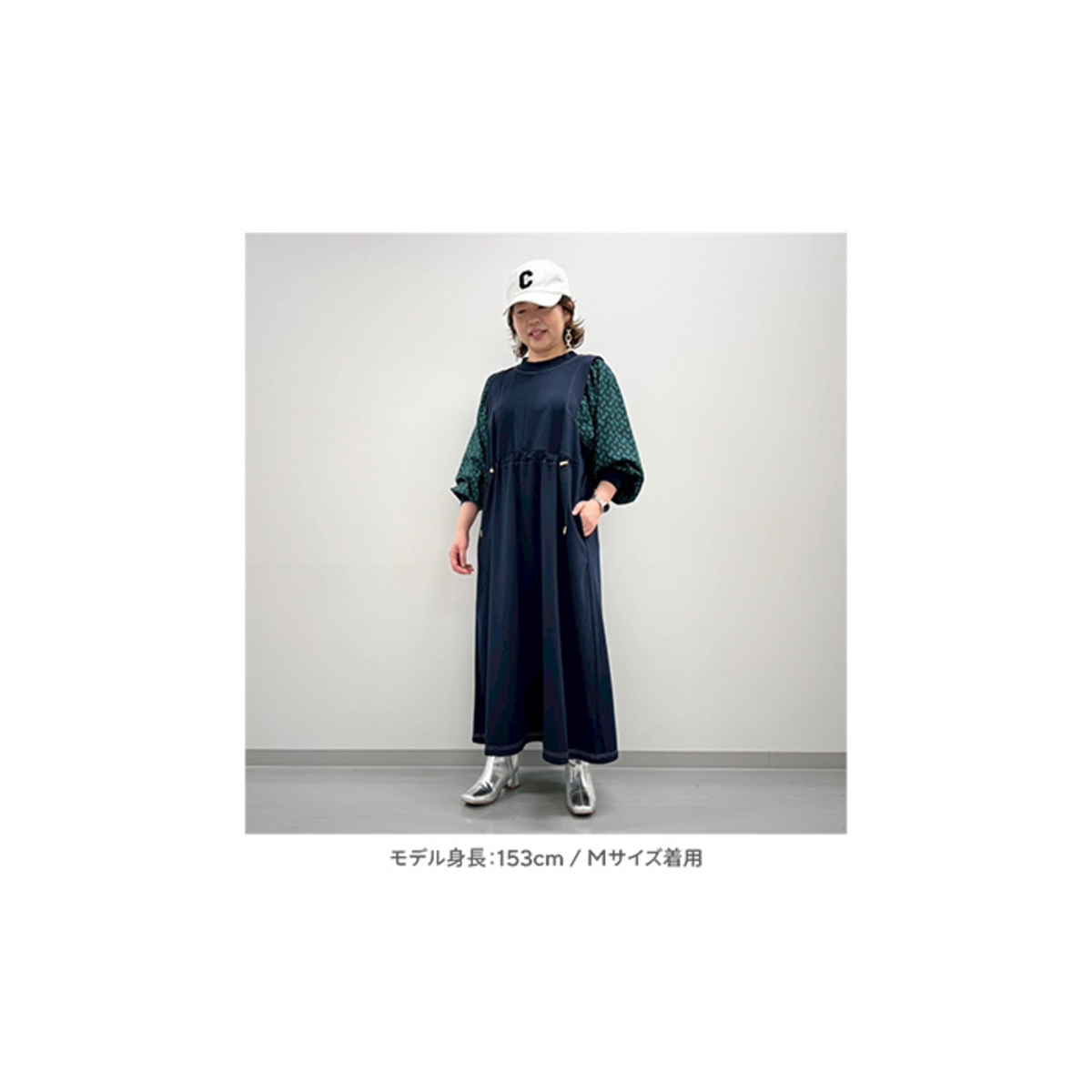 カットソー素材と布帛素材をドッキングさせたワンピース。袖のボリューム感でエレガントな雰囲気に。袖部分に使用している布帛素材はブランドオリジナルの柄です