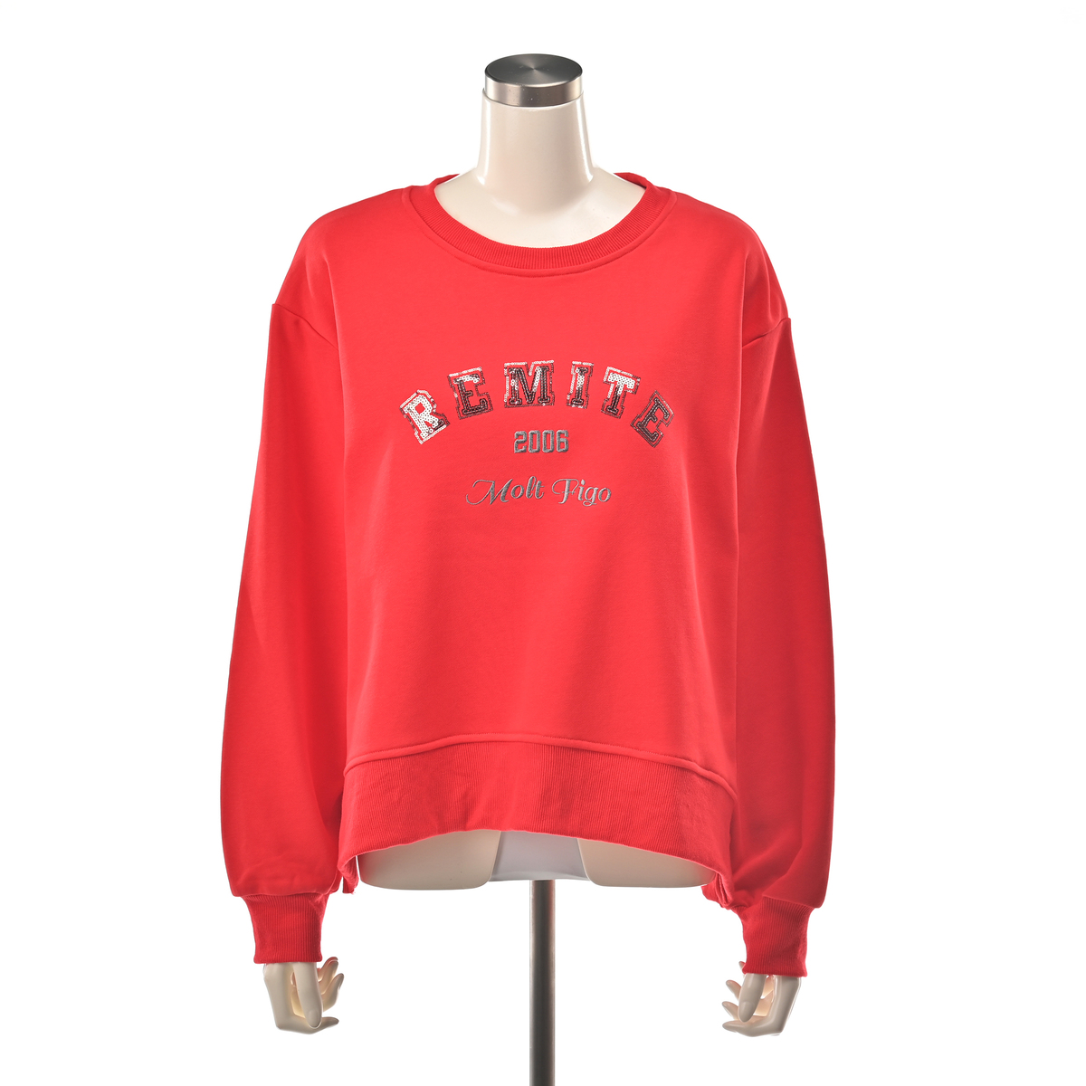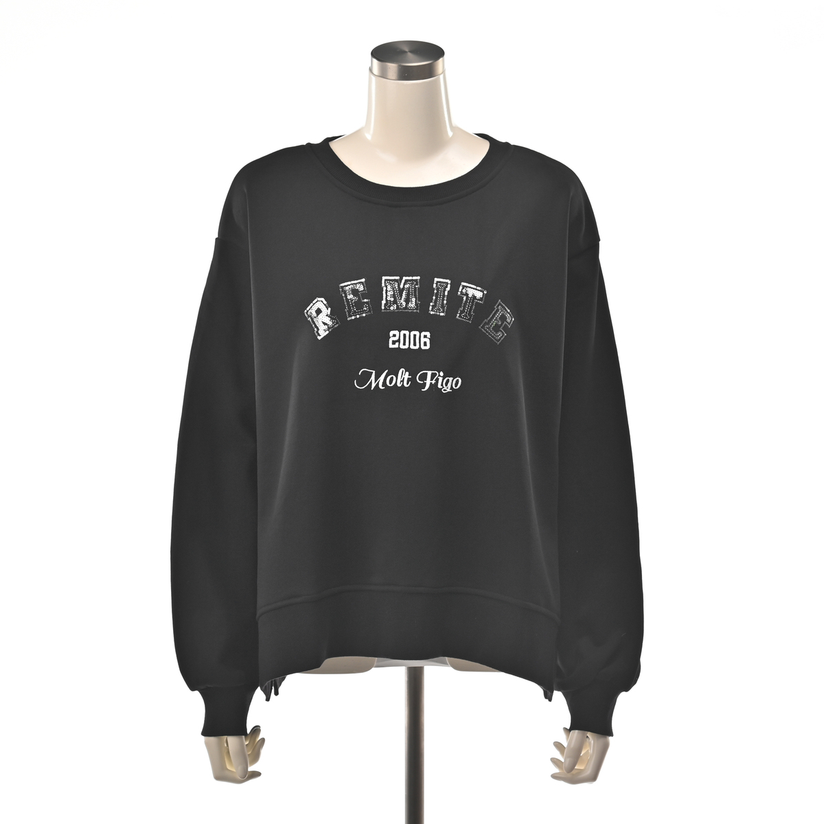 カットソー素材の裏毛を使用したクルーネックタイプのプルオーバー。カジュアルな裏毛素材をキレイめに仕上げています。前身頃にブランドロゴをスパンコール刺繍で施し、その下にはイタリア語でとてもかっこいい、クールという意味の刺繍とブランド創設年の2006の刺繍を施しています