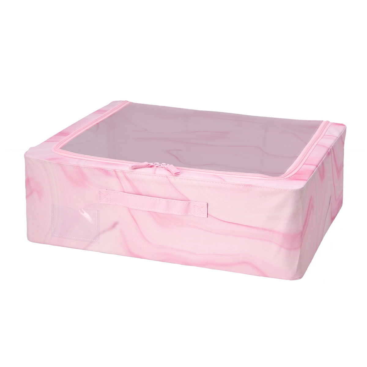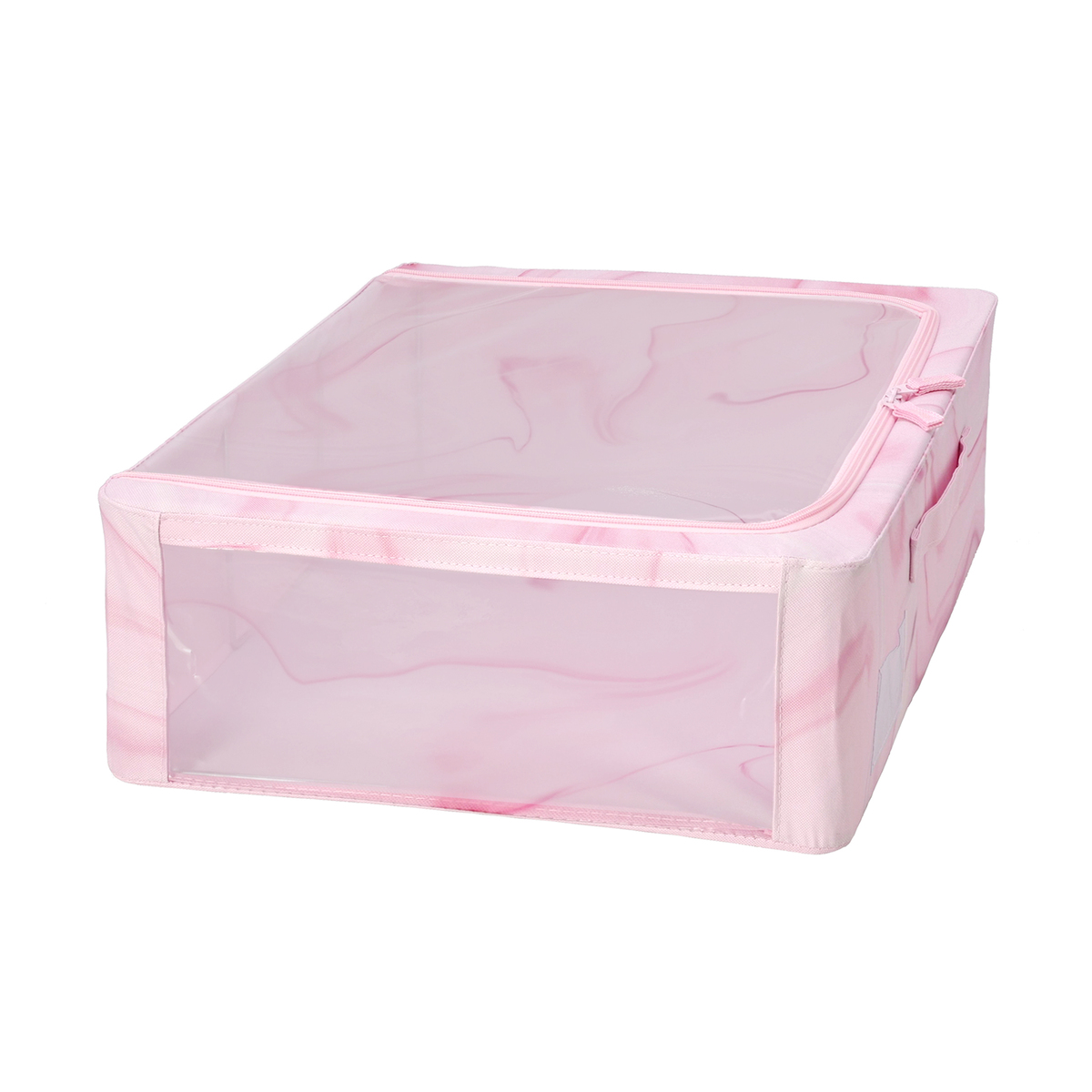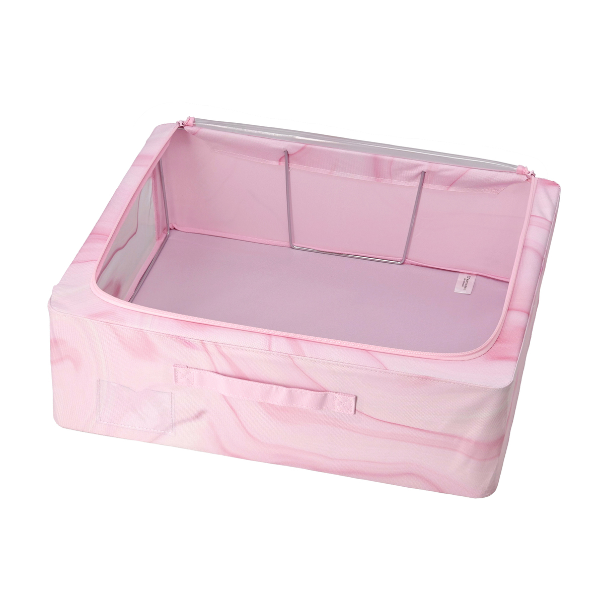 洋服や小物などを入れるのにおすすめの収納ボックスです。天面はファスナー付きで、天面の窓から出し入れ可能。正面には、整理整頓に便利なラベルポケットが付いています