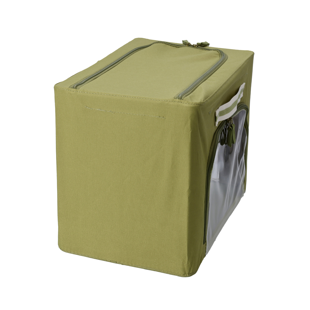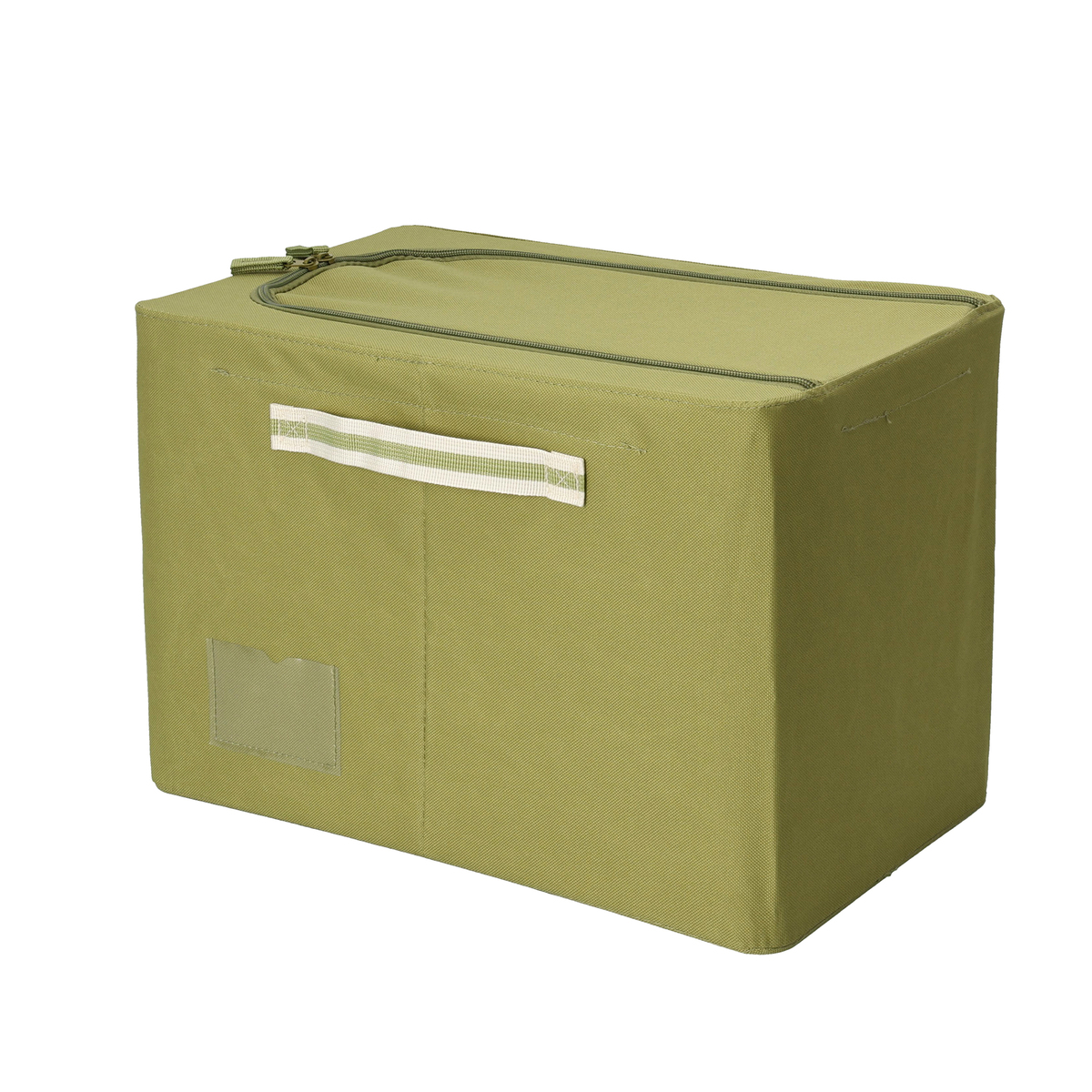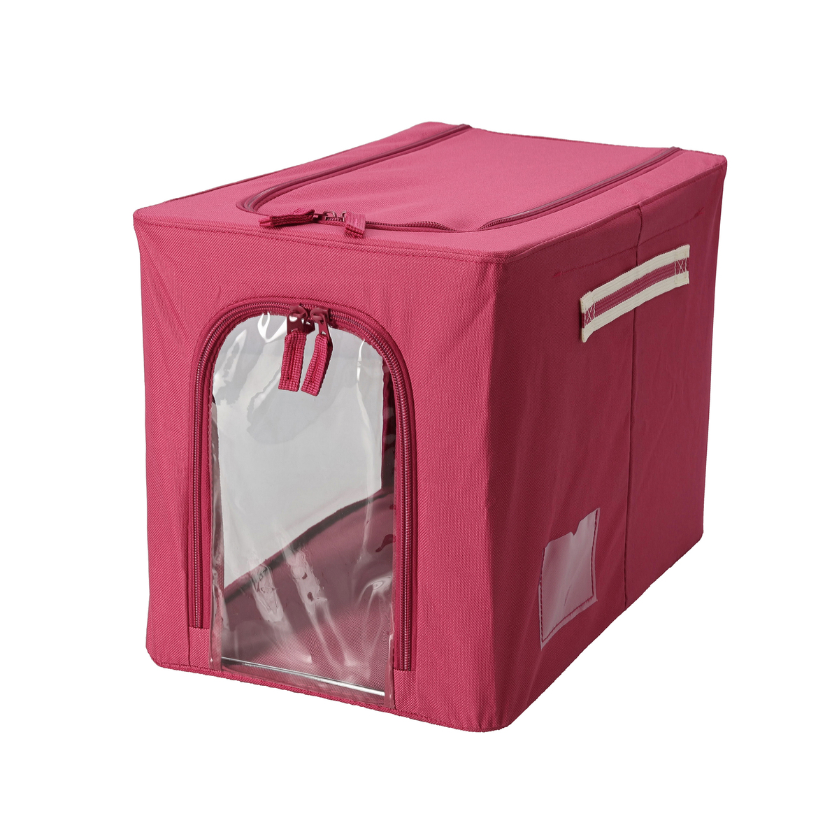 洋服や小物などを入れるのにおすすめの収納ボックスです。天面、正面、側面(片側)はファスナー付きで、上からも前からも、横(片側)からも出し入れ可能。側面(片側)には、整理整頓に便利なラベルポケットが付いています