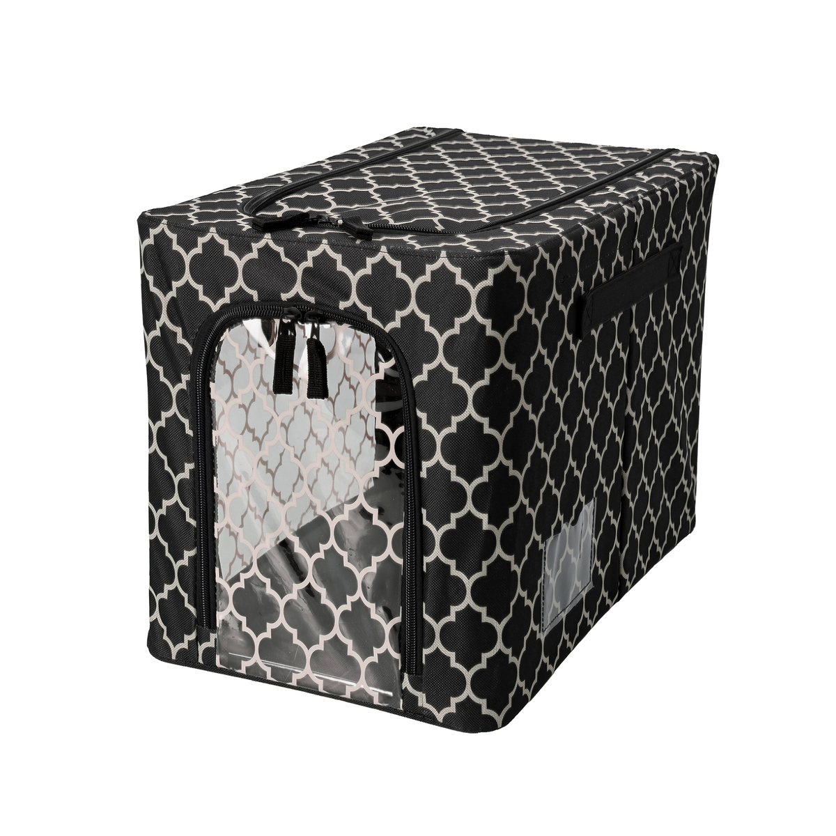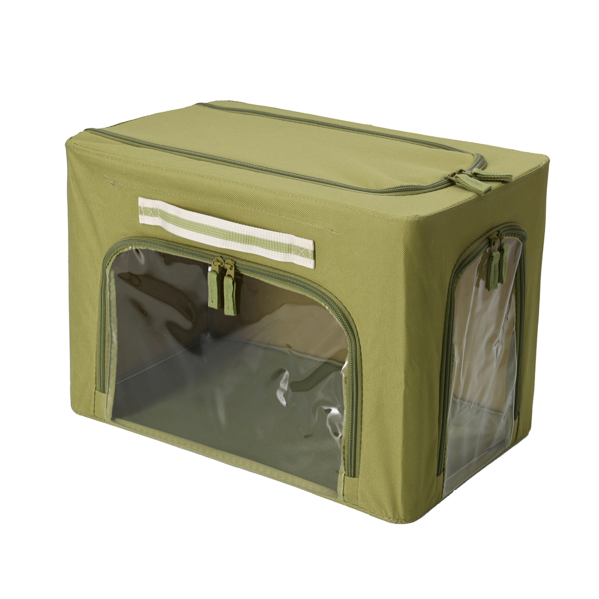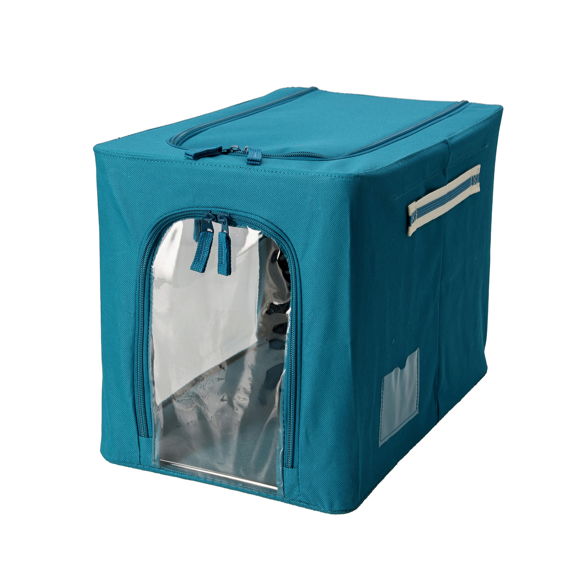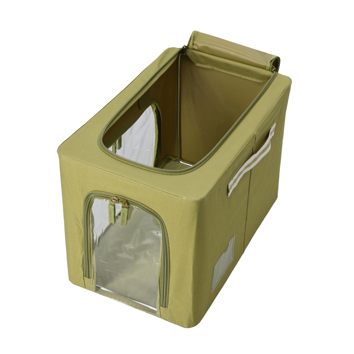 洋服や小物などを入れるのにおすすめの収納ボックスです。天面、正面、側面(片側)はファスナー付きで、上からも前からも、横(片側)からも出し入れ可能。側面(片側)には、整理整頓に便利なラベルポケットが付いています