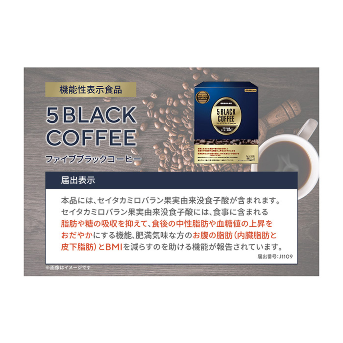 ブラジル産コーヒー豆を使用。機能性関与成分の原材料としてセイタカミロバラン果実抽出物を配合しました。さらに梅種炭粉末、竹炭粉末、黒大豆きな粉、黒糖を配合*。1本(3g)をカップに入れてお湯または水を注ぎ、食事とともにお召し上がりください