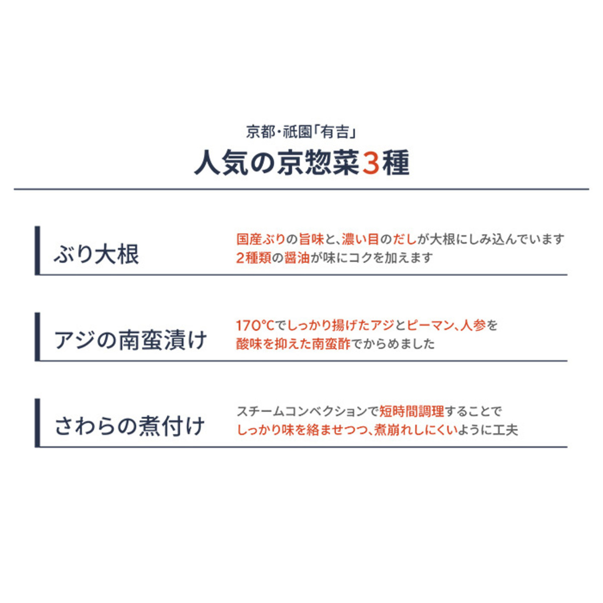 京都祇園「鮨・割烹 有吉」の有吉秀和氏が監修した、京惣菜の3種セット。小袋の食べきりサイズにして詰め合わせ、冷凍でお届けします。下処理の段階で、できるだけ小骨を取り除いています(小骨は完全に取り除けているわけではありません)