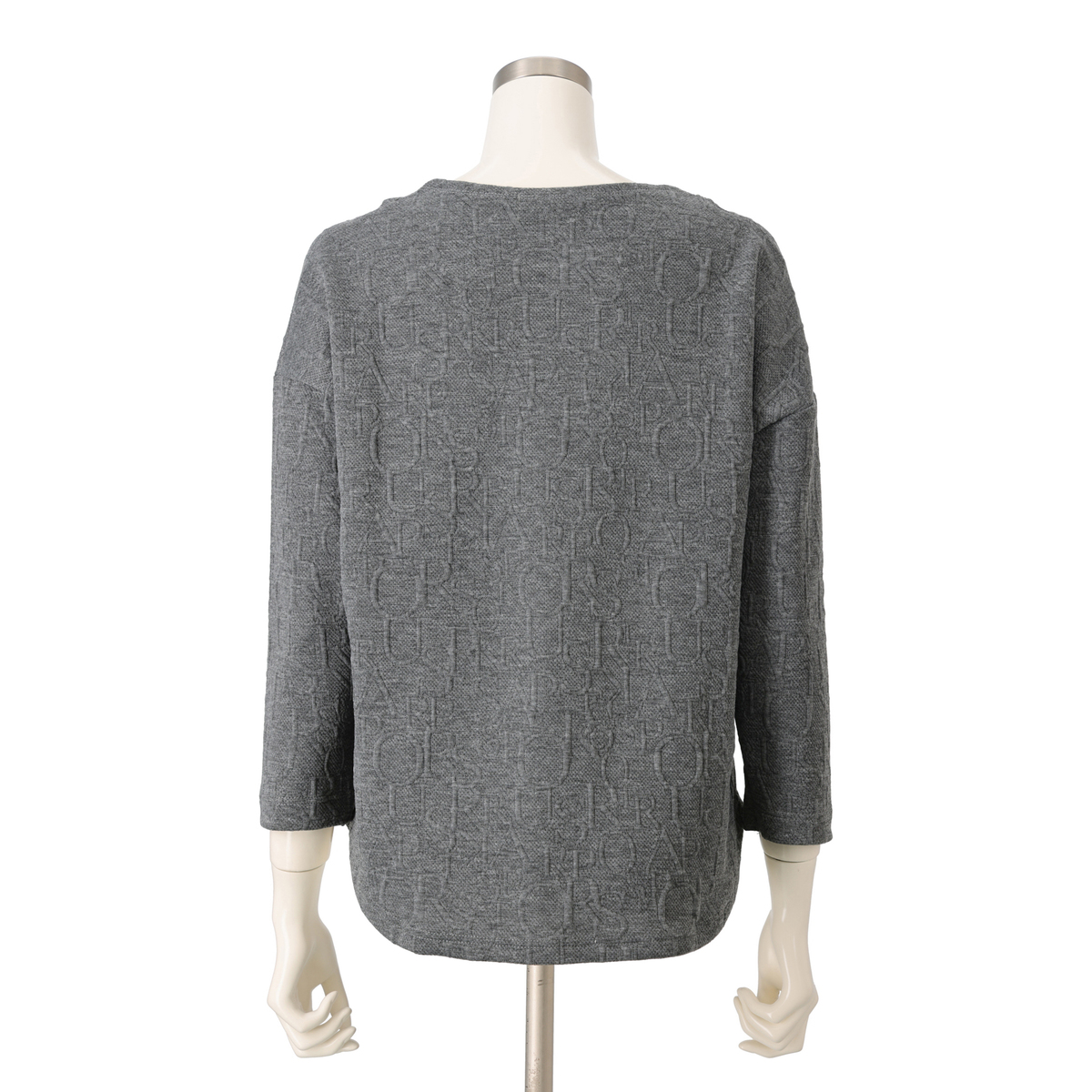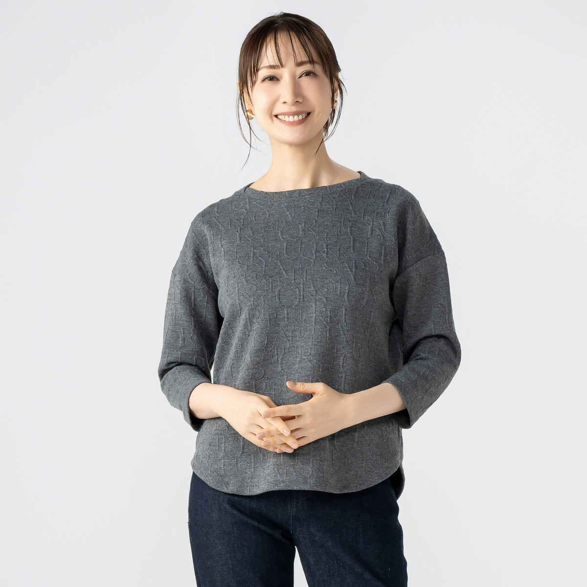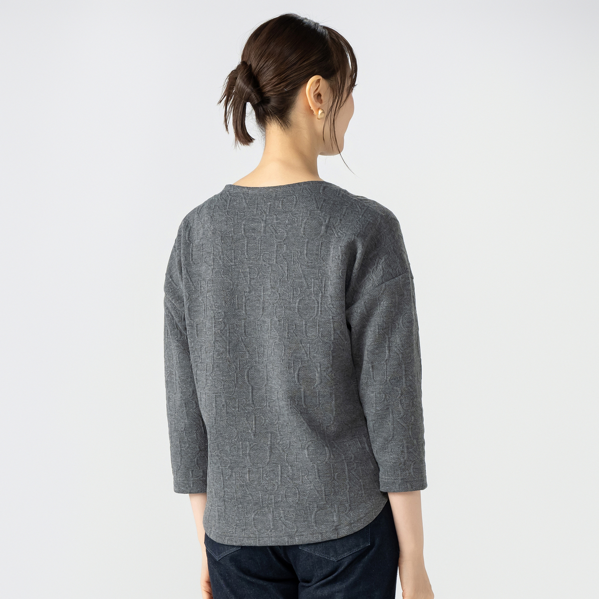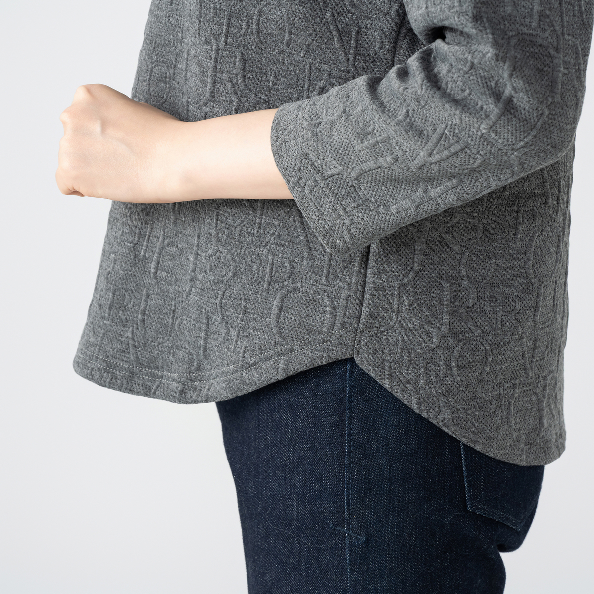 上品に着こなせるジャガード編みプルオーバー。遠目には無地見えしつつ、近くで見るとアルファベット風のさりげない模様がデザイン性を主張します