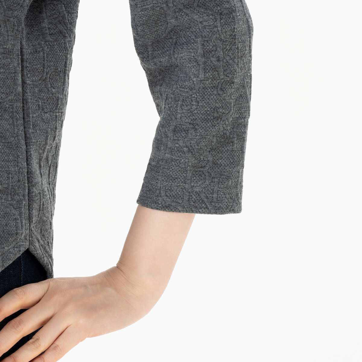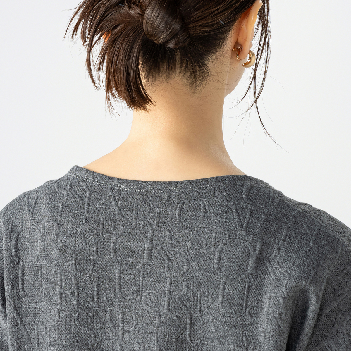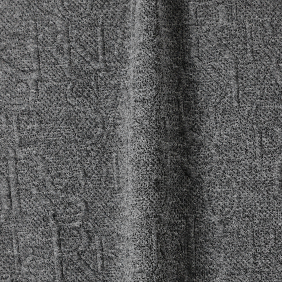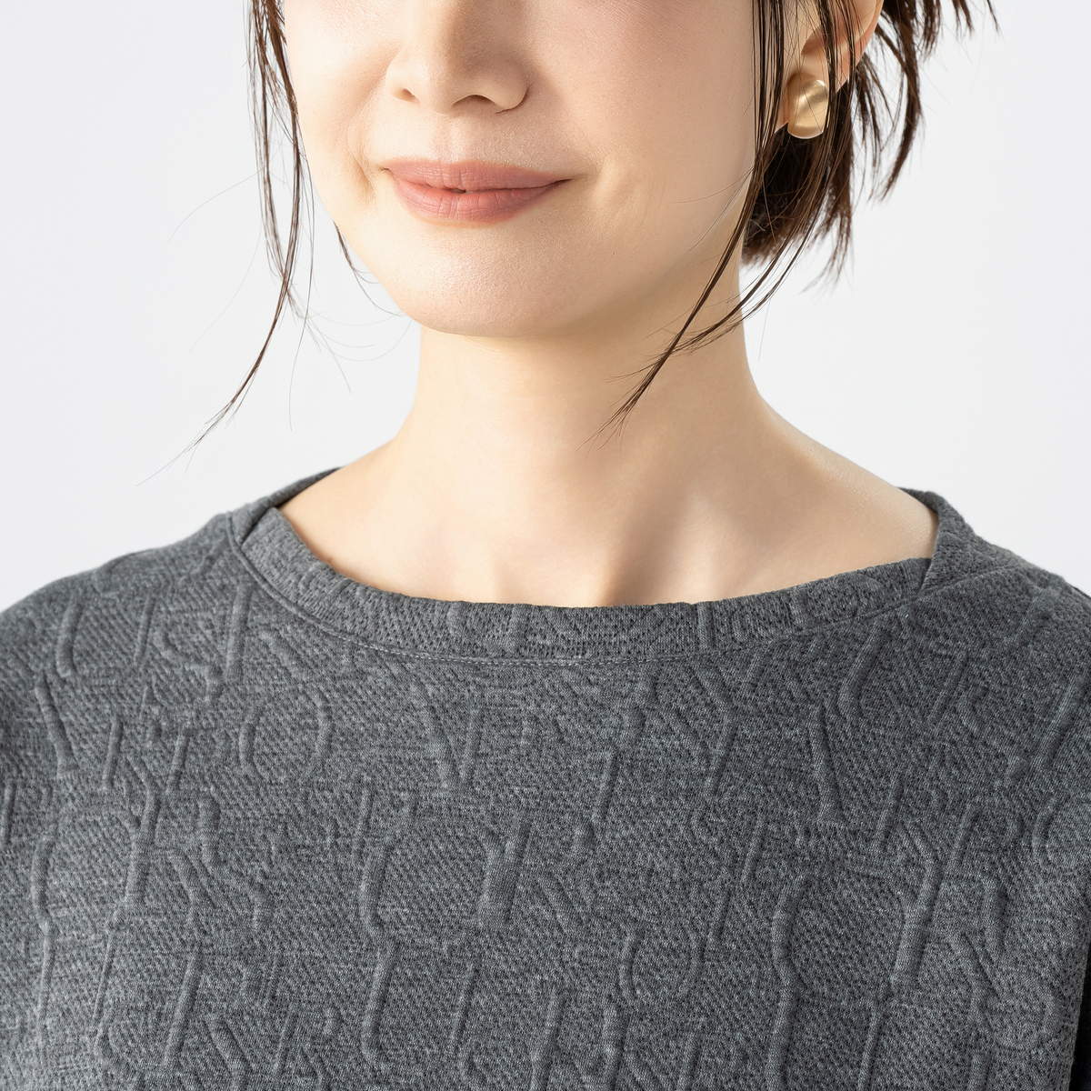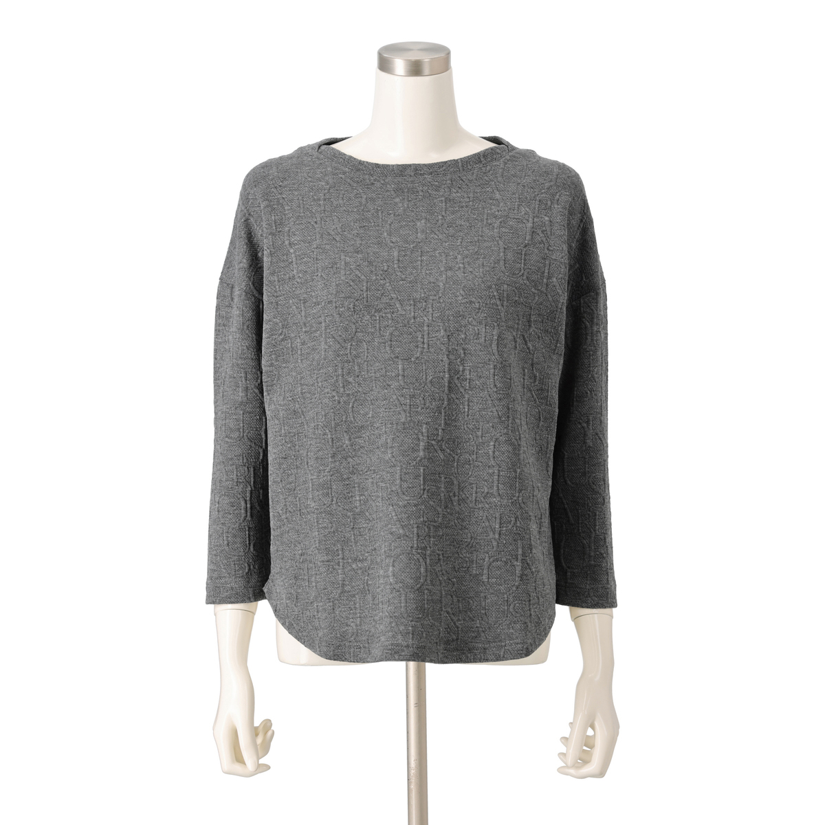 上品に着こなせるジャガード編みプルオーバー。遠目には無地見えしつつ、近くで見るとアルファベット風のさりげない模様がデザイン性を主張します