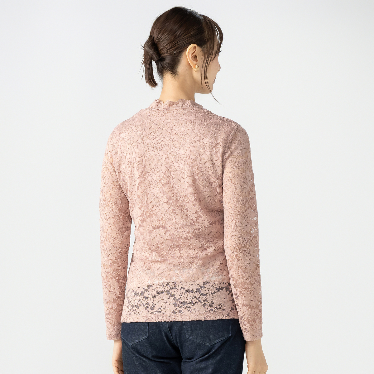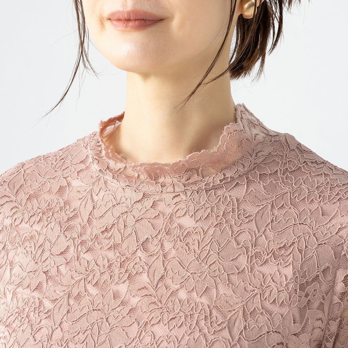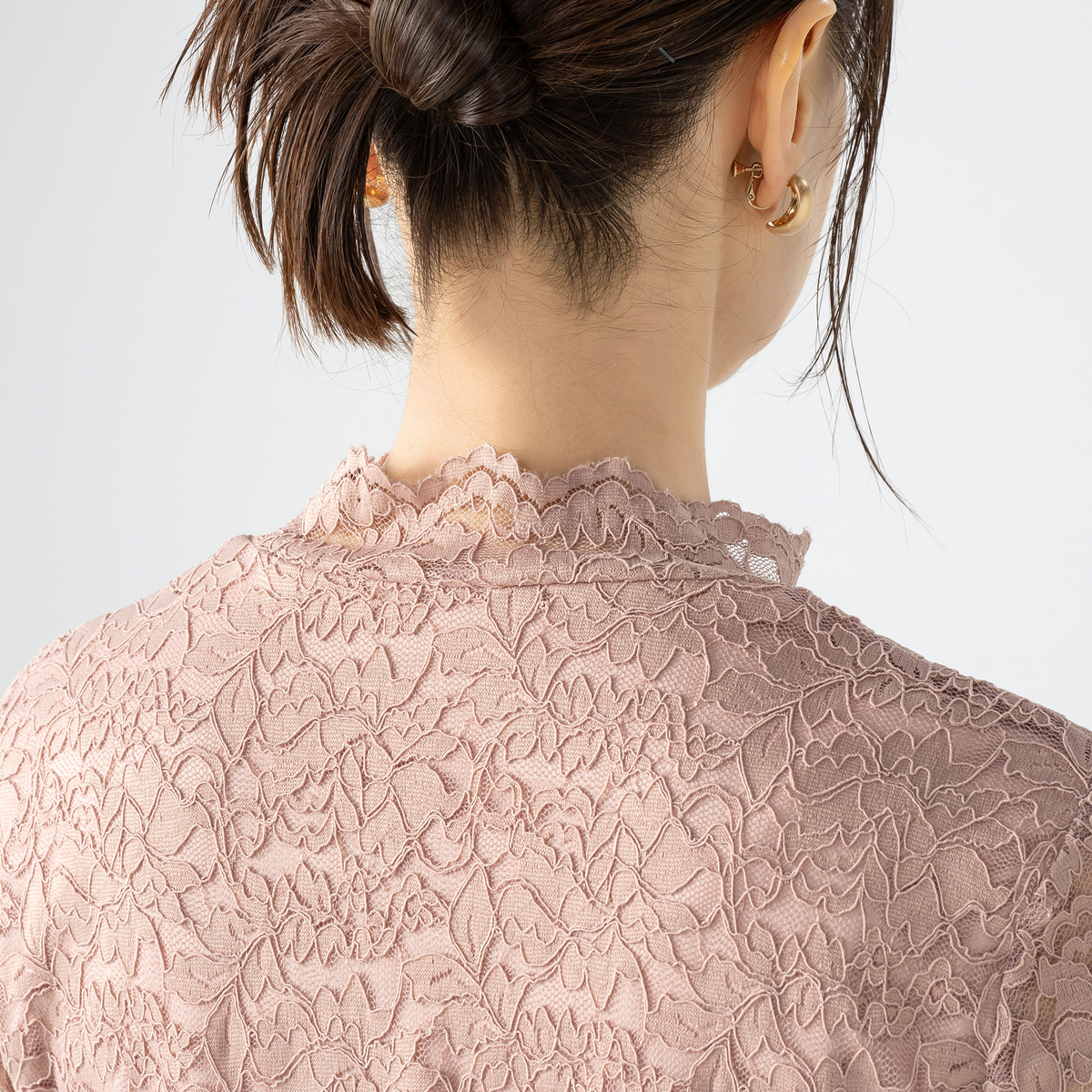 繊細な花柄総レースの長袖プルオーバー。首元のフリルが顔周りを明るく見せ、アクセサリーなしでも華やかさを演出します