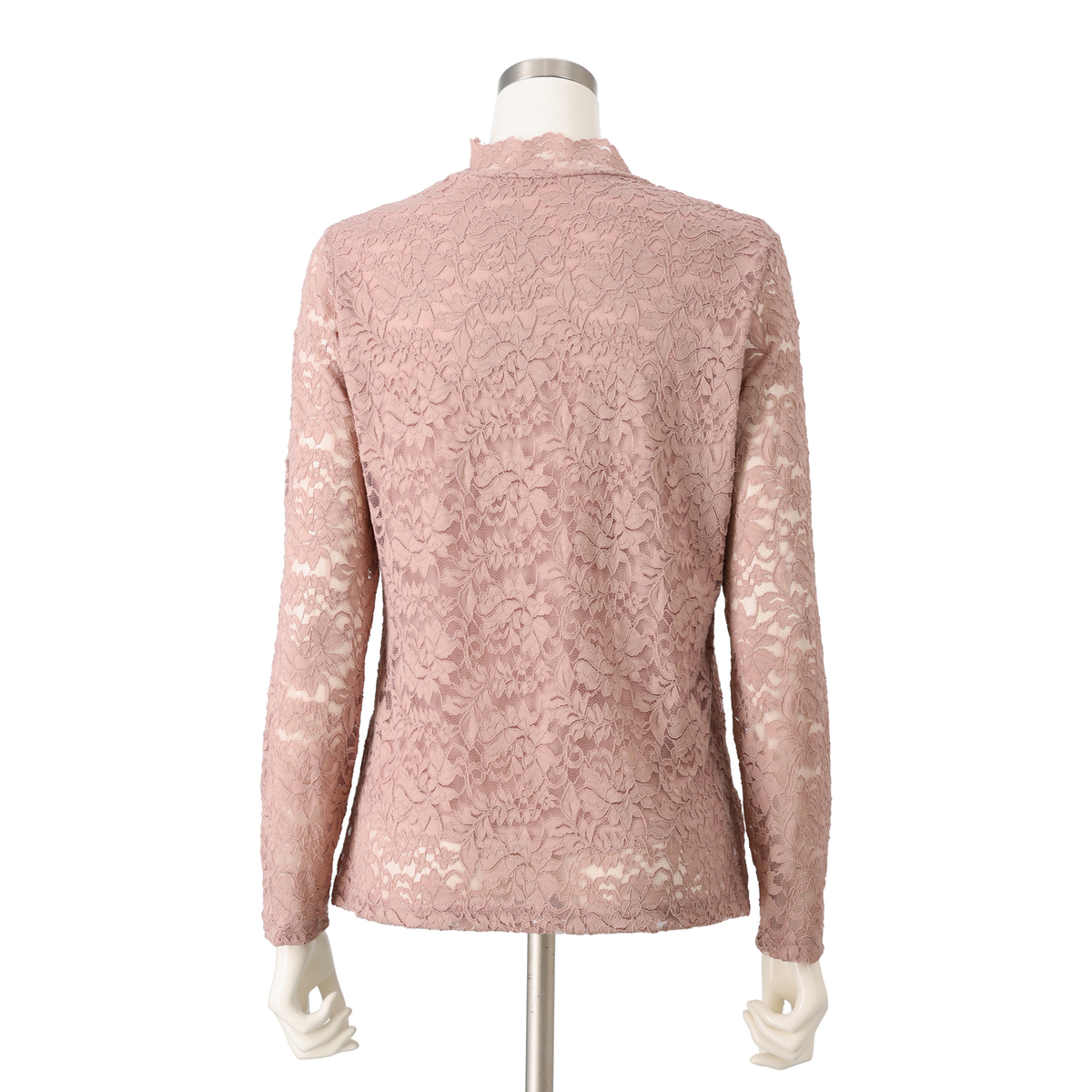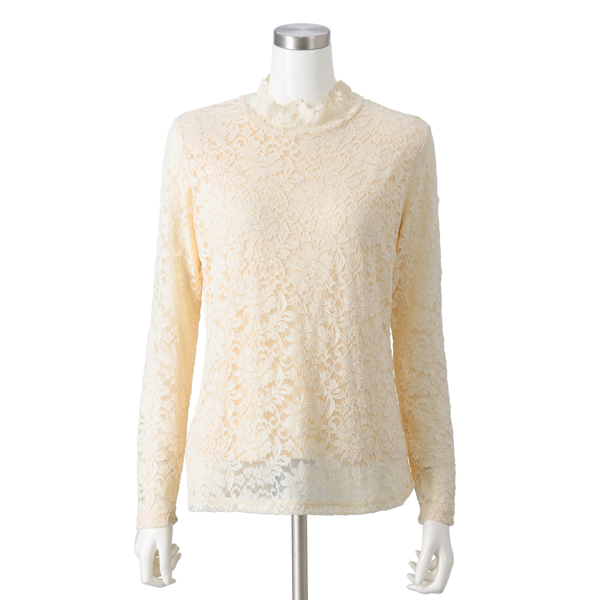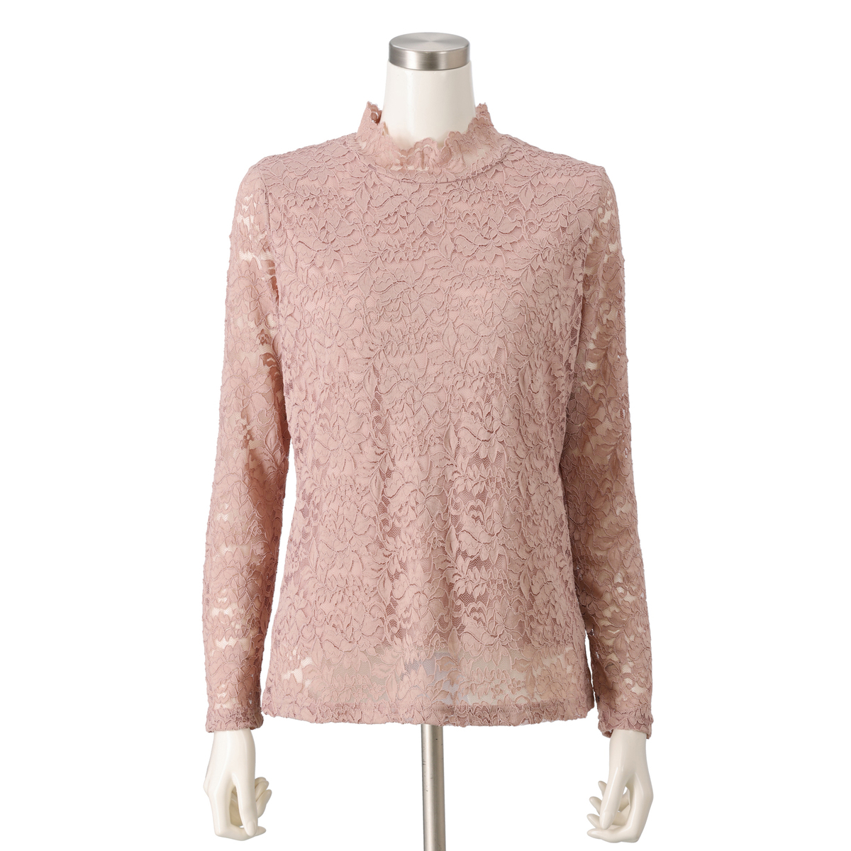 繊細な花柄総レースの長袖プルオーバー。首元のフリルが顔周りを明るく見せ、アクセサリーなしでも華やかさを演出します