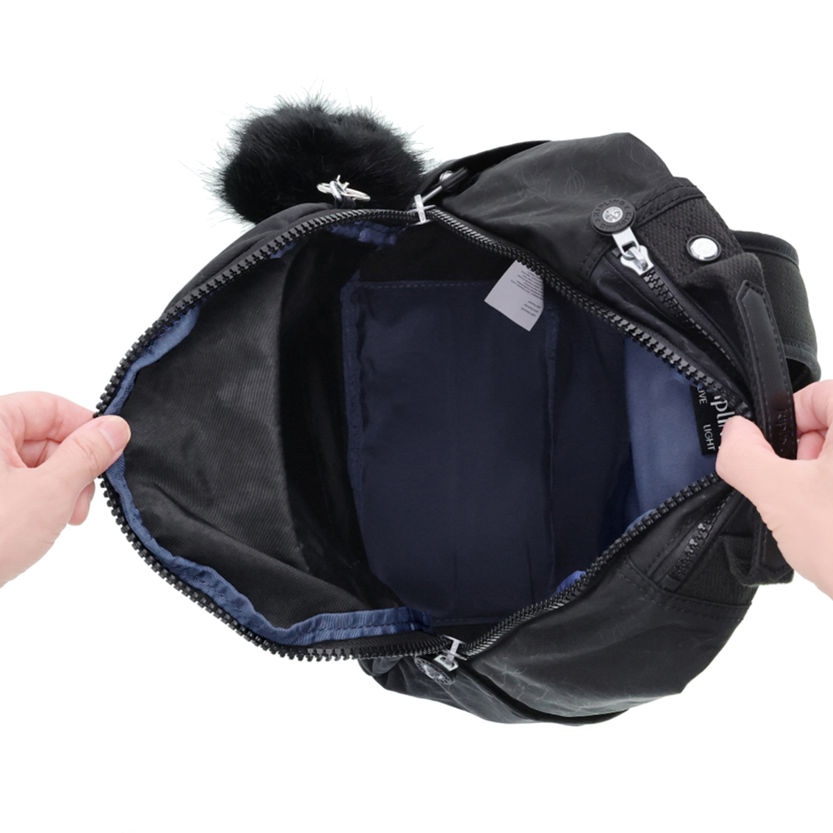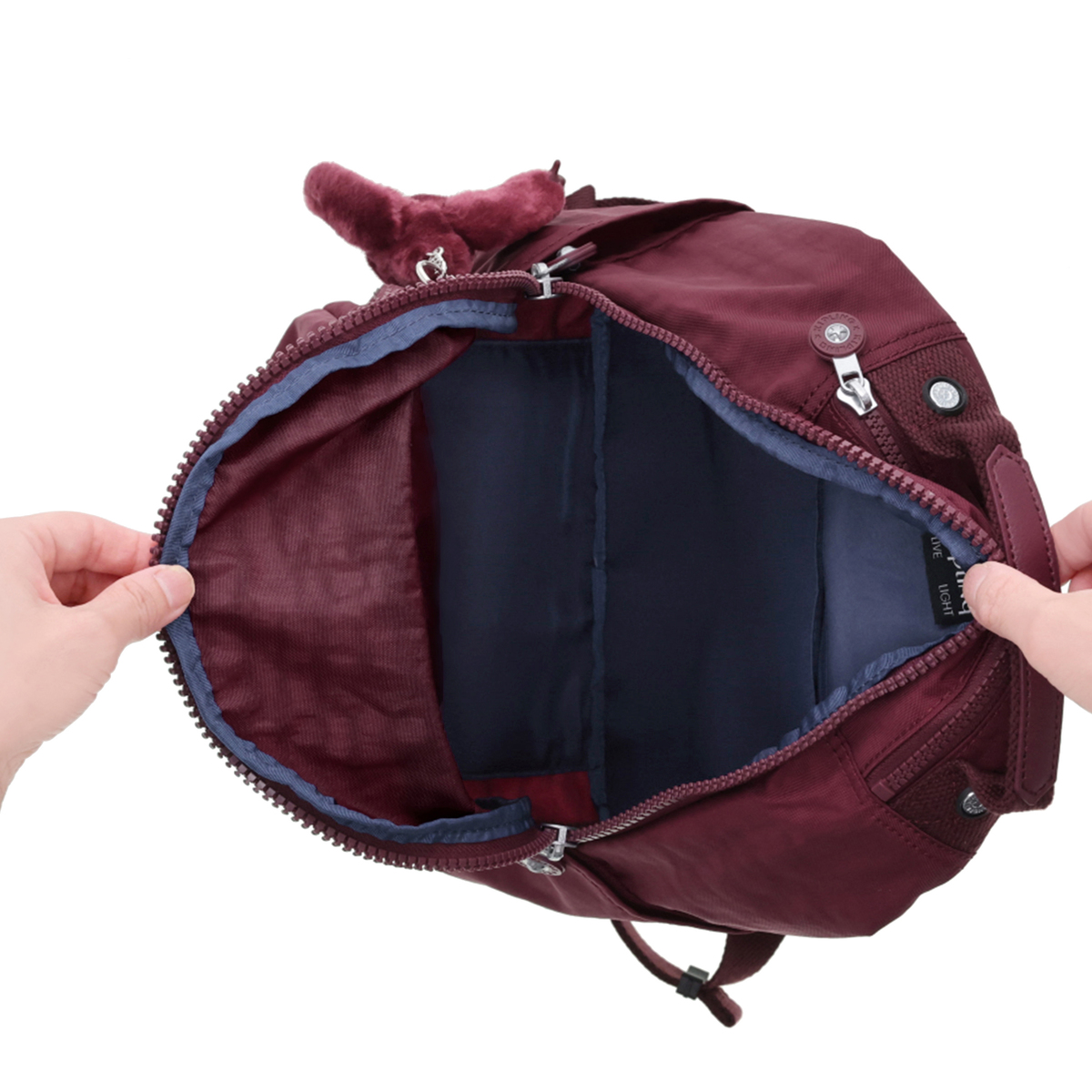 ショルダー、背面部はクッション入りで、肩や背中が痛くなりにくい構造です。底部にもクッションが入っているので型崩れしにくいのもポイント。メインファスナーには引手が2つあり、左右どちらからでも開けることができます