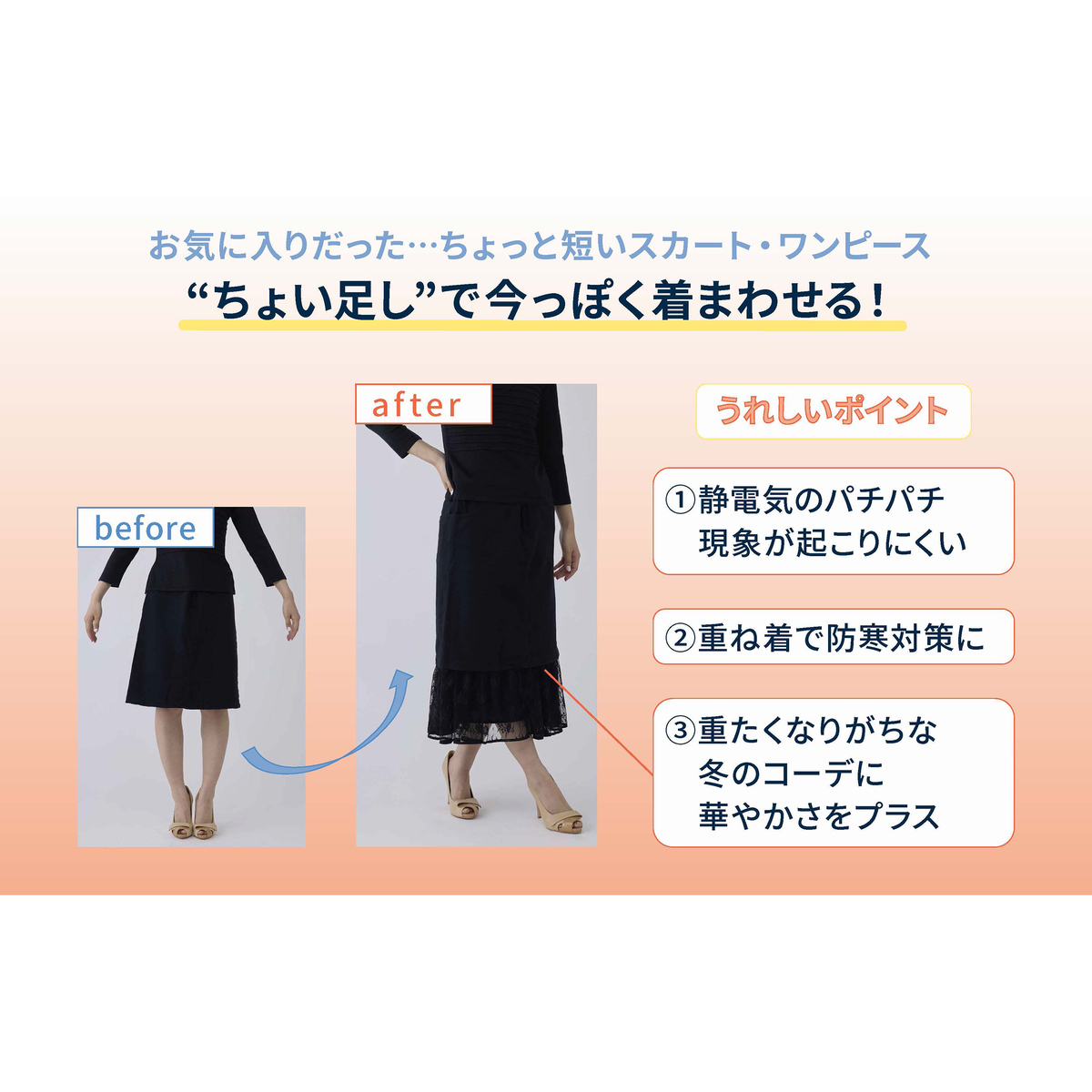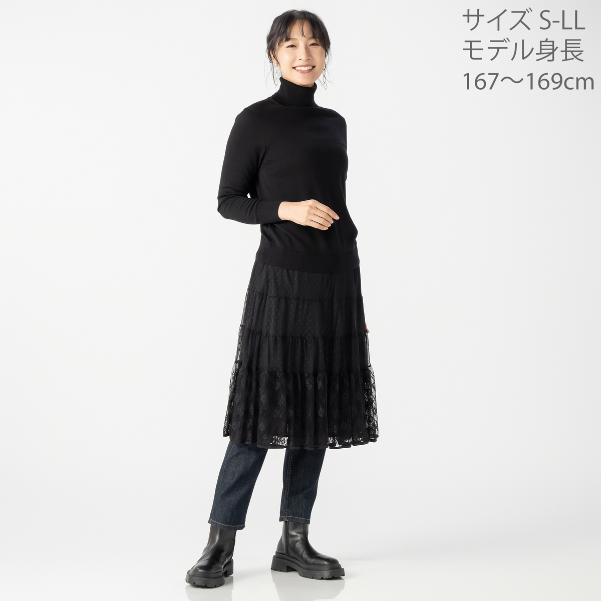 チュニックの裾から見せるレイヤードコーデ、短いワンピースの丈足し、膝まである長いスカート丈が膝隠しとしても活躍。オーバーサイズトップスと組合せてもスカートの切り替えデザインが引き立ちます