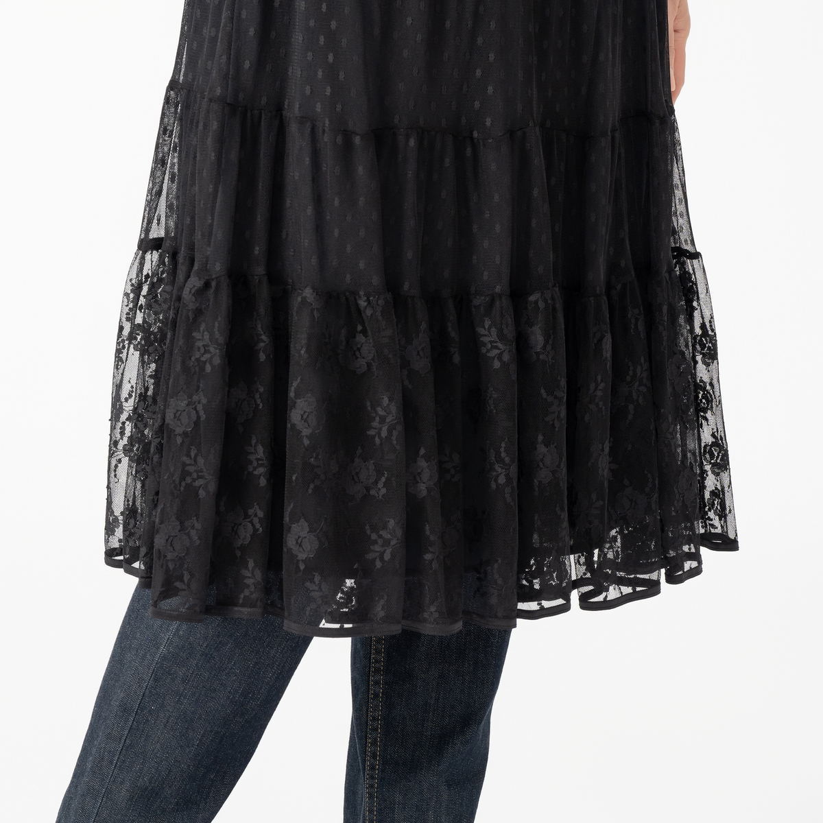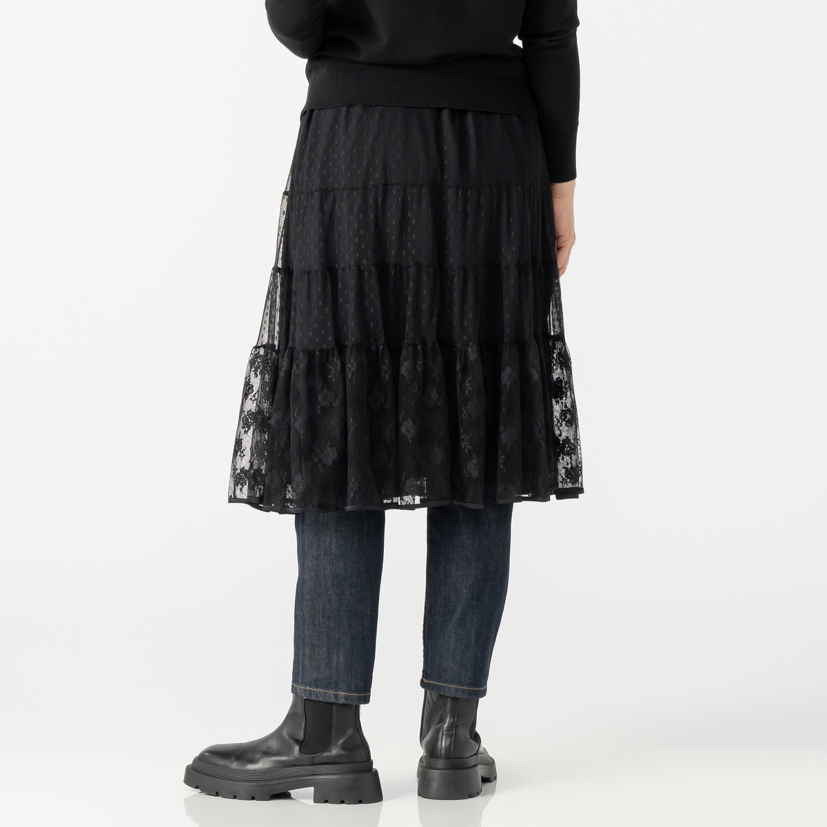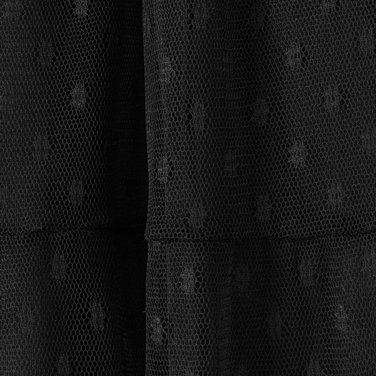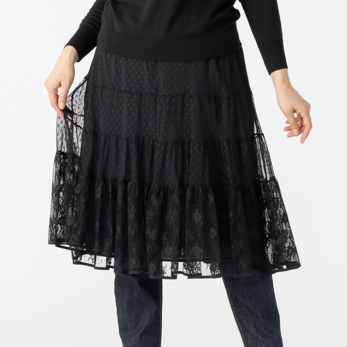 ドット柄と小花柄のチュールレースを使用した重ね着スカート。裾には光沢テープを施し、レースのほつれを防ぎながらデザインのアクセントになっています