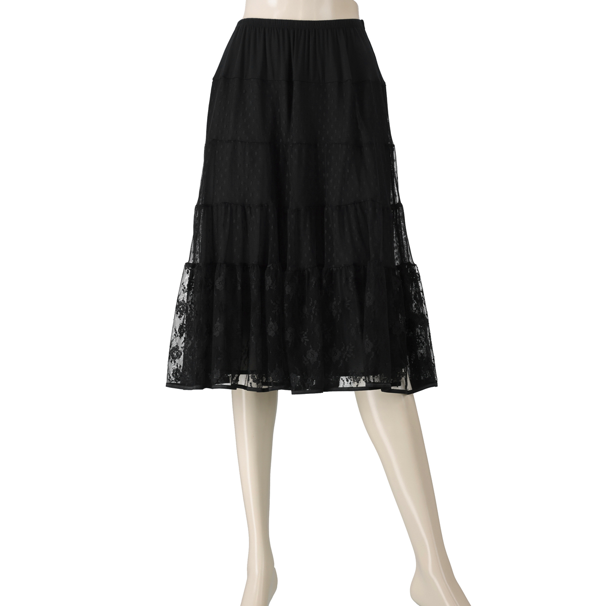裾に向けてチュールレースのギャザー量を徐々に増やしたAラインシルエット。ウエストは伸縮性のインゴム仕様で、脱ぎはきも簡単です