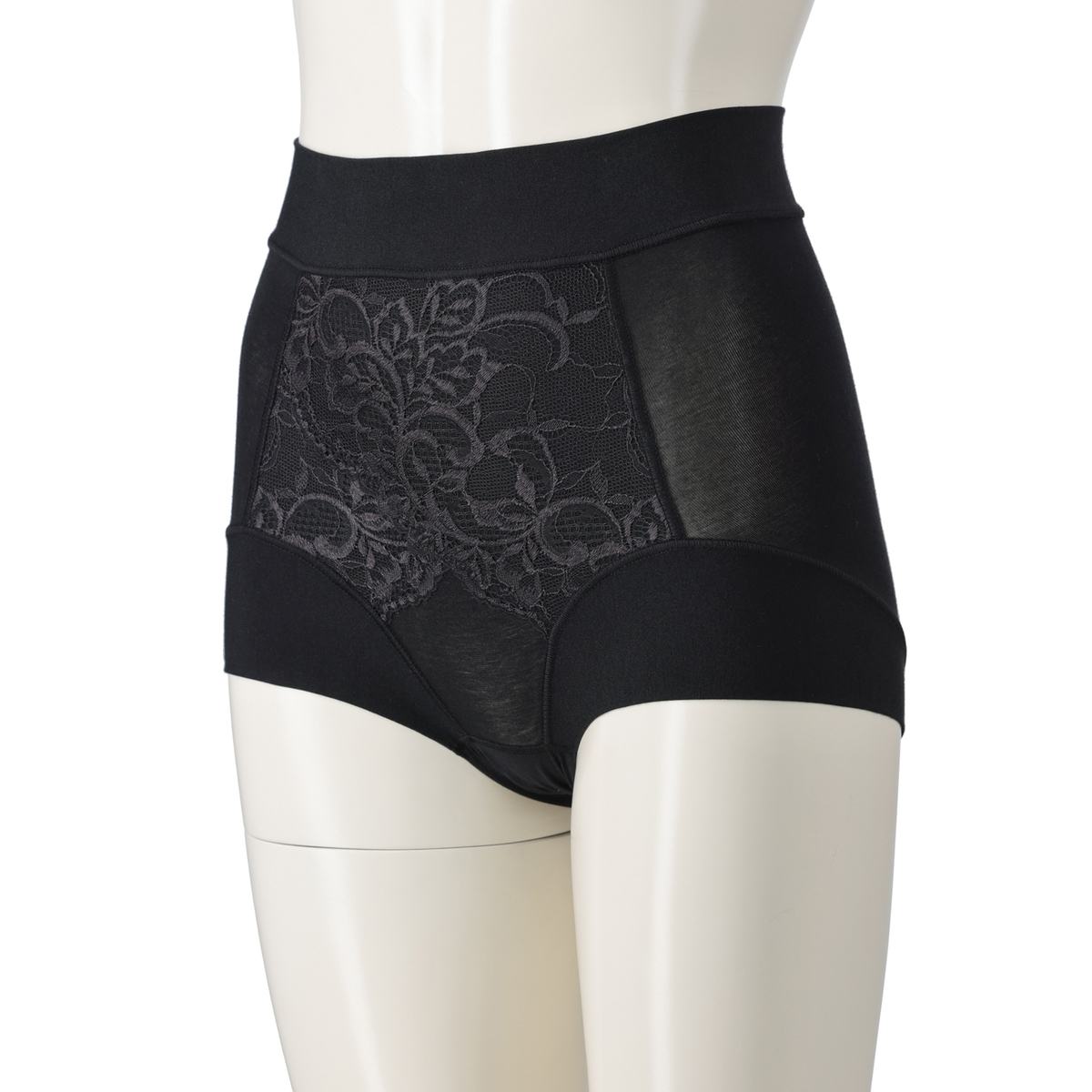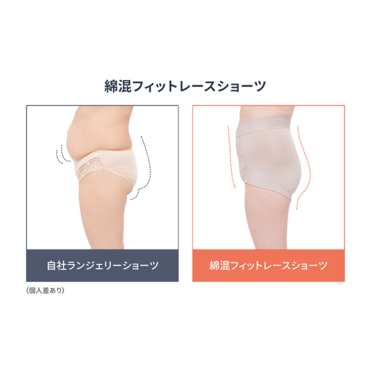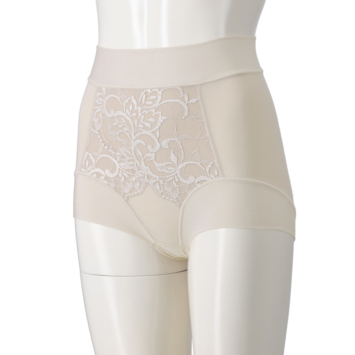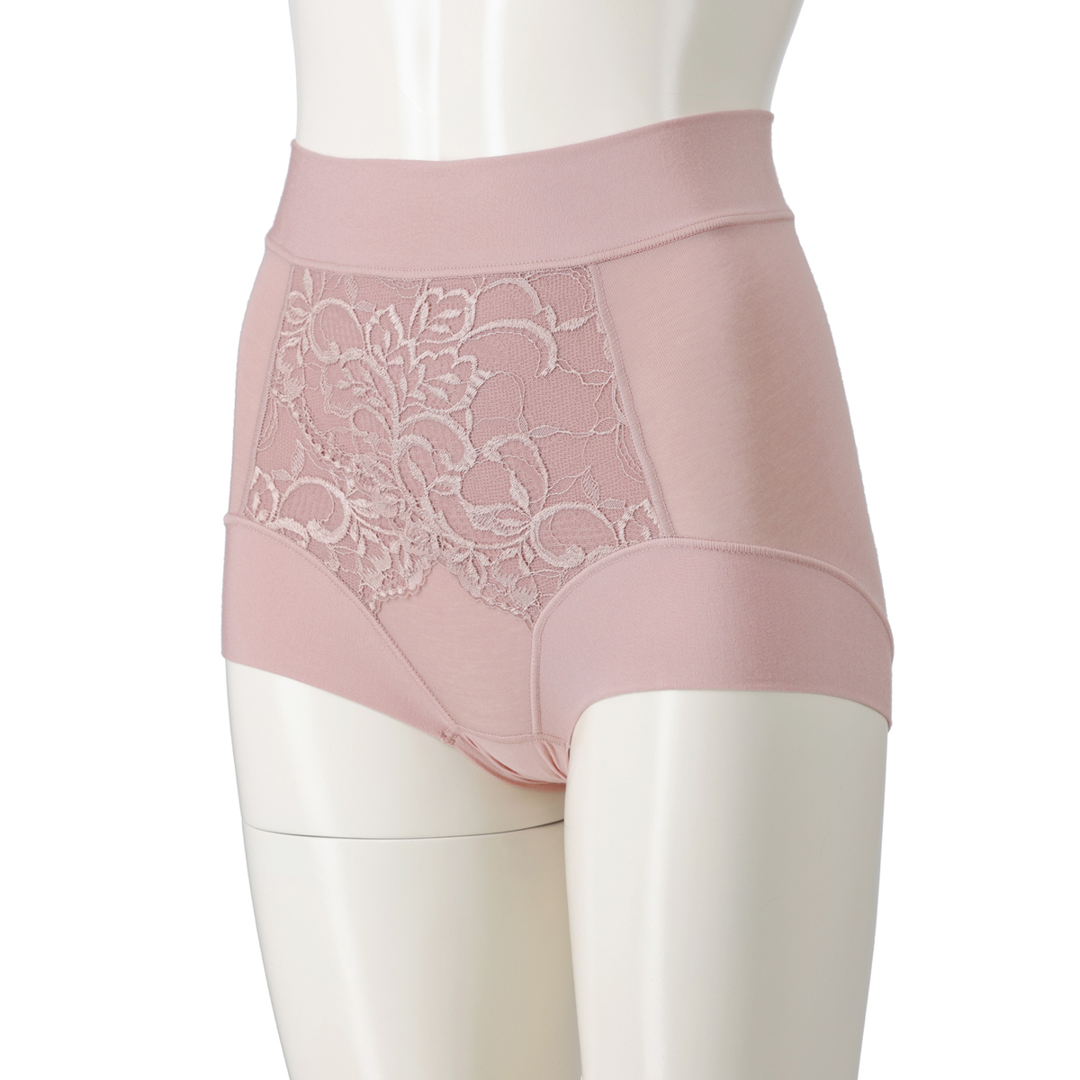 ウエスト部分は身生地を折り返した二重パネル仕様。お腹押さえは、表側のレースと中にサポート力のあるパワーネット、肌側にナイロン綿ベア天竺を重ねた三重構造。レースとパワーネットの位置はおへそから下腹周りに設置し、効果的にお腹を押さえます