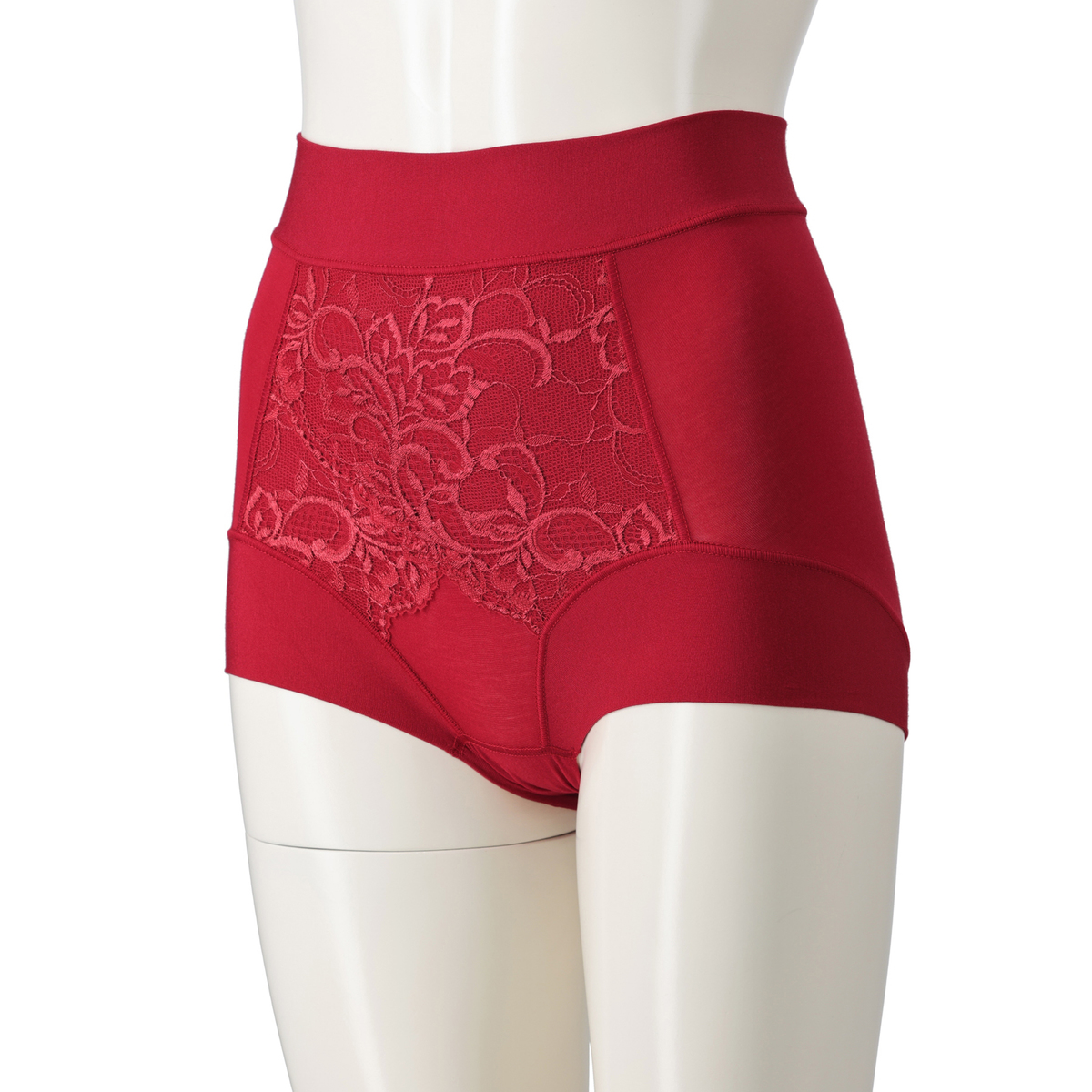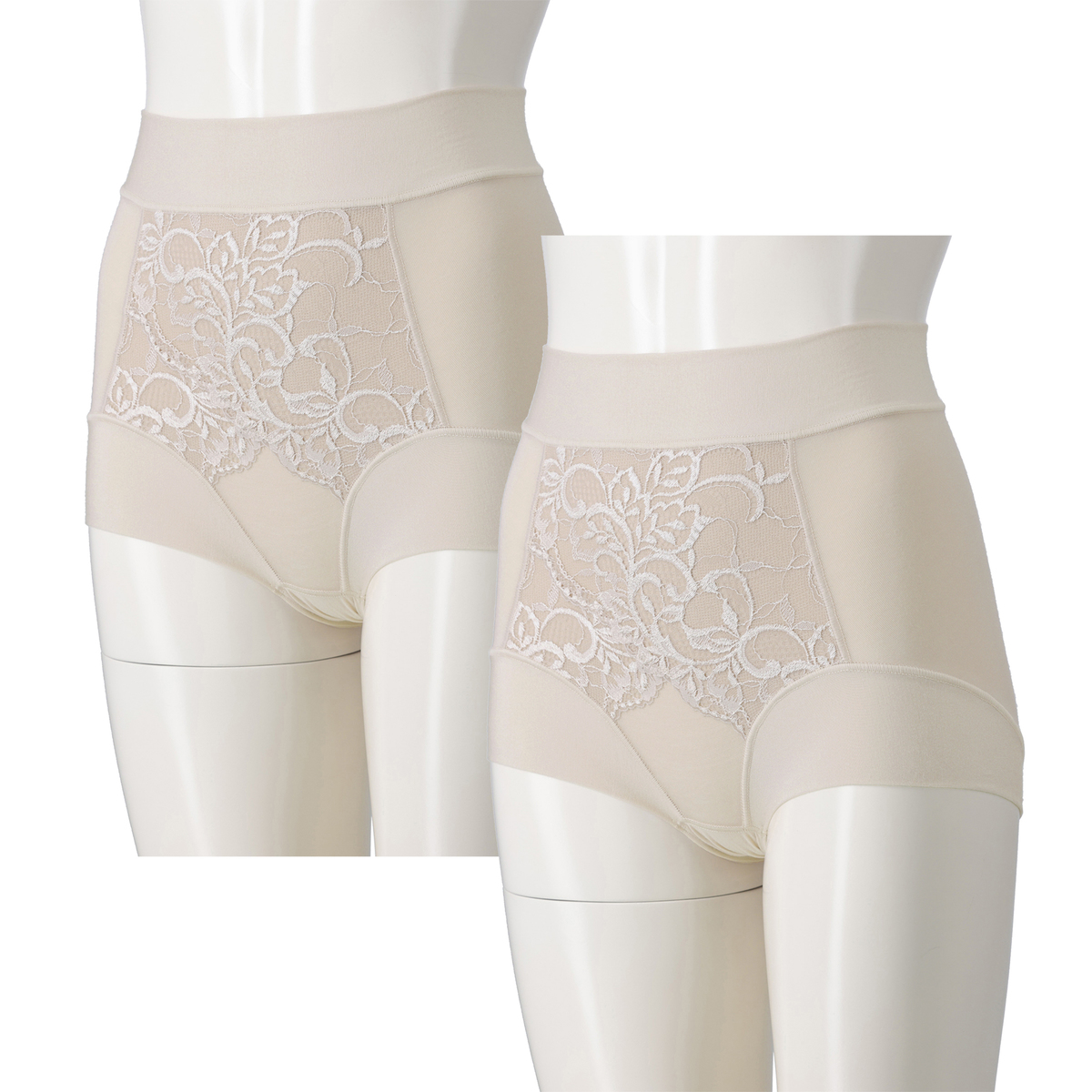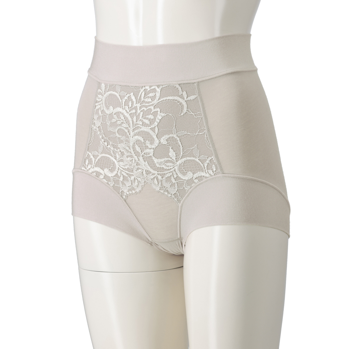 ウエスト部分は身生地を折り返した二重パネル仕様。お腹押さえは、表側のレースと中にサポート力のあるパワーネット、肌側にナイロン綿ベア天竺を重ねた三重構造。レースとパワーネットの位置はおへそから下腹周りに設置し、効果的にお腹を押さえます