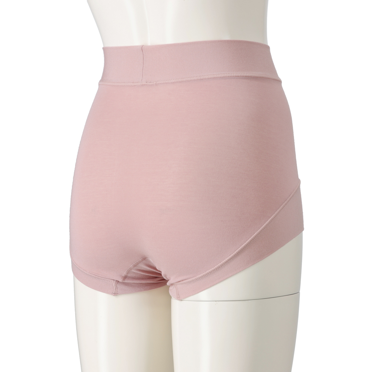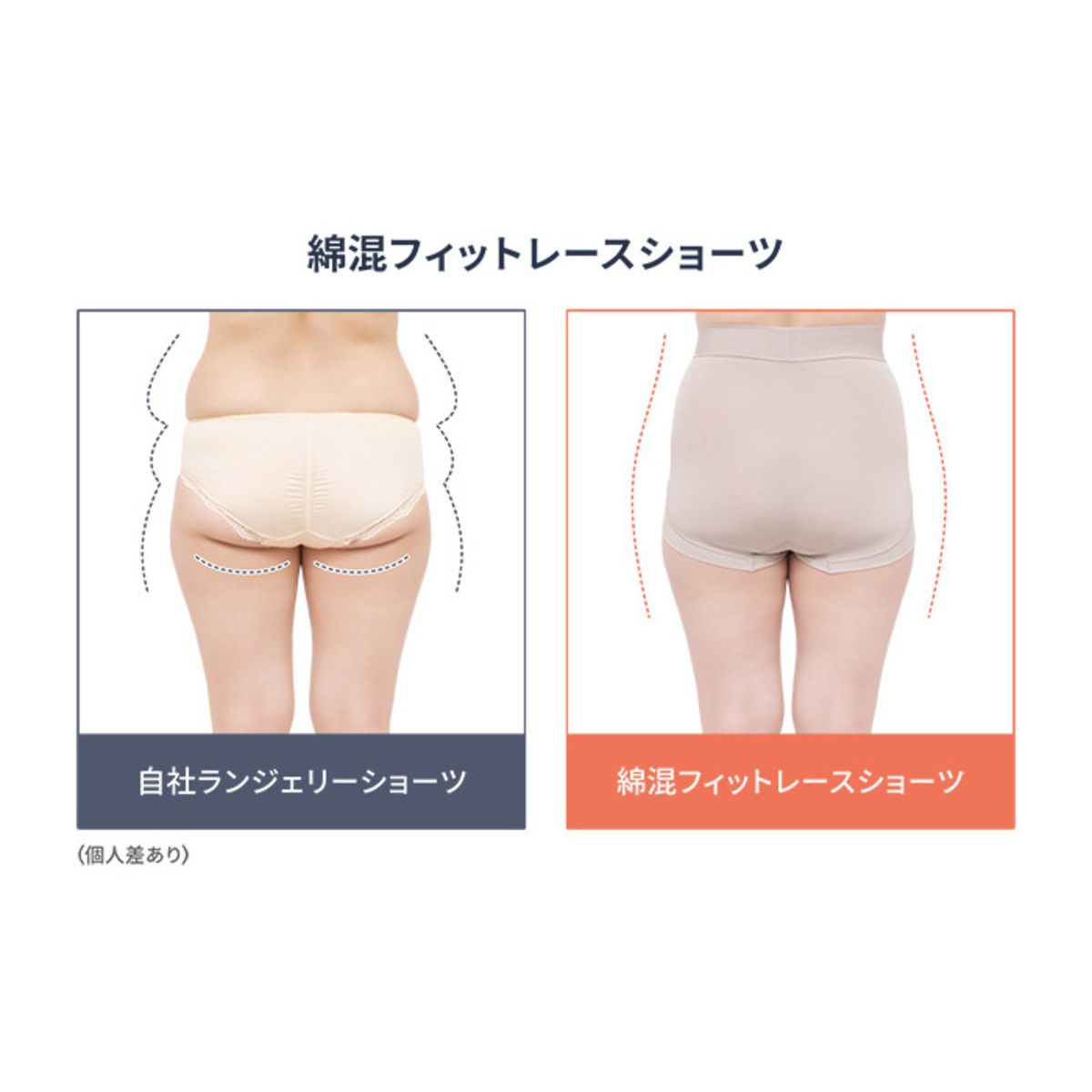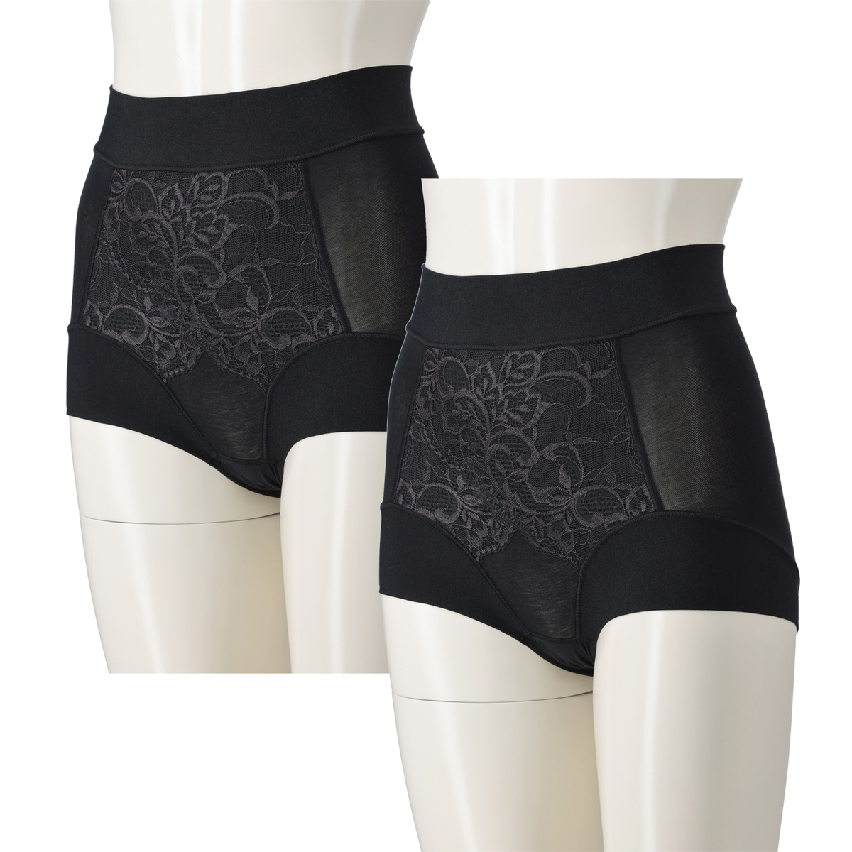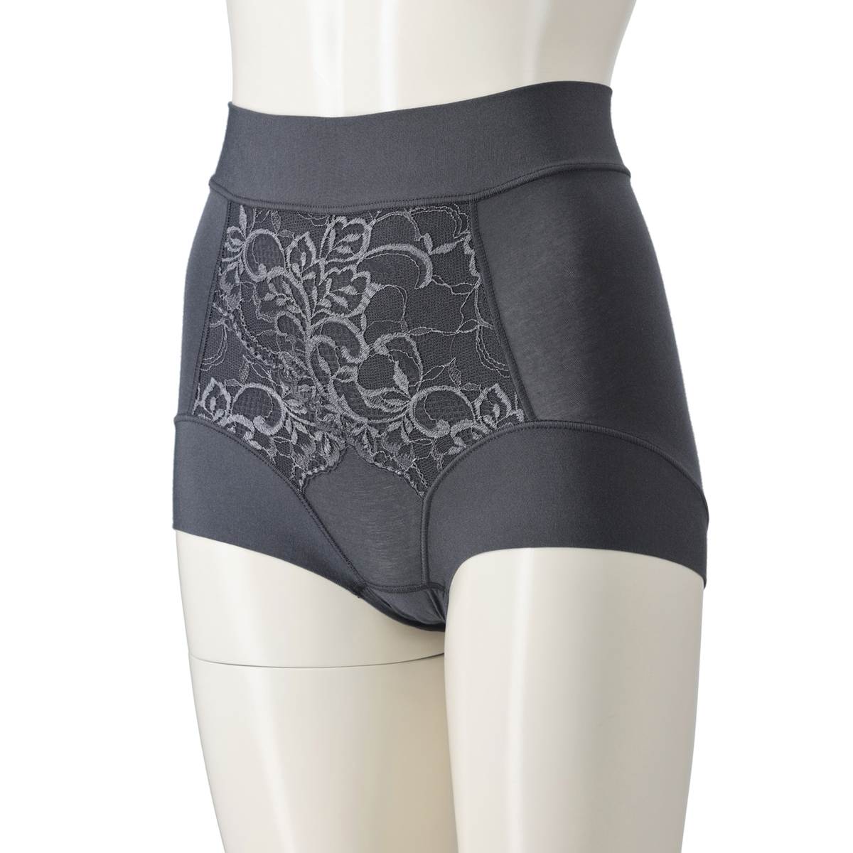 ウエスト部分は身生地を折り返した二重パネル仕様。お腹押さえは、表側のレースと中にサポート力のあるパワーネット、肌側にナイロン綿ベア天竺を重ねた三重構造。レースとパワーネットの位置はおへそから下腹周りに設置し、効果的にお腹を押さえます