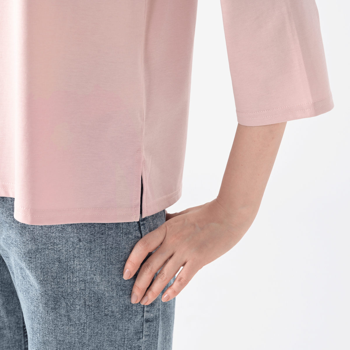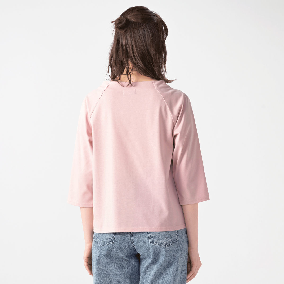 程よい高さのボトルネックが首まわりを綺麗に見せ、カジュアルなのにどこか上品な印象をプラス。袖は手元をすっきり見せつつ、ロングシーズン使える丈感です。生地には、さらっと肌離れのよい綿ポリエステルスムース素材を使用しています