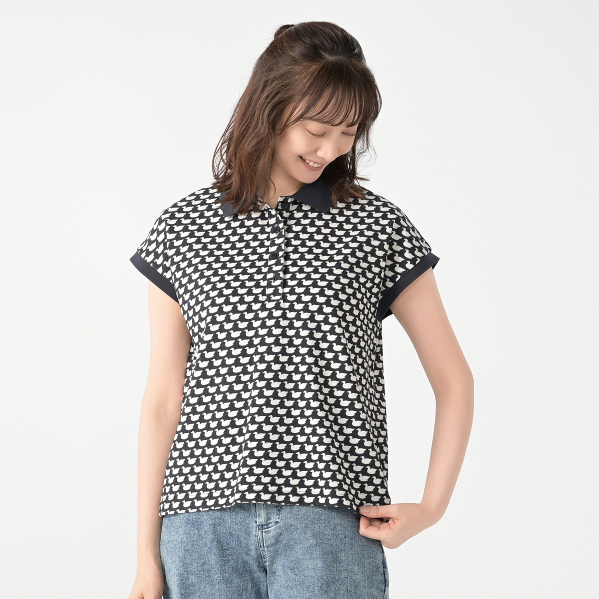 見ているだけで気分が上がる、遊び心たっぷりのカモモチーフをプリントしたポロシャツです。大人可愛いを楽しめる絶妙な総柄プリントで、ポロシャツのきちんと感に遊び心を添えて、甘すぎない大人のカジュアルを演出しています