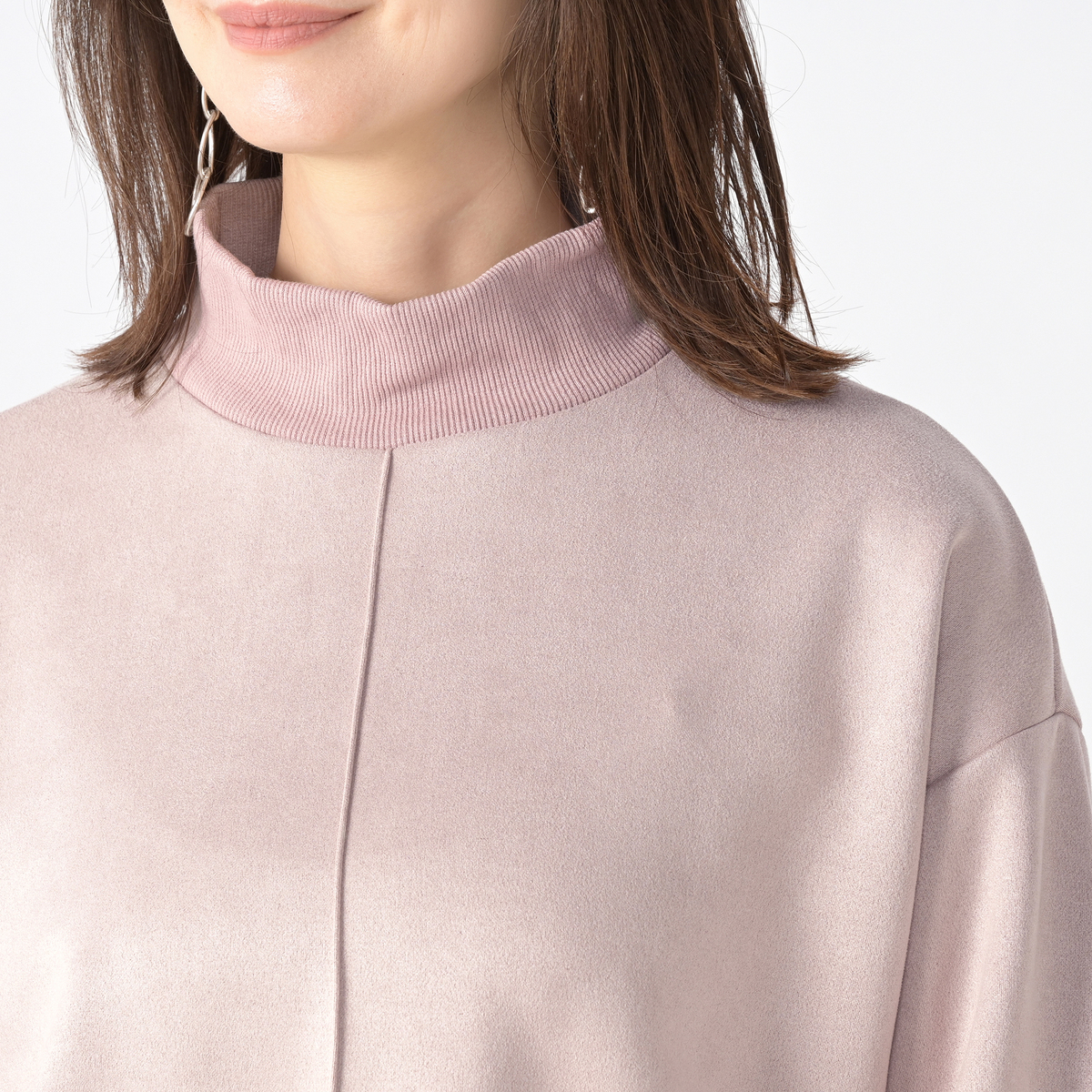 前身頃のセンターにピンタックが縦のラインを強調。ハイネックの襟と袖口はリブ素材を使い、カジュアル感をプラスしました