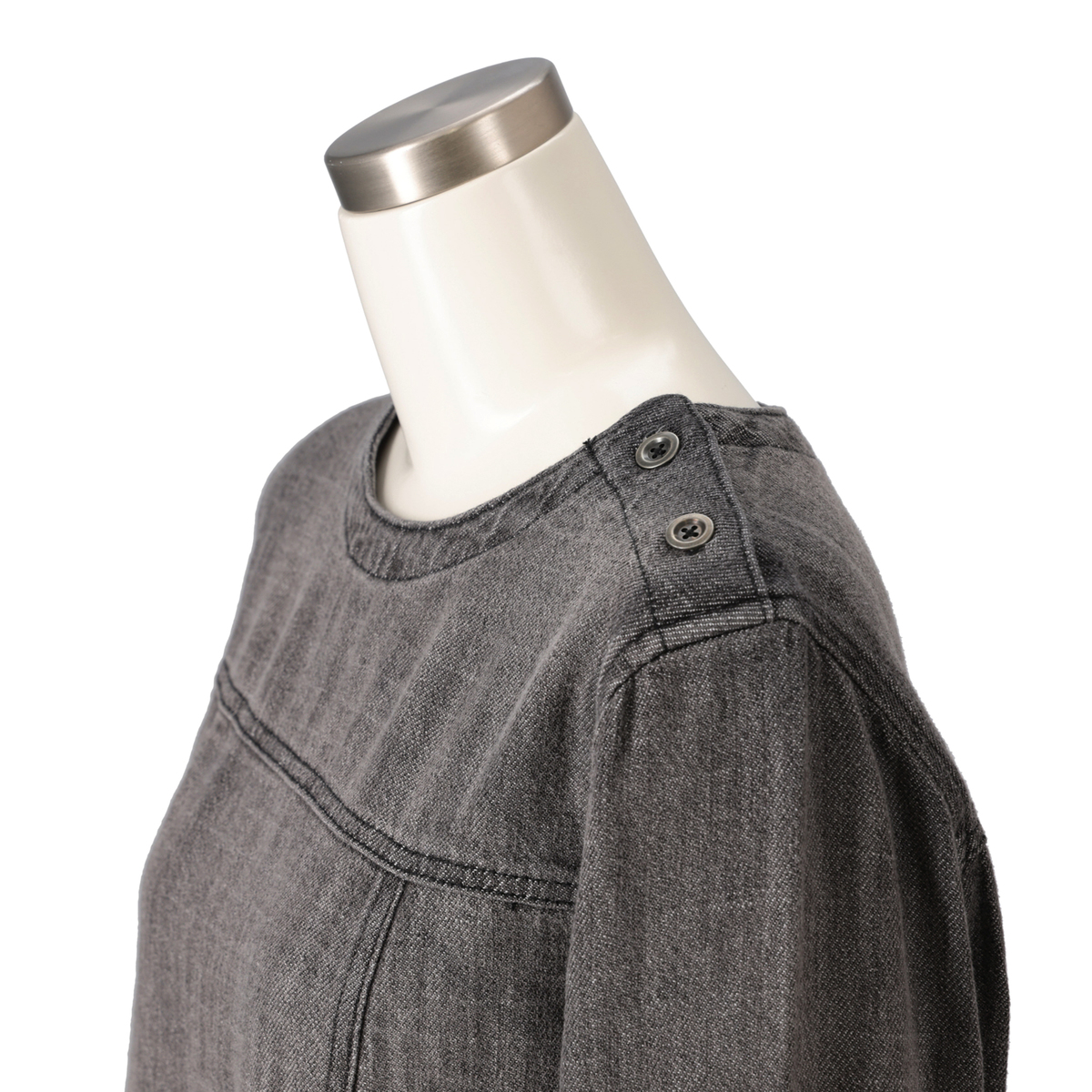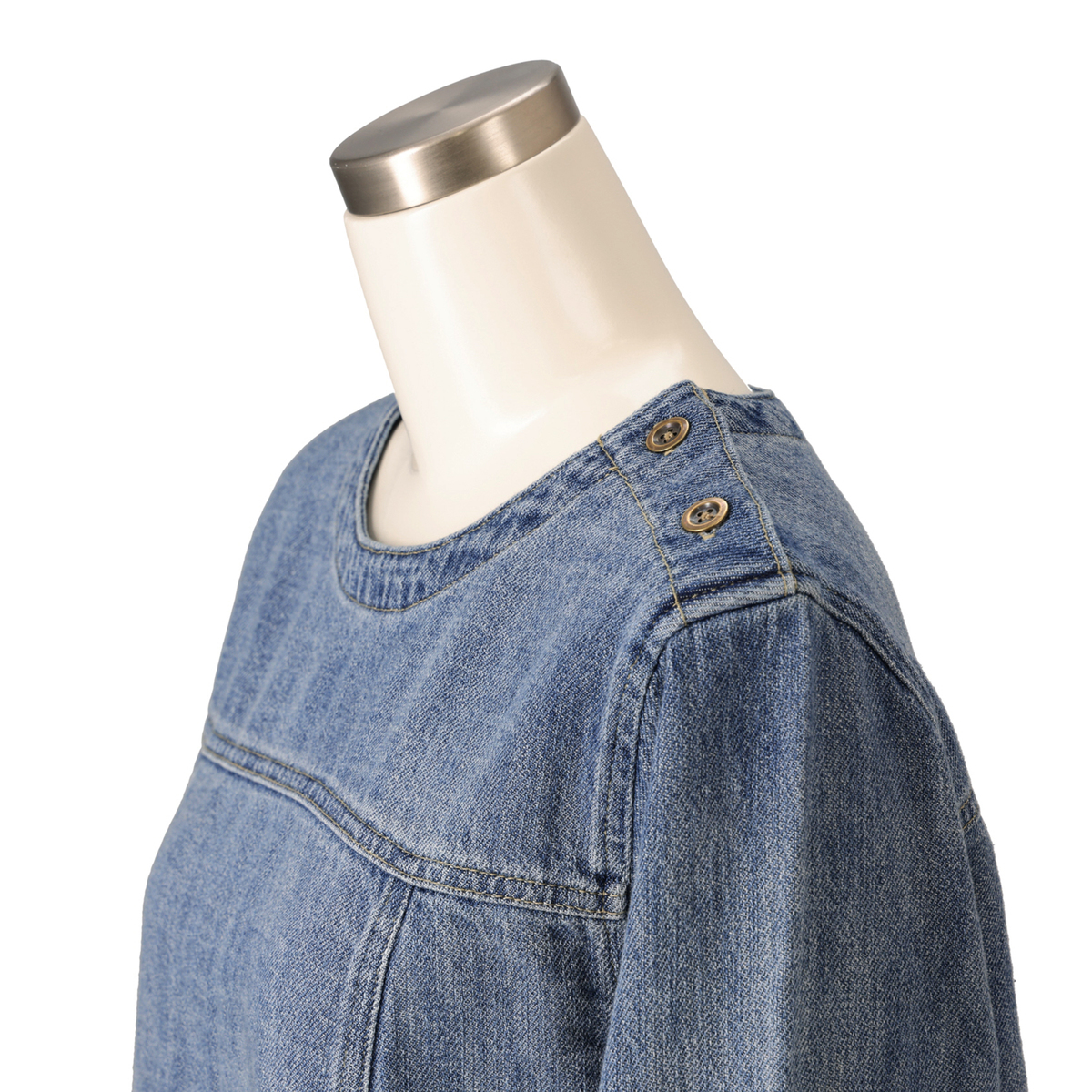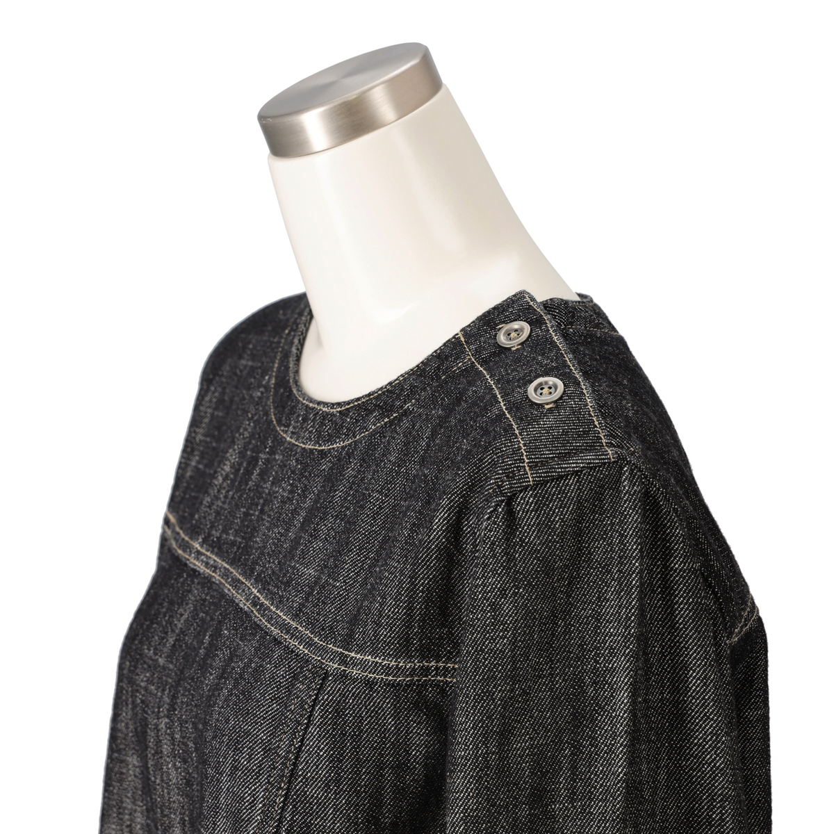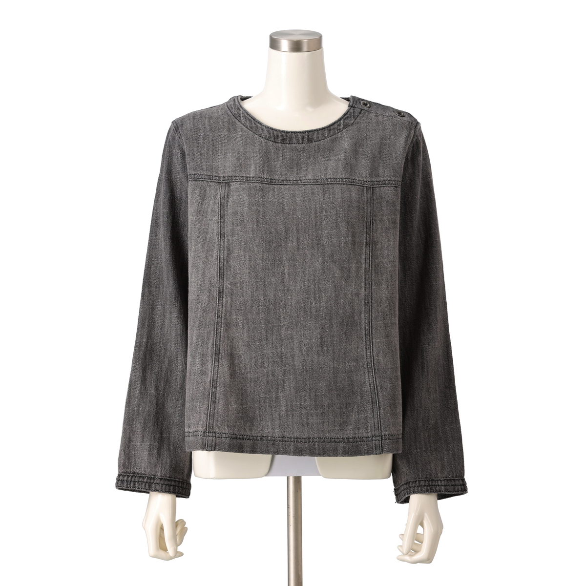 柔らかな甘織りデニム素材を使用したブラウス。ふんわりとした膨らみと軽やかな着心地。ネイビーやブラックは洗い加工で自然な風合いに、グレーやケミカルカラーはブリーチ加工でこなれた印象に仕上げています