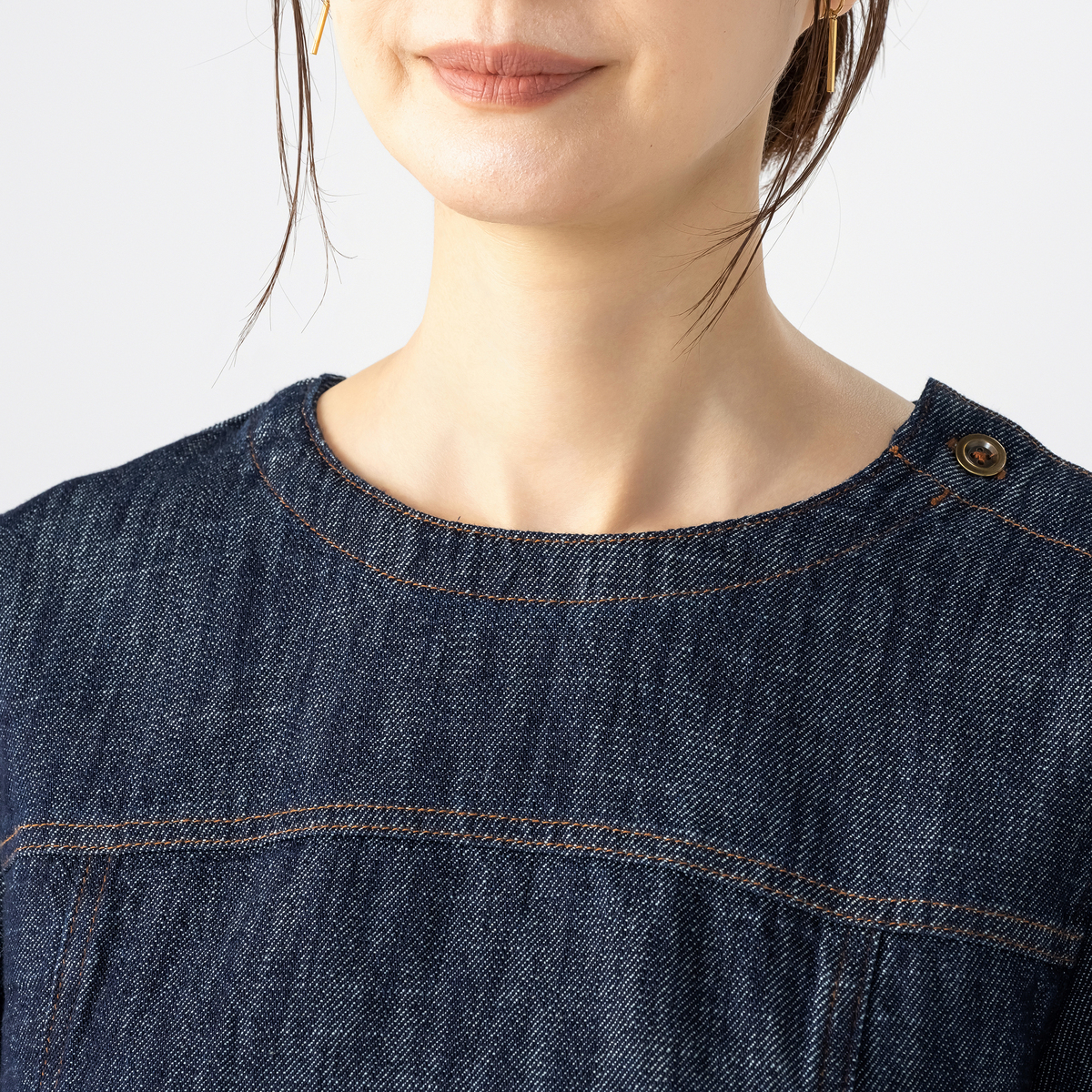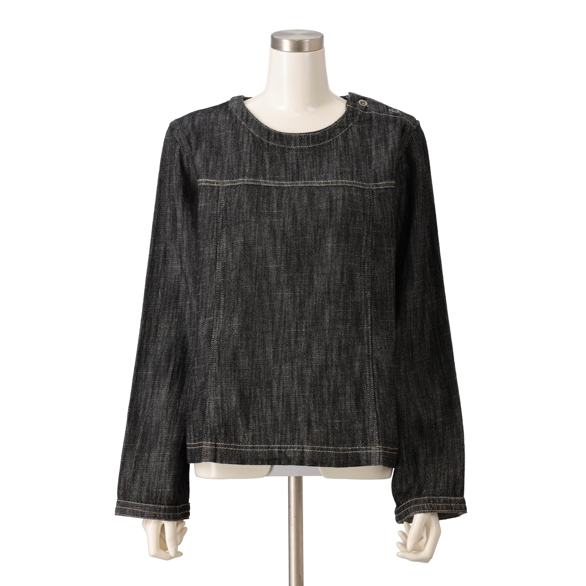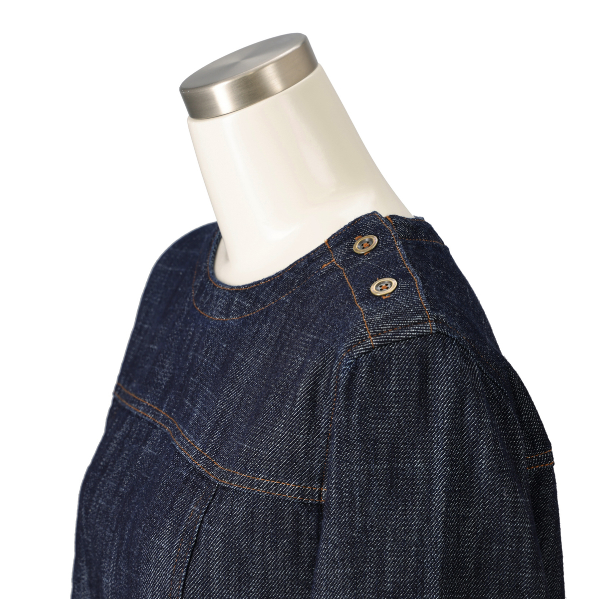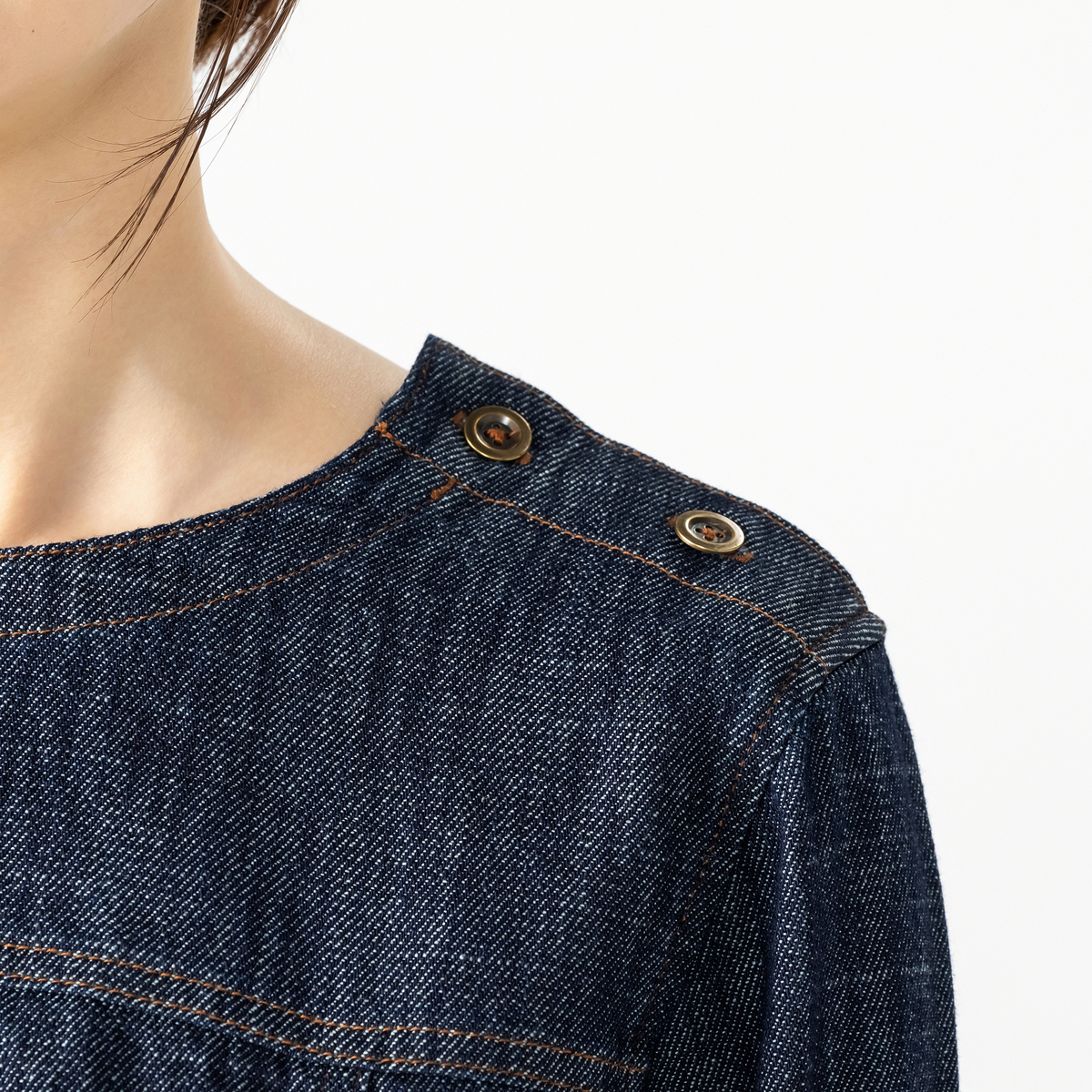 柔らかな甘織りデニム素材を使用したブラウス。ふんわりとした膨らみと軽やかな着心地。ネイビーやブラックは洗い加工で自然な風合いに、グレーやケミカルカラーはブリーチ加工でこなれた印象に仕上げています