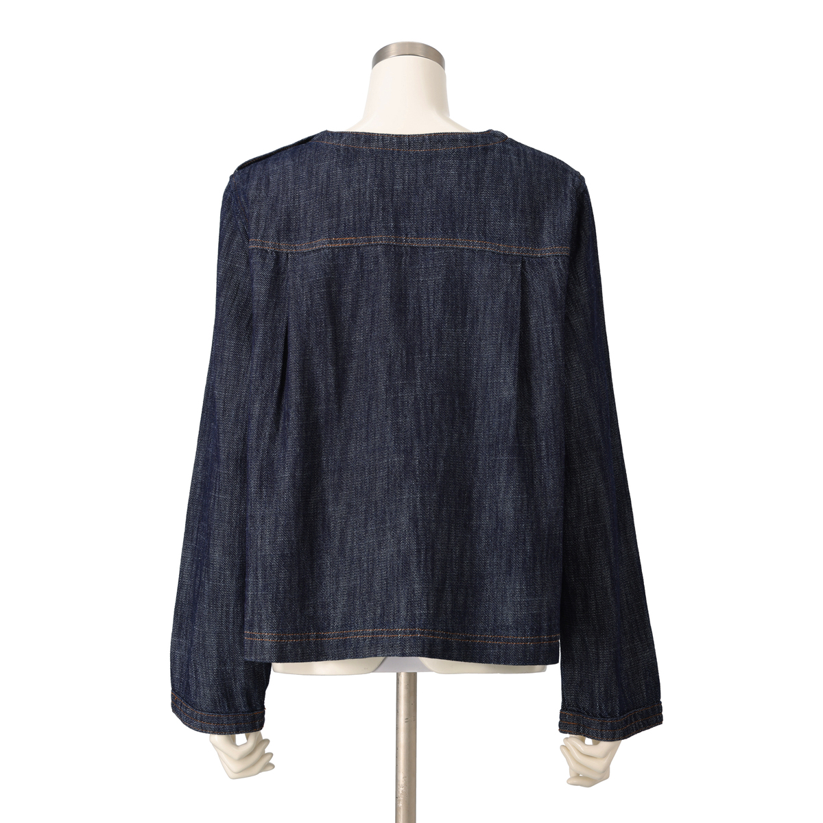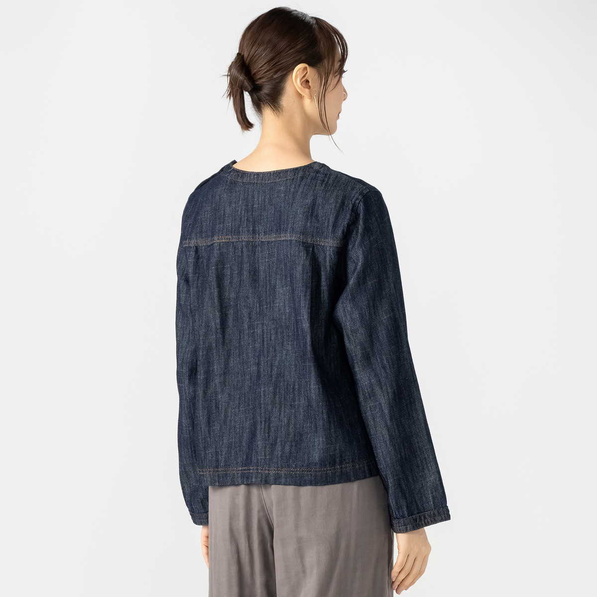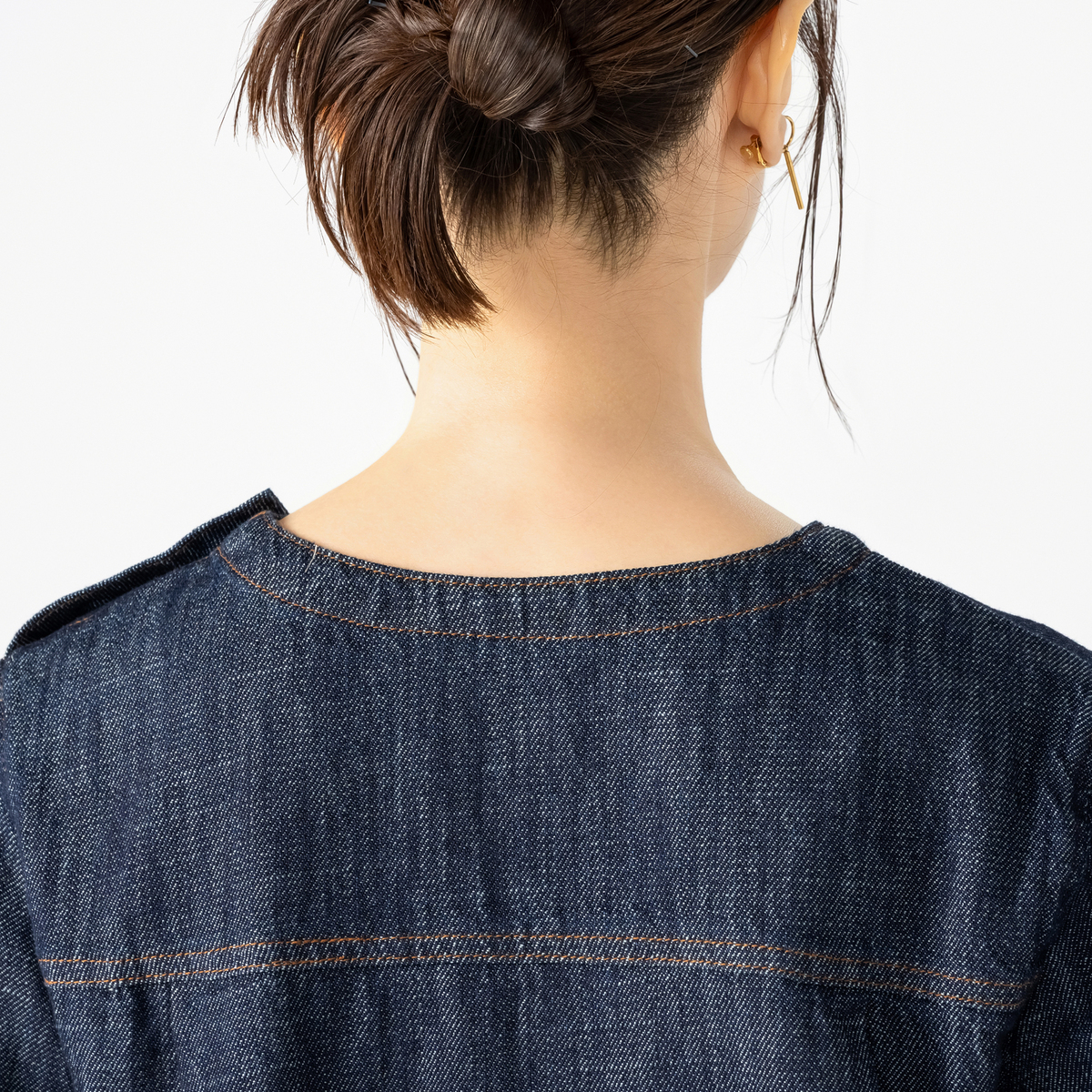 裾に向かって広がるクロップド丈のトップスは、すっきりとしたラインでボリュームのあるボトムスとも好相性です。衿ぐりはシンプルなラウンドラインを見返し始末で、左肩のメタルボタンと合わせてきちんと感のある仕上がりです