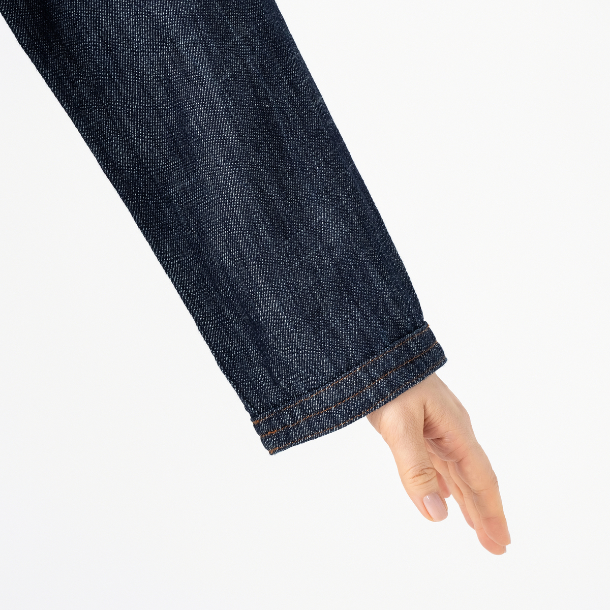 前後身頃のヨーク切替えと前身両サイドにパネル切替えを施し、配色ダブルステッチでメリハリを効かせています。袖は程よいゆとり感で、袖口の3本ステッチがデニムならではのラフさを出しています