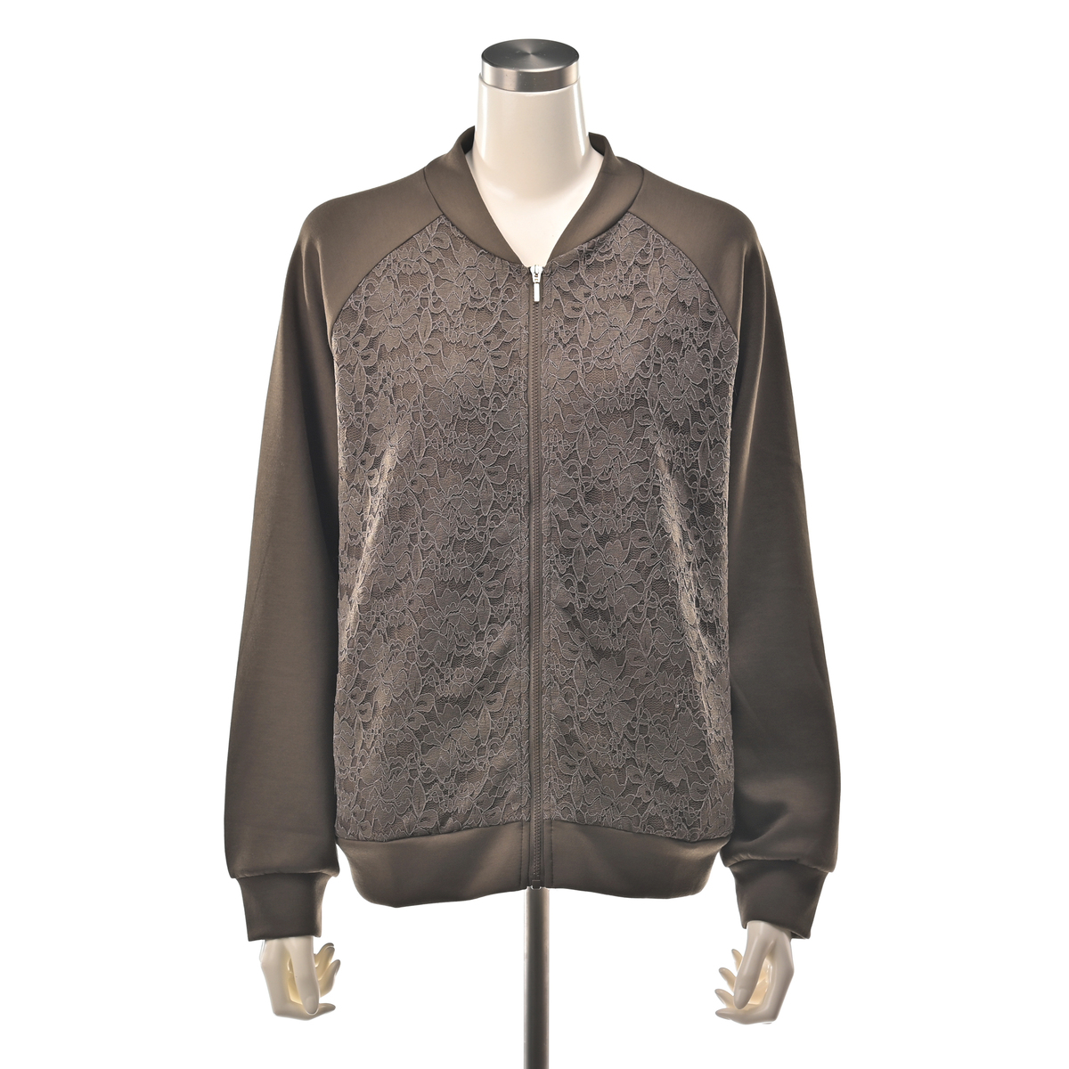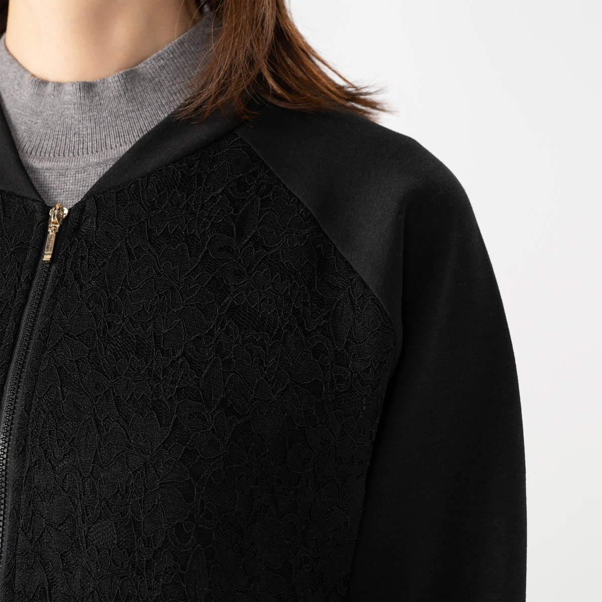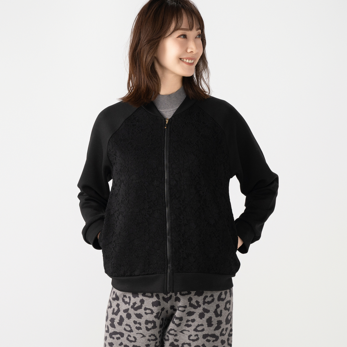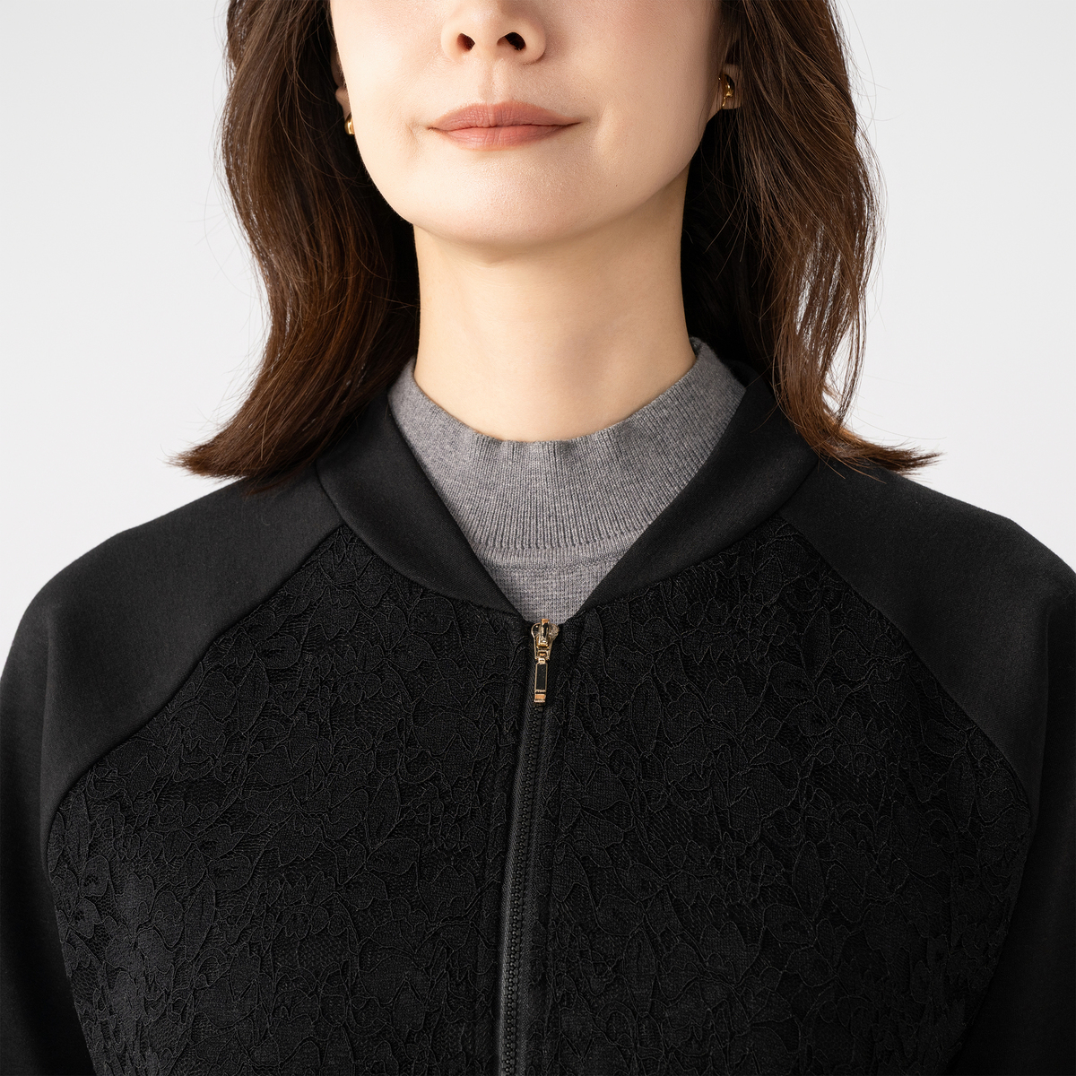 モチっとしたダンボールカットソーで仕立てたブルゾン。前身頃にボタニカル柄のストレッチラッセルレースを重ね、華やかに仕上げました。レースは本体と同色なのでコーディネートしやすく、着回しに活躍してくれます