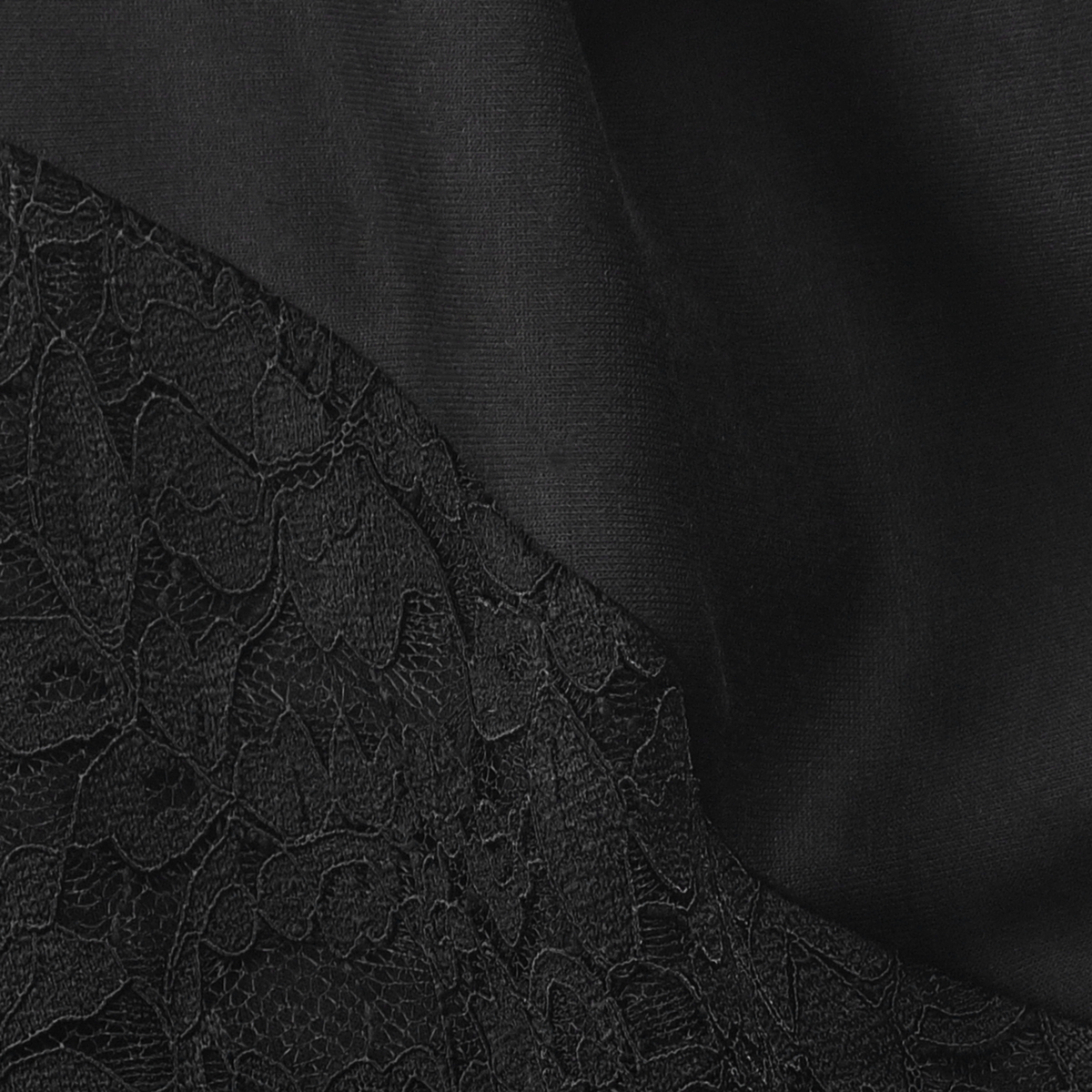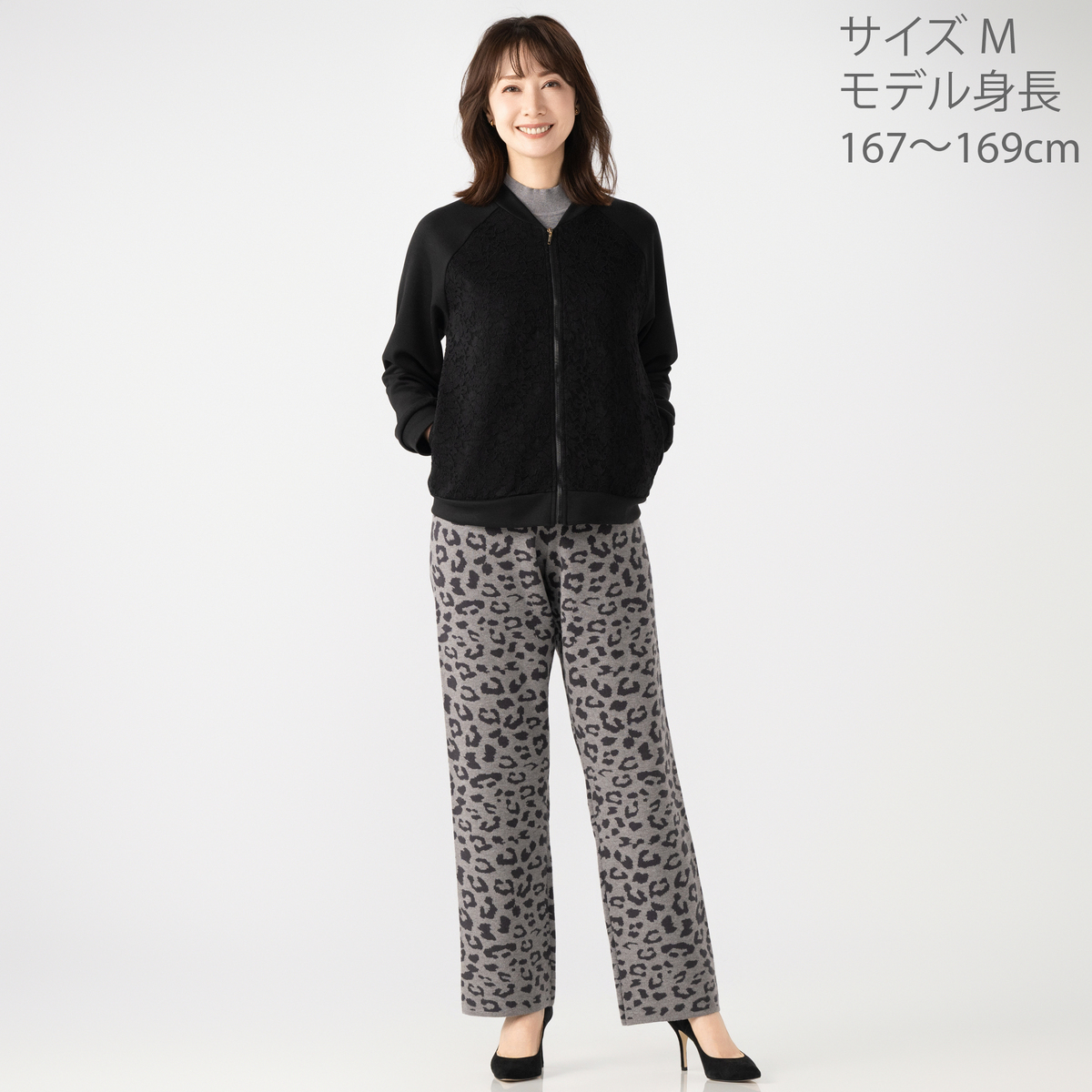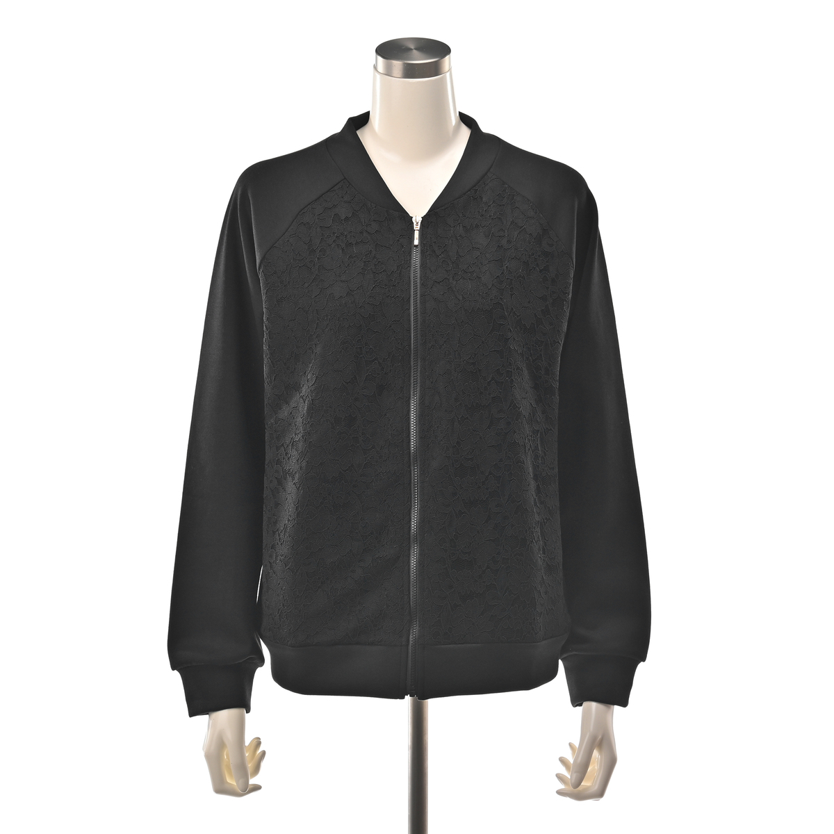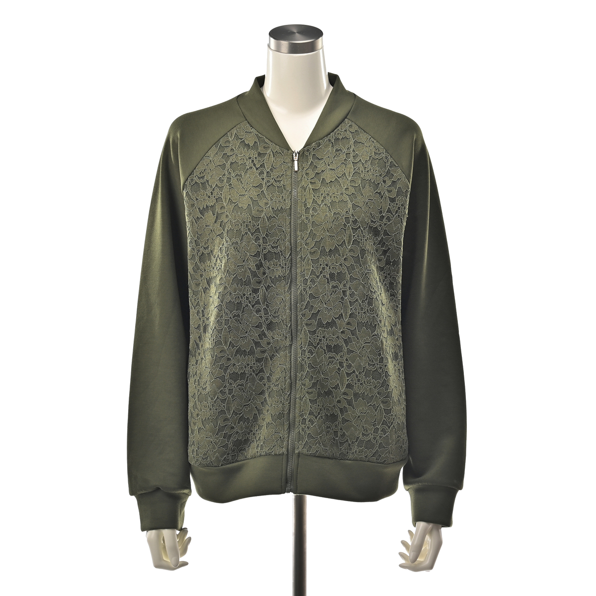 モチっとしたダンボールカットソーで仕立てたブルゾン。前身頃にボタニカル柄のストレッチラッセルレースを重ね、華やかに仕上げました。レースは本体と同色なのでコーディネートしやすく、着回しに活躍してくれます
