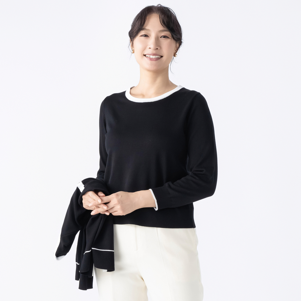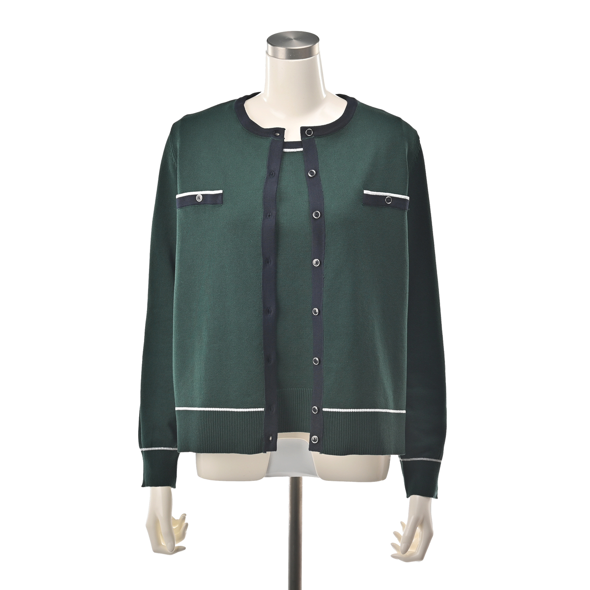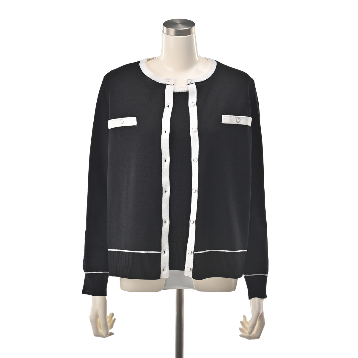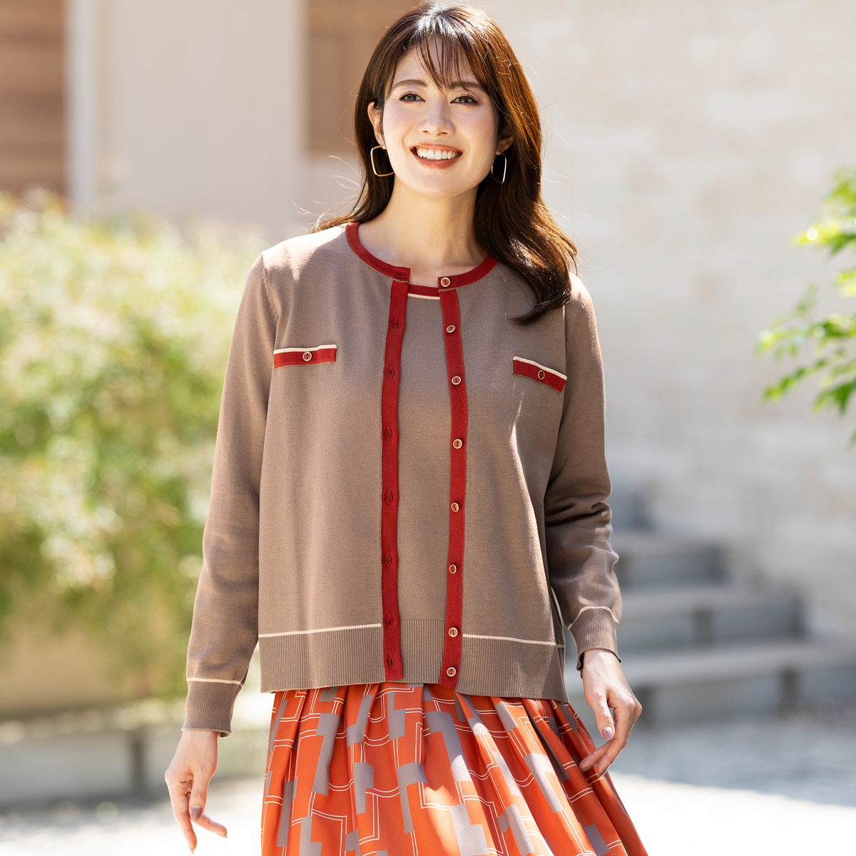 きれいな艶感できちんと感のあるニットアンサンブル。大人の配色ラインがデザインのアクセントになっています。細い配色部分にラメ糸を使いながらも、インナー衿ぐりの内側にはラメ糸が出ない仕様に。上質感のある素材でなめらかな肌触りが、心地良い着用感をもたらします