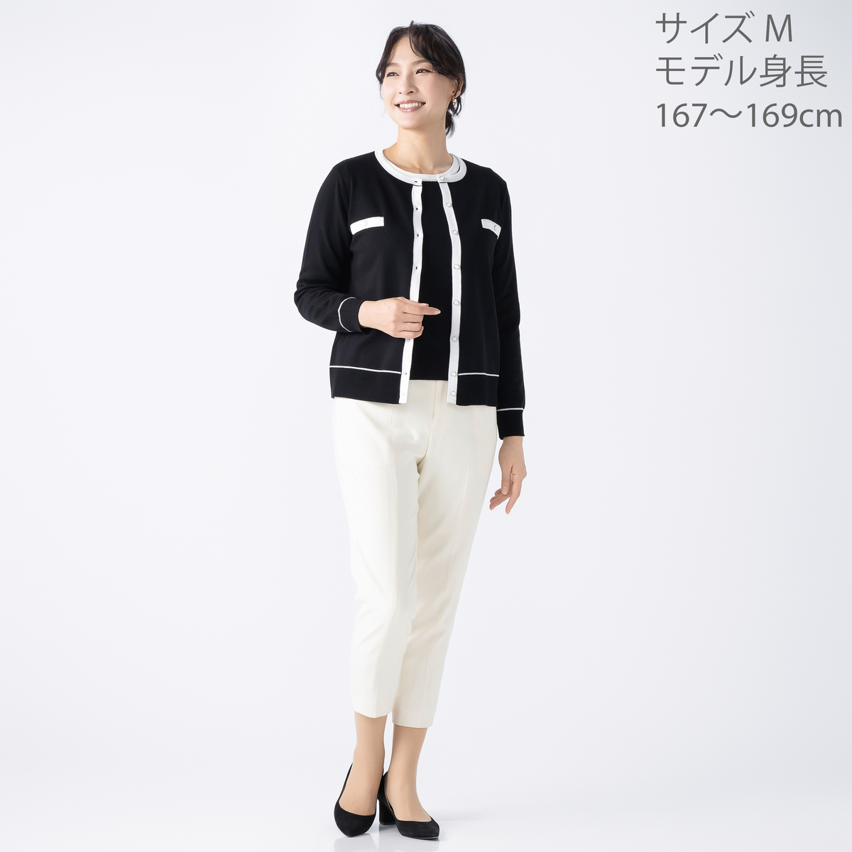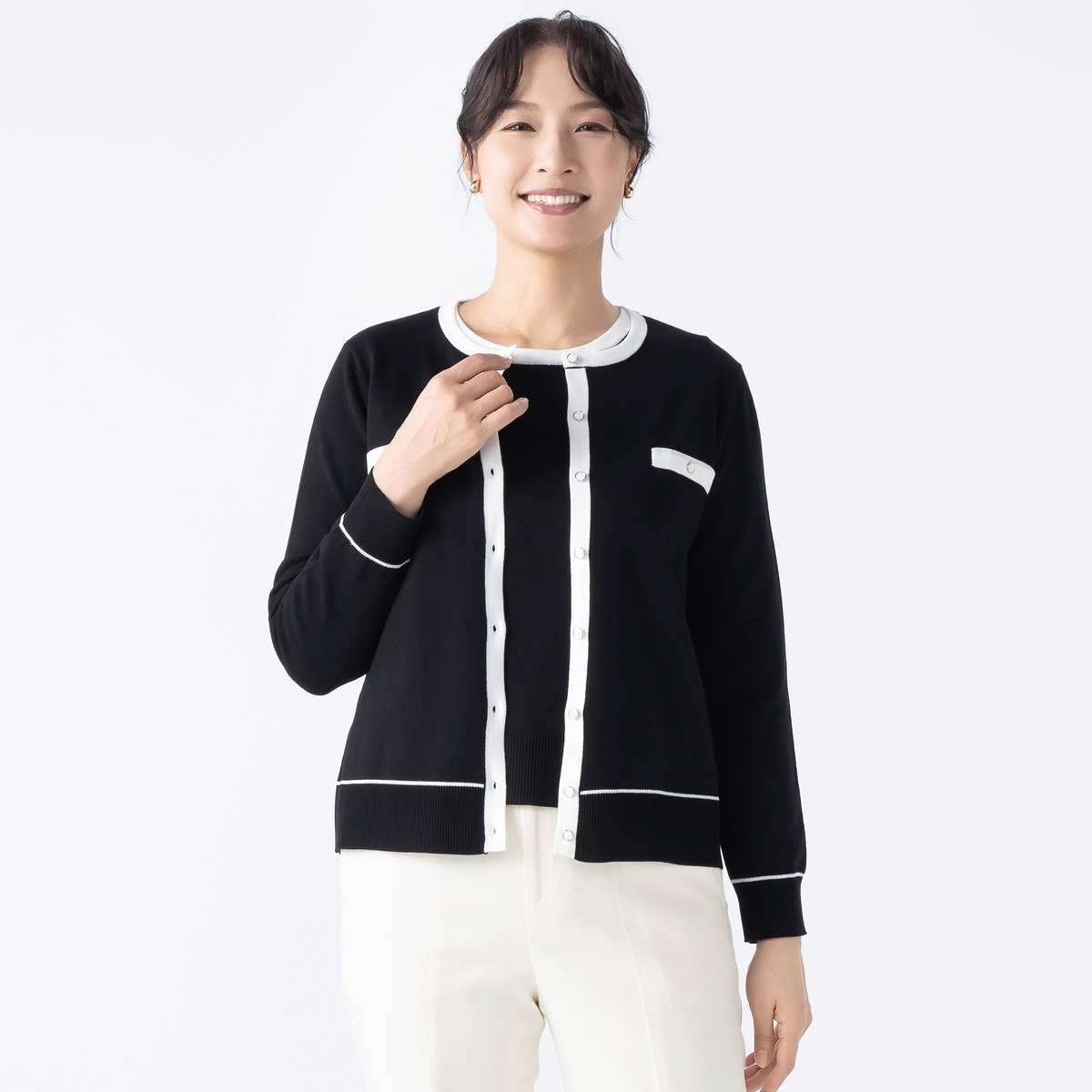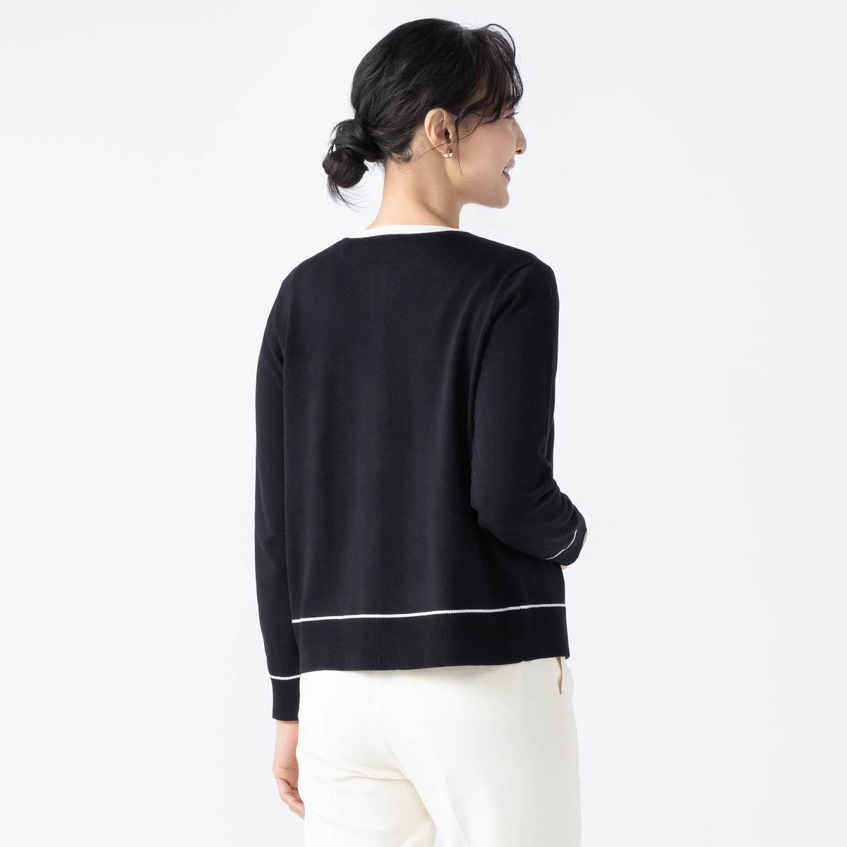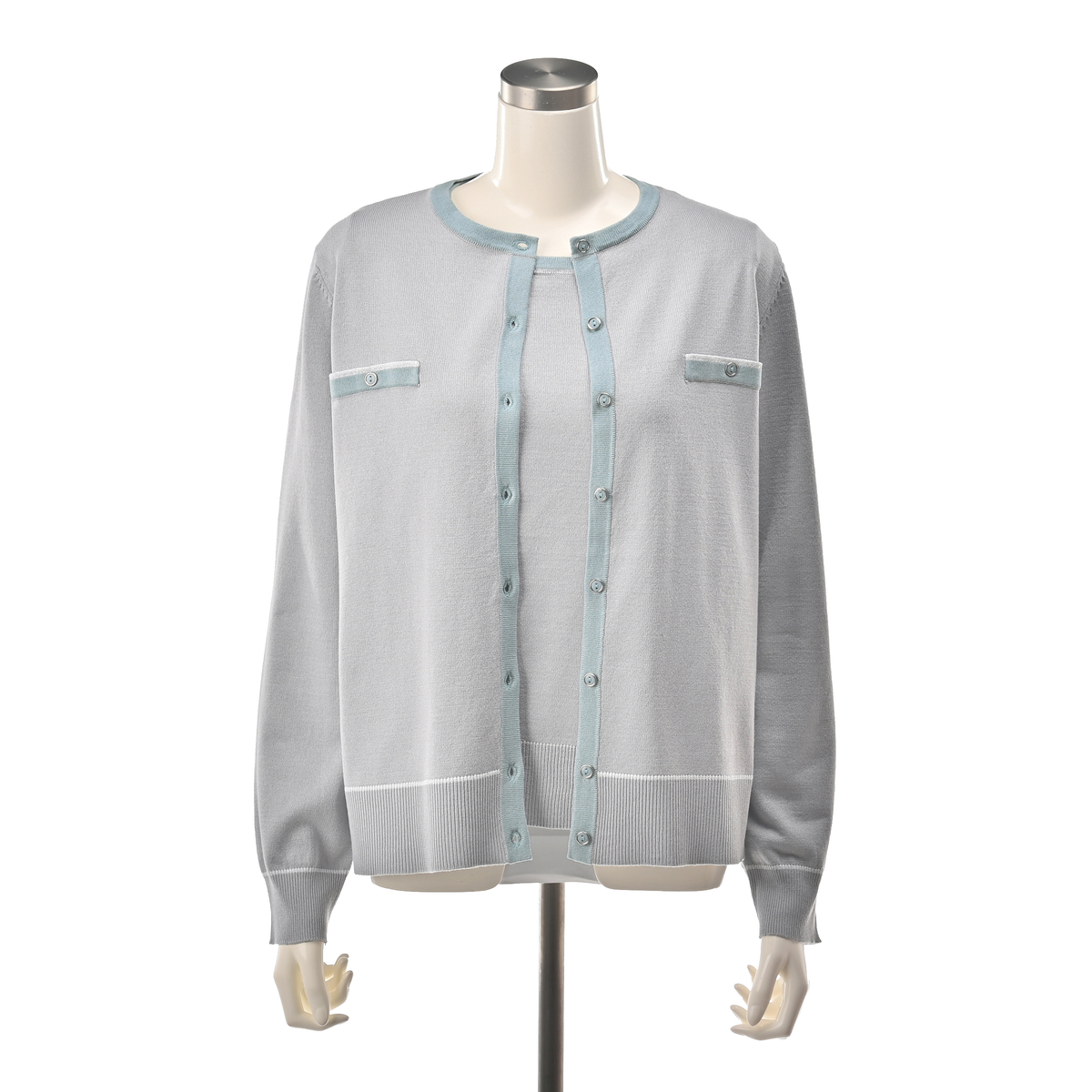 きれいな艶感できちんと感のあるニットアンサンブル。大人の配色ラインがデザインのアクセントになっています。細い配色部分にラメ糸を使いながらも、インナー衿ぐりの内側にはラメ糸が出ない仕様に。上質感のある素材でなめらかな肌触りが、心地良い着用感をもたらします
