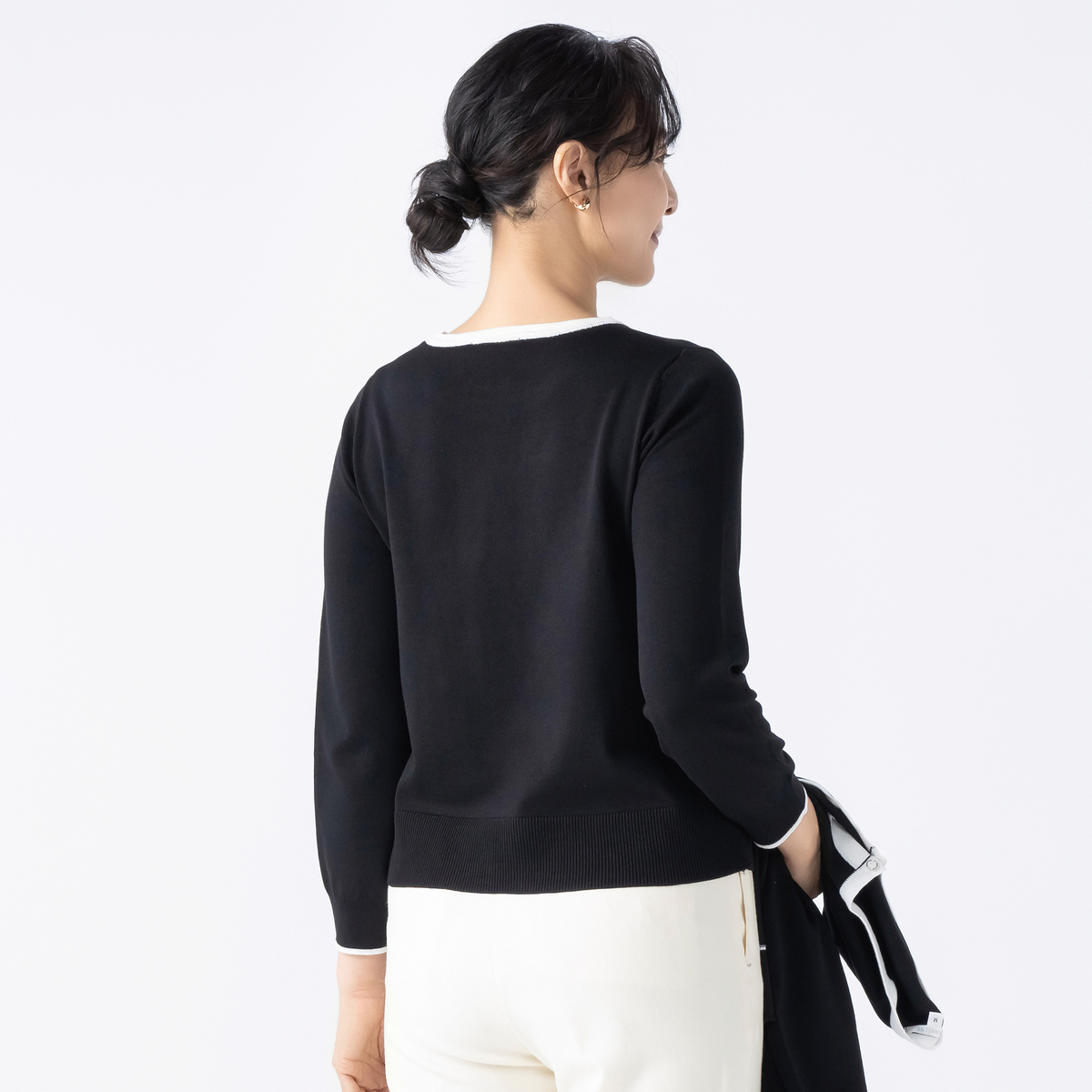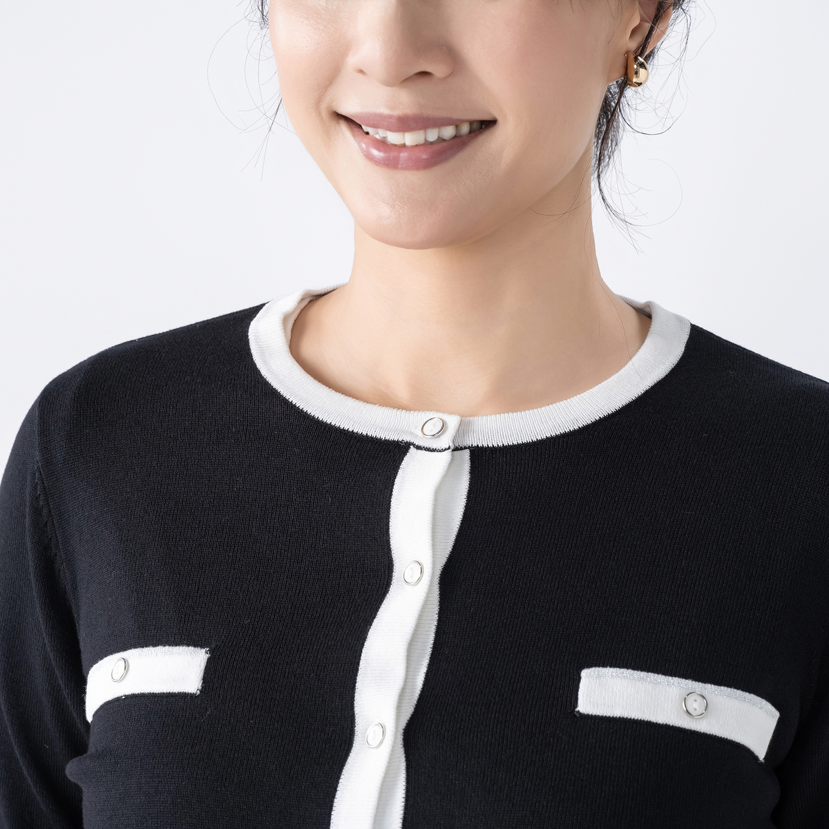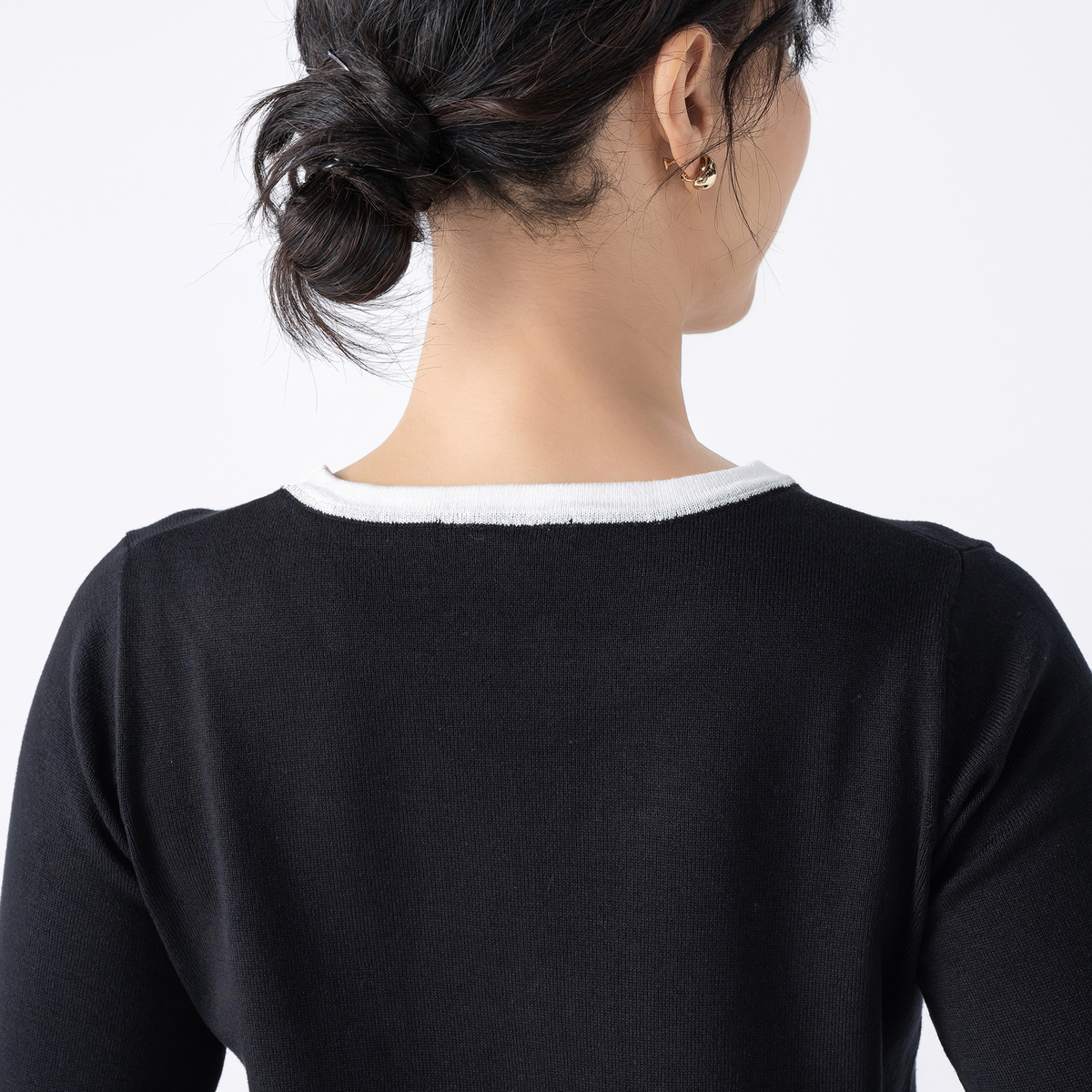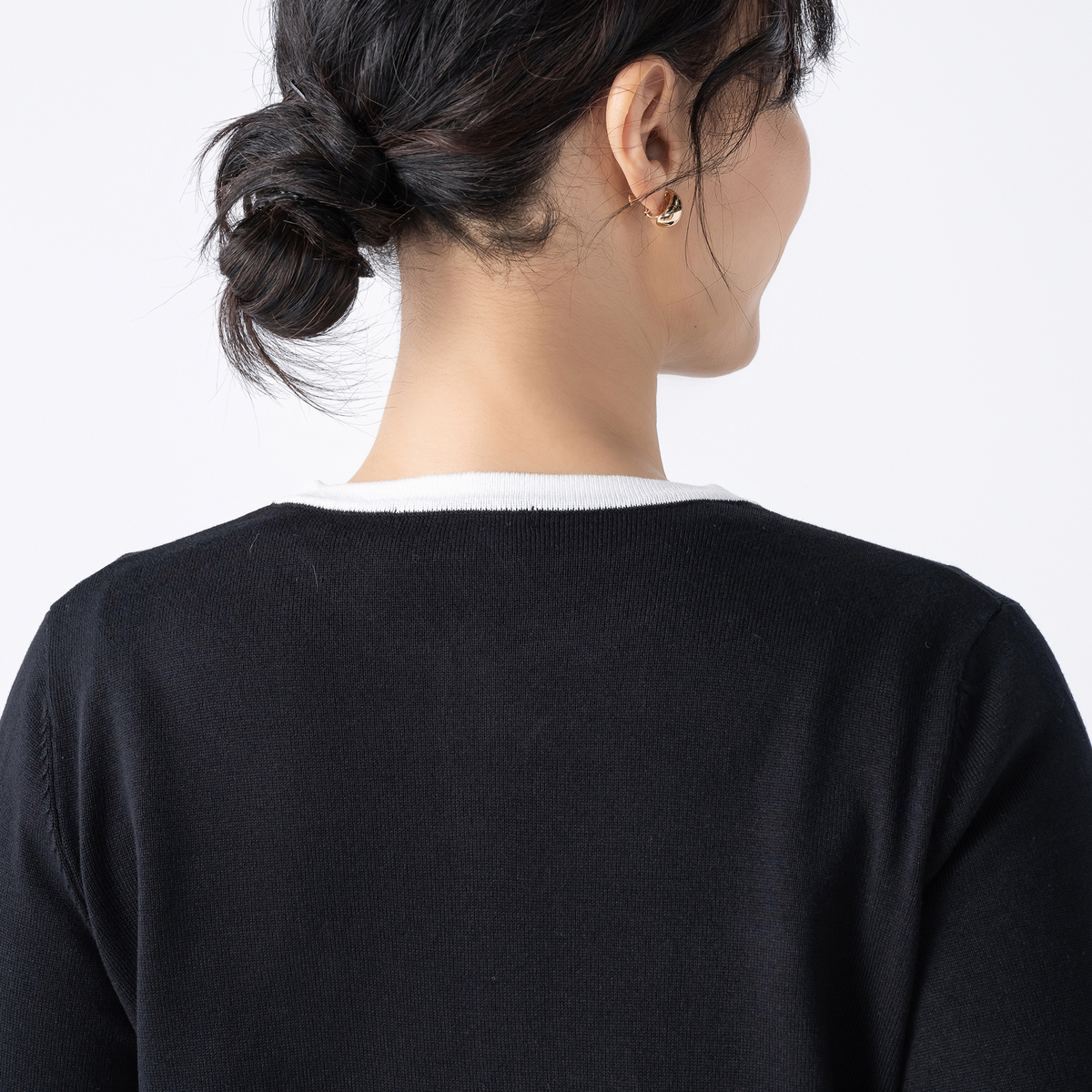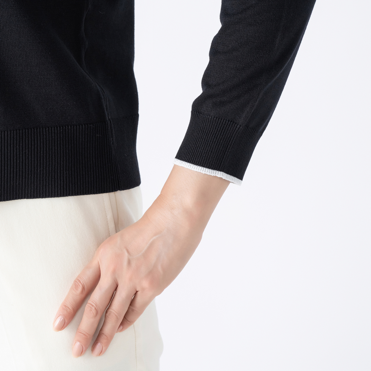 きれいな艶感できちんと感のあるニットアンサンブル。大人の配色ラインがデザインのアクセントになっています。細い配色部分にラメ糸を使いながらも、インナー衿ぐりの内側にはラメ糸が出ない仕様に。上質感のある素材でなめらかな肌触りが、心地良い着用感をもたらします