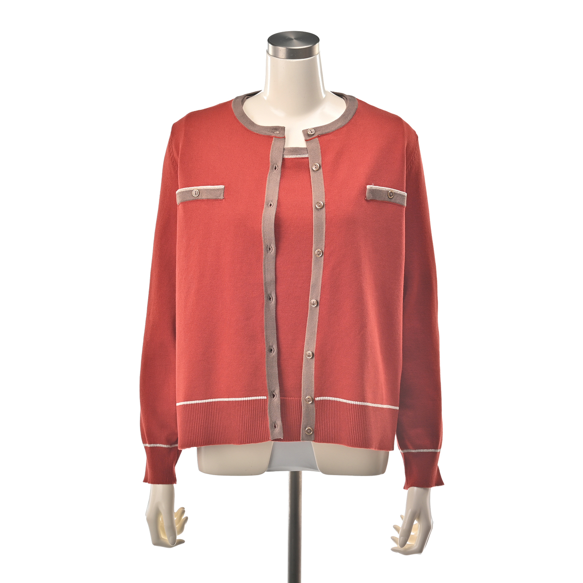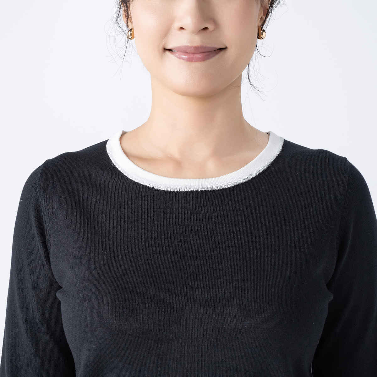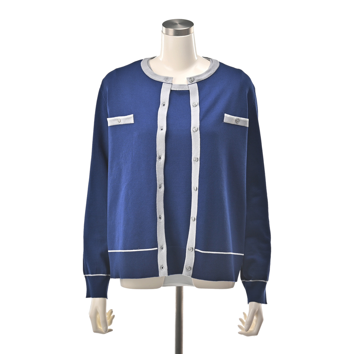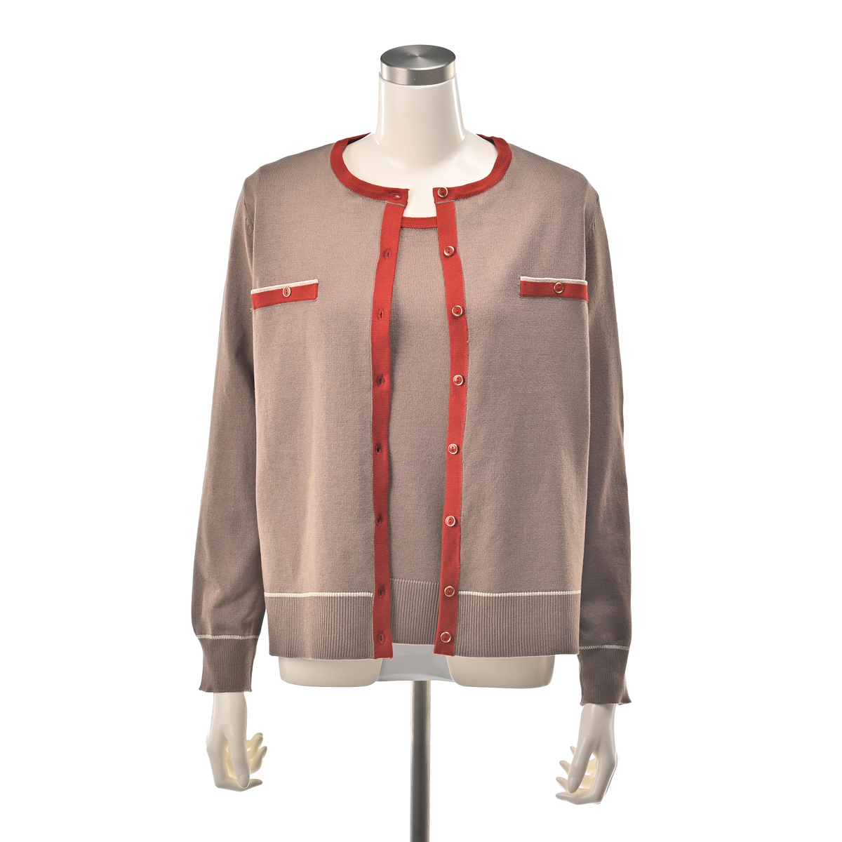 きれいな艶感できちんと感のあるニットアンサンブル。大人の配色ラインがデザインのアクセントになっています。細い配色部分にラメ糸を使いながらも、インナー衿ぐりの内側にはラメ糸が出ない仕様に。上質感のある素材でなめらかな肌触りが、心地良い着用感をもたらします